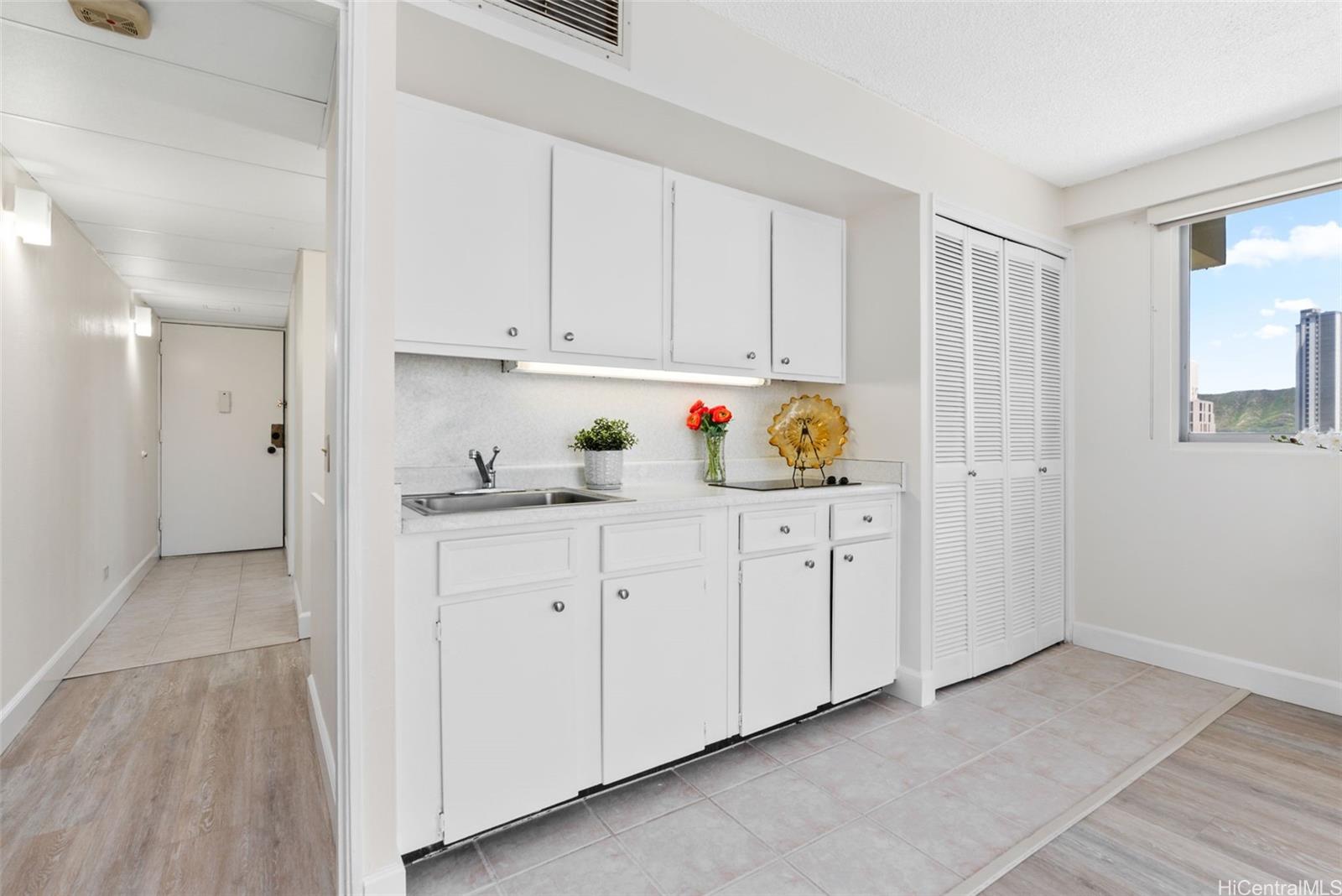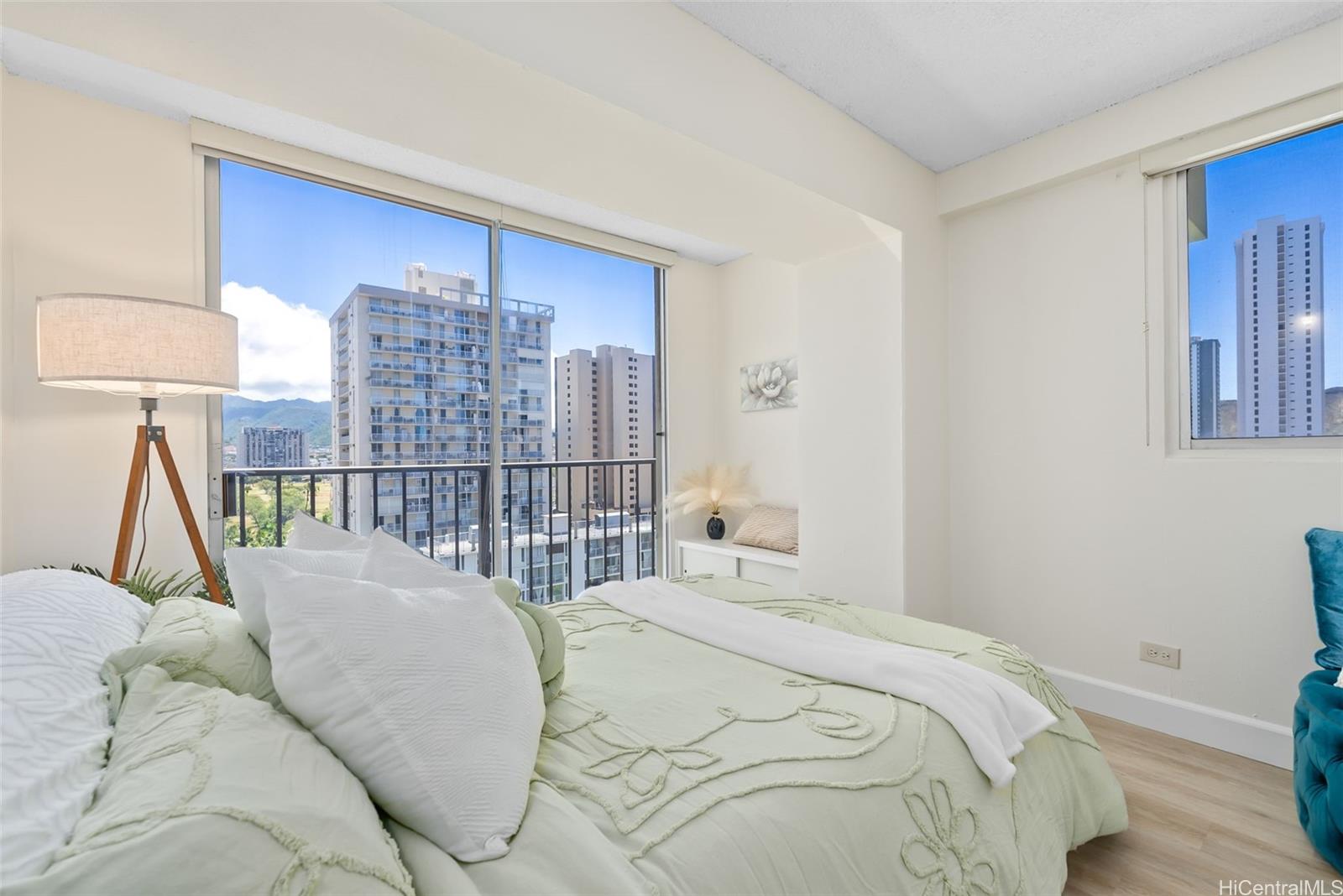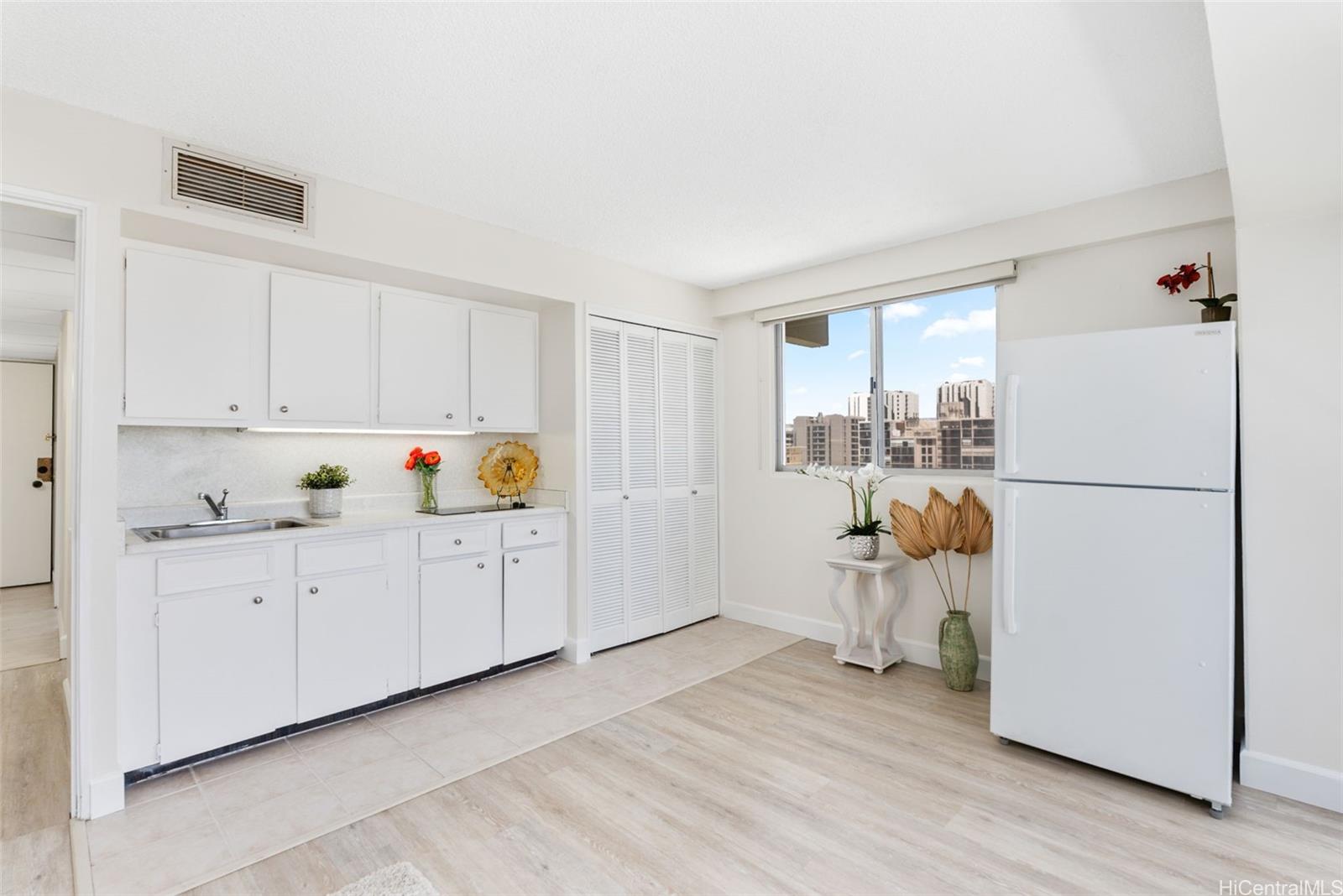 Peaceful Waikiki Gem! Looking to be in the heart of Waikiki without the noise? Priced well below tax assessed value! True value! Come visit this turn-key, upgraded, high-floor corner unit! Waikiki Park Heights is a well-maintained building set slightly back from Kuhio Avenue and offers a calm, more private lifestyle. This spacious 1-bedroom unit features central A/C , separate toilet closet, and a kitchenette and ELECTRICITY and more are included in the monthly HOA fees. Recent upgrades include brand new LVP flooring, new refrigerator, fresh interior paint, a soaking tub, and a recently modernized A/C coil system. The covered lanai provides breezy indoor-outdoor living with great natural light. Enjoy access to Waikiki Beach, International Market Place, world-class dining, Kapiolani Park, and the bus line. Amenities include a sparkling onsite pool, community laundry, lounge areas, secured entry, new elevators, onsite resident manager, and the iconic Hy’s Steakhouse right downstairs.
