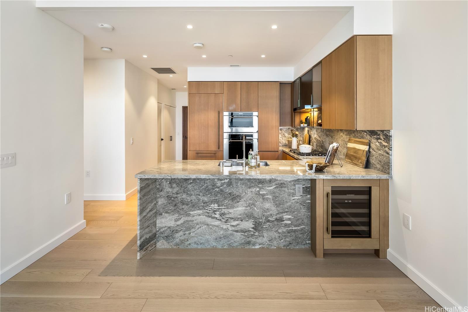 Gorgeous Grand Penthouse 4007 at front-row Victoria Place is high above the rest, with stunning, extra-tall ceilings and glass clerestory windows opening up sea and sky views. There is nothing else like this very top floor! Because of the height, you see over many of the other buildings downtown to the beautiful Waianae Mountains in the distance. Never-lived-in, PH4007 is in truly pristine condition. Brand new cabinetry and hardwood floors are of the highest quality. The bathroom is luxurious with fine stonework and plenty of storage. Amenities at Victoria Place are like a deluxe resort with three pools, hot and cold plunge pools and saunas in both men's and women's spa areas. Elegant party spaces include one with a private pool for your guests at parties. Don't miss this chance for penthouse living at a reasonable price in a very spacious one-bedroom suite.