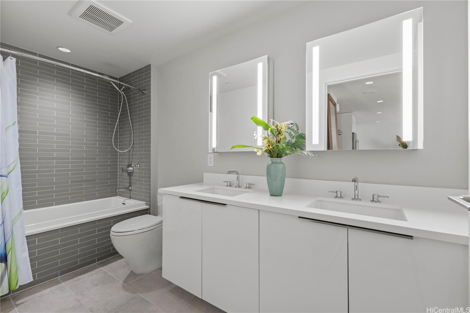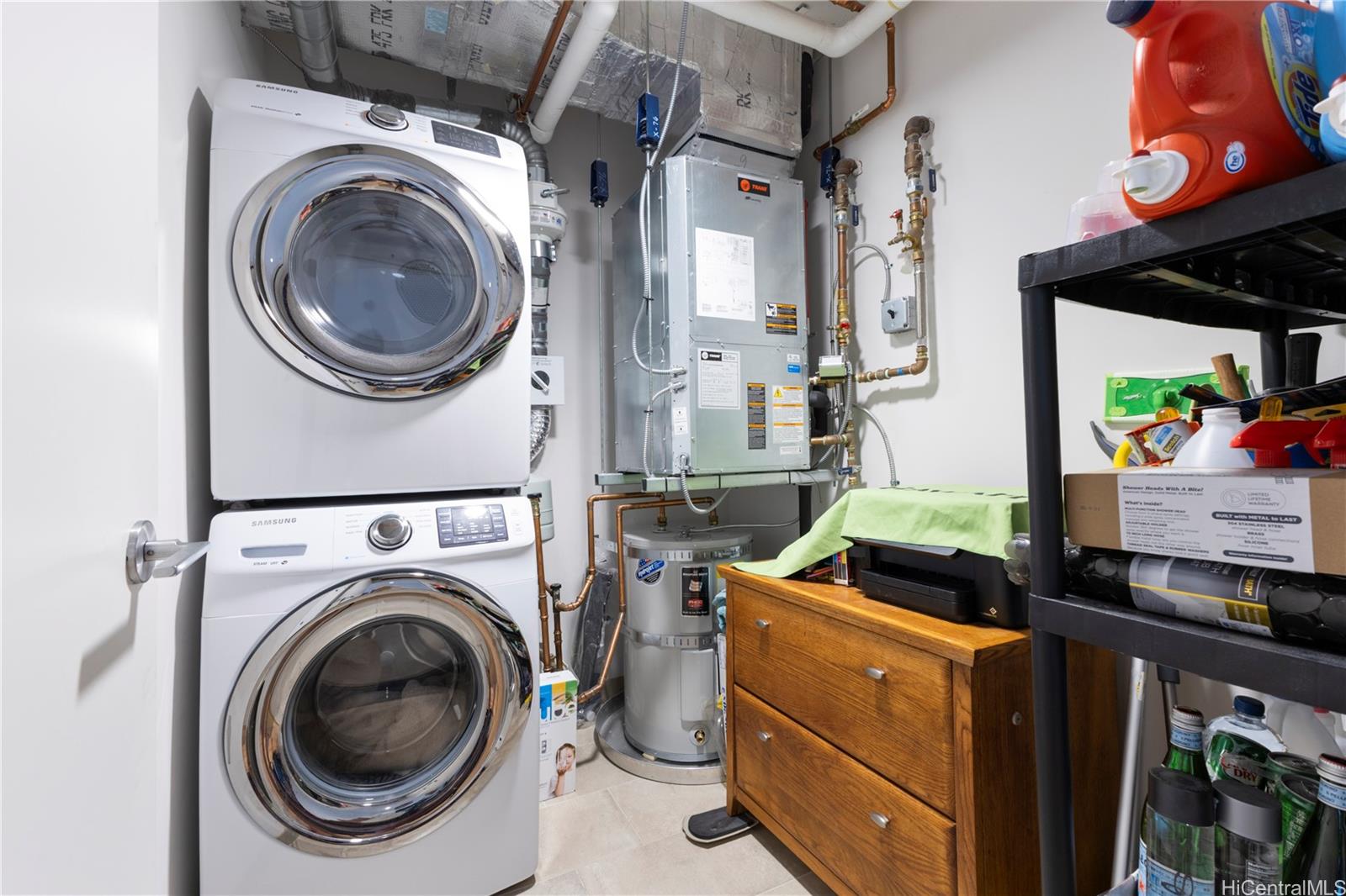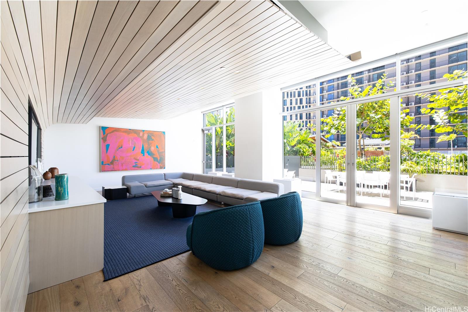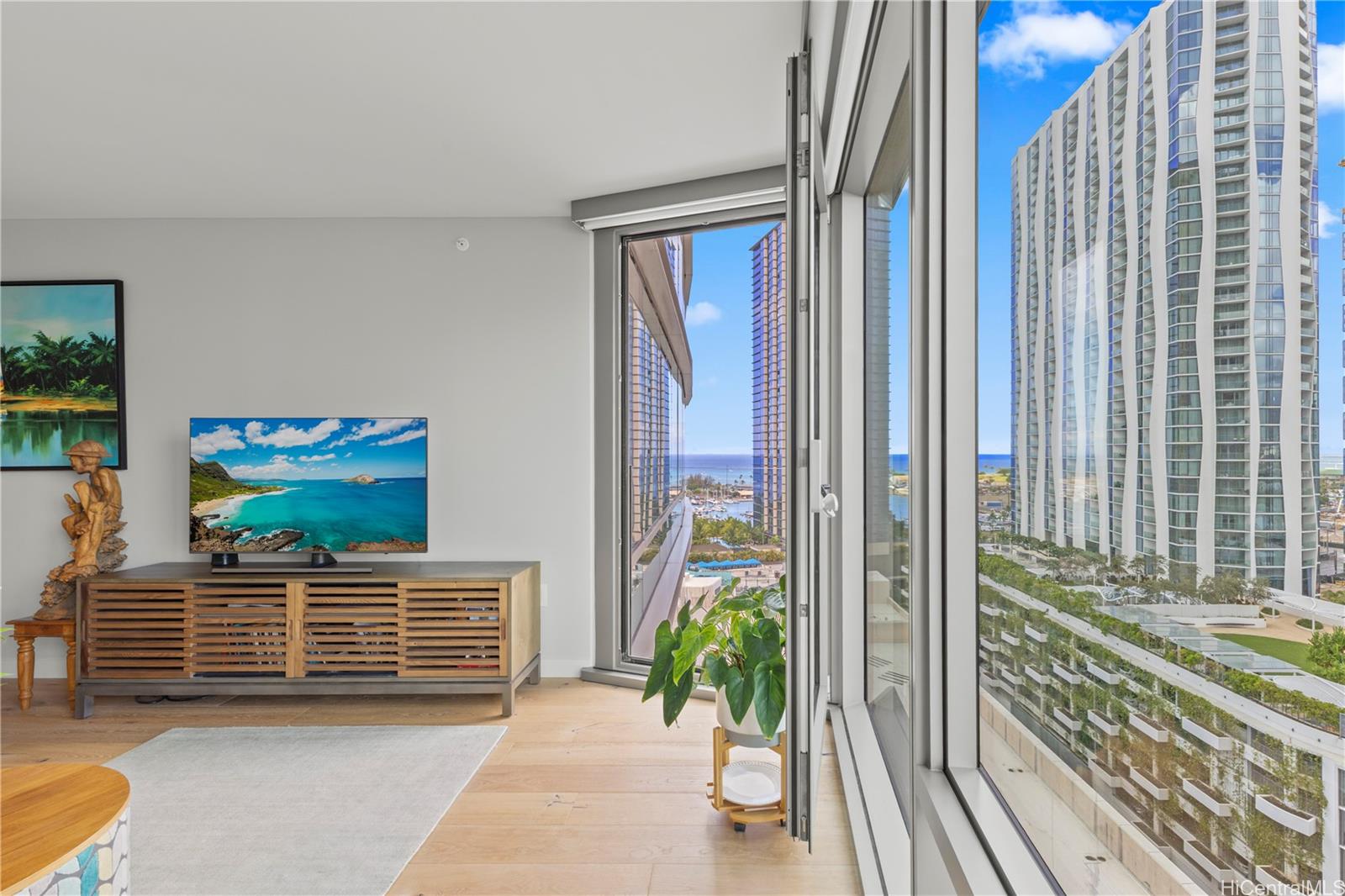 Excellent 1/1 home at Ae'o with ocean, harbor and mountain views! At 739sf, this is the largest 1/1 offered at the lowest price/sf. This must-see unit has premium Bosch stainless steel appliances, spacious bathroom with deep soaking tub, custom built-ins in kitchen and walk-in closet, engineered hardwood floors, floor-to-ceiling windows and bump out window/door for fresh air. Unit also comes with a full size W/D in the extra utility room and one parking stall with a separate storage unit. Resort-like amenities include a 24/7 hosted front desk, rooftop terrace, lap and family pool, fitness center, locker rooms with sauna and steam room, theater, play ground, guest suites, outdoor bbq, dining cabanas. This Ward Village condo features the best of urban lifestyle in paradise with direct access to Whole Foods market, numerous dining and entertainment options, beaches, shopping, Consolidated Theaters, Ala Moana Shopping Center all within a few blocks!