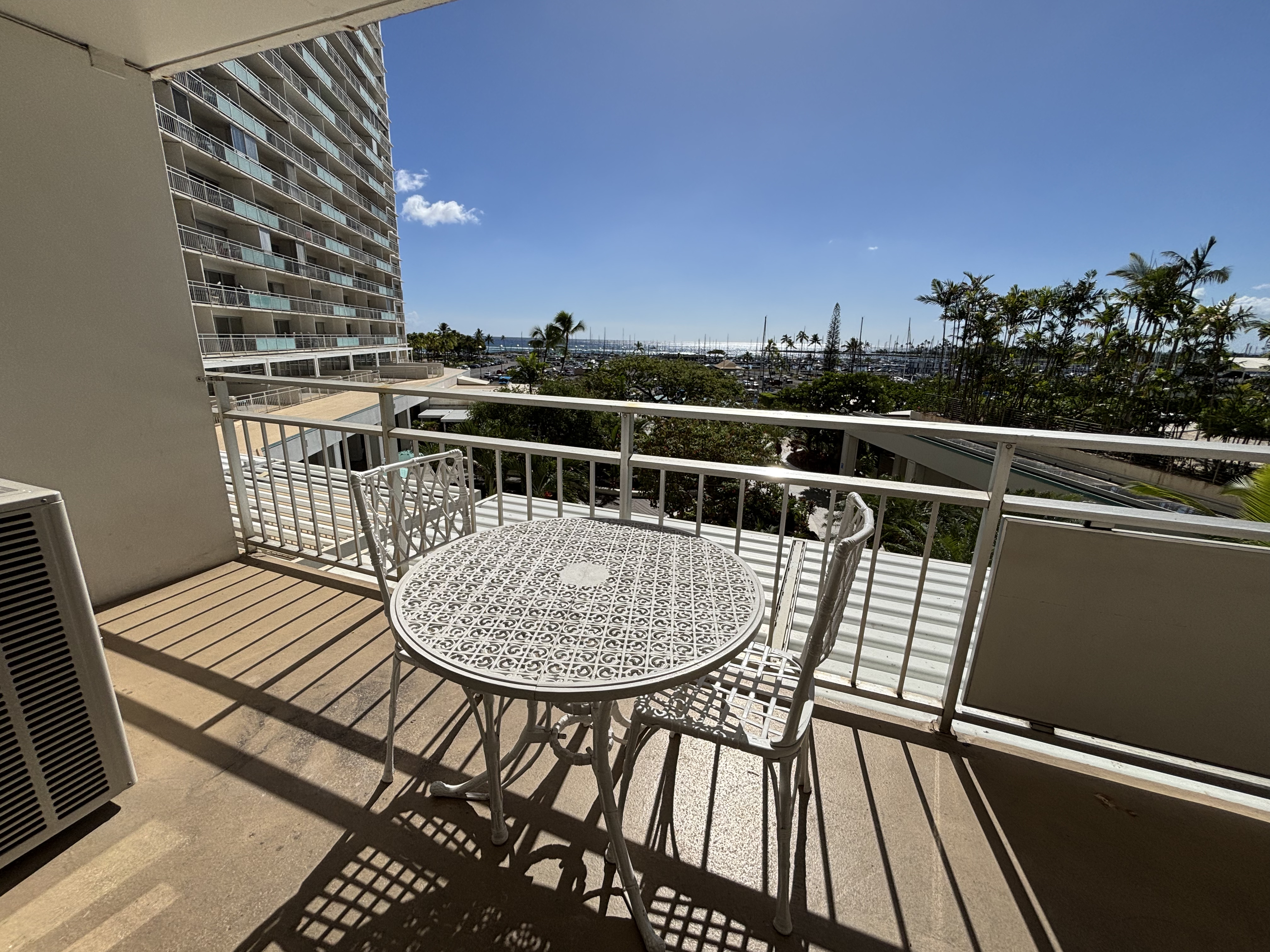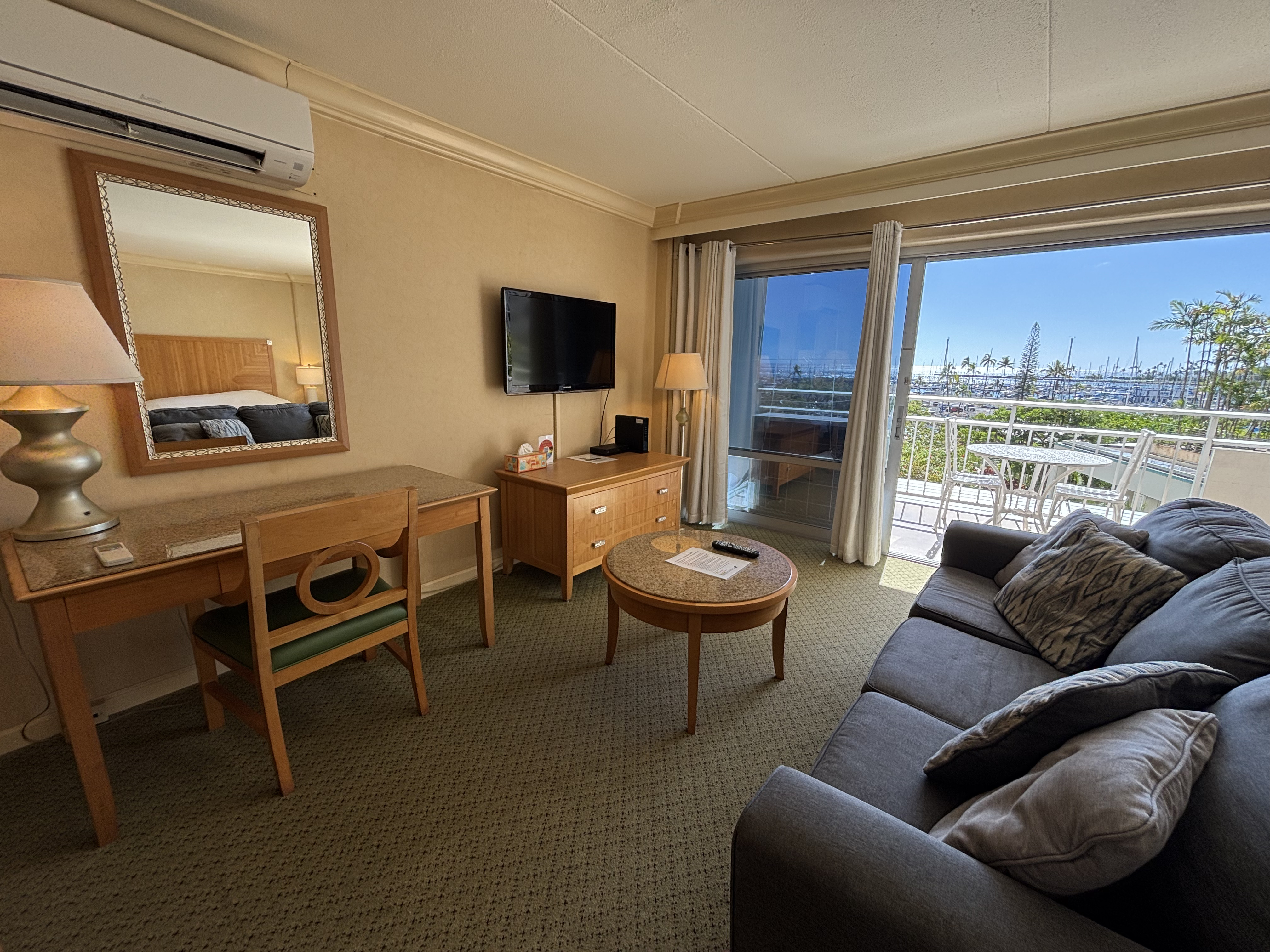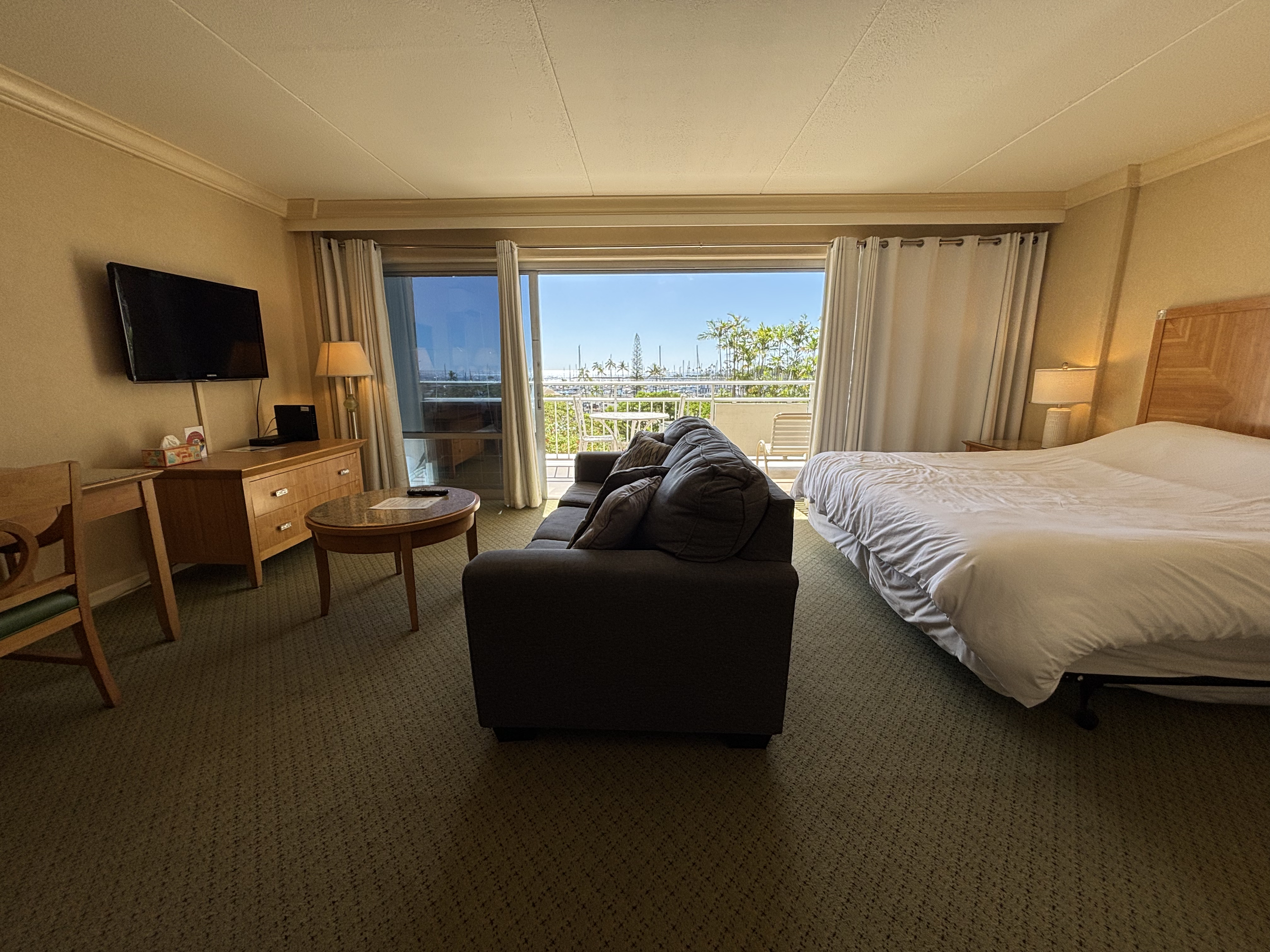 広々としたスタジオタイプ。素晴らしいオーシャン&ハーバービュー。ベッドルーム1室、バスルーム1室、広々としたラナイ付き。