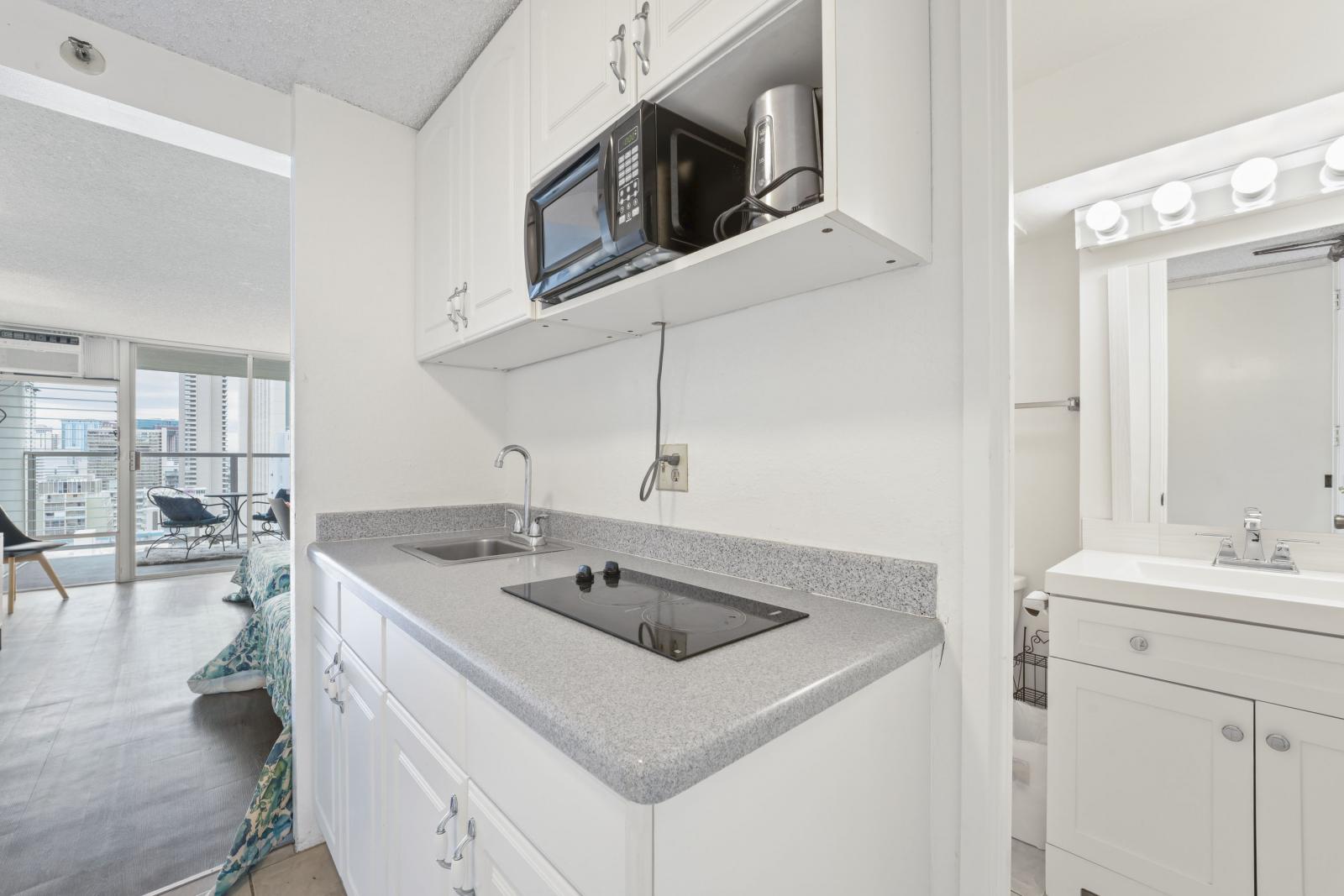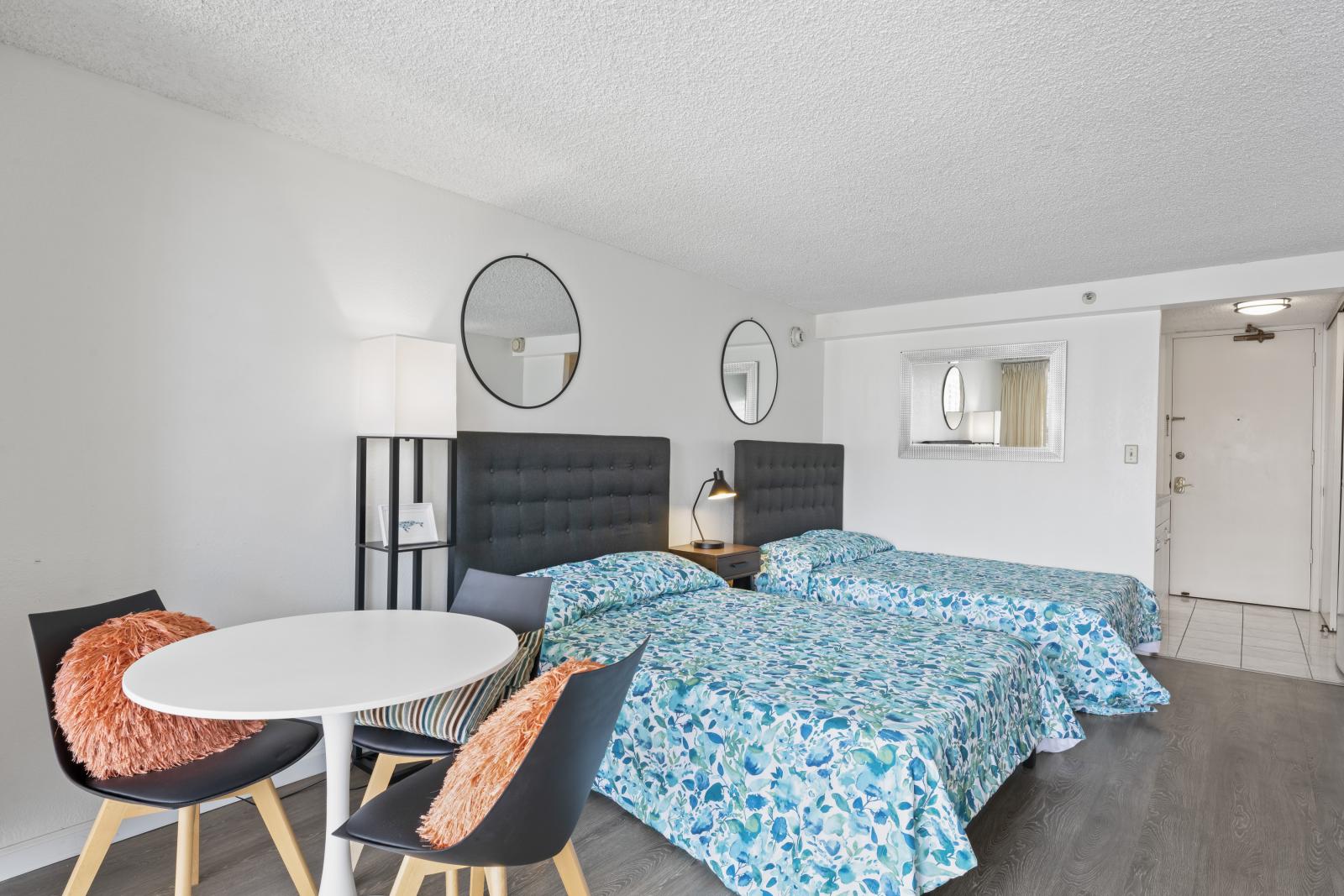 アイランドコロニーの家具付きスタジオ/バスルーム1室。ラミネート床、タイル床、家具付き。設備:プール、BBQエリア、洗濯施設、フィットネスセンター(フィットネスセンター利用は別途料金)。24時間警備付きセキュリティビル。駐車場は含まれませんが、プロパーク経由で利用可能。家賃にケーブルテレビ、インターネット、水道代が含まれます。電気代およびその他光熱費は入居者負担。禁煙・ペット不可。申込手数料と信用調査が必要です。