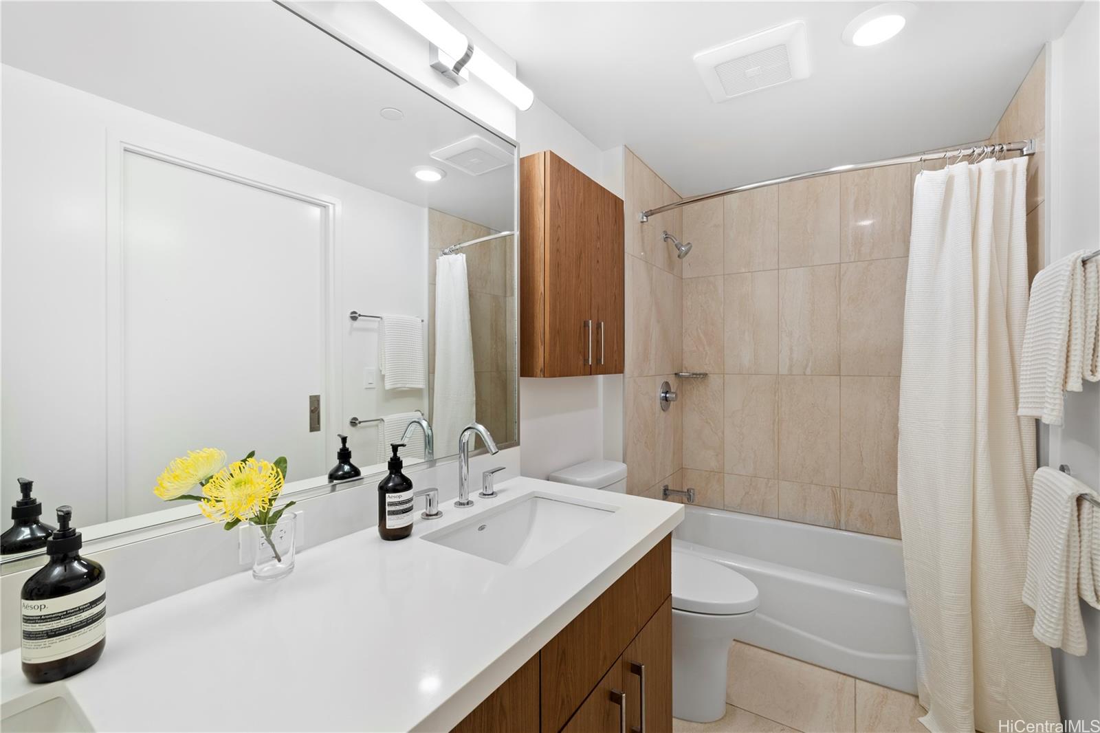 Resort-style amenities include a fitness center, pool, BBQ cabanas, club lounge with full kitchen, 4 guest suites, theater, and dog park. Just steps from Ala Moana Shopping Center, Ala Moana Beach Park, restaurants, grocery shopping and Sam’s Club. This home blends urban convenience with modern comfort.