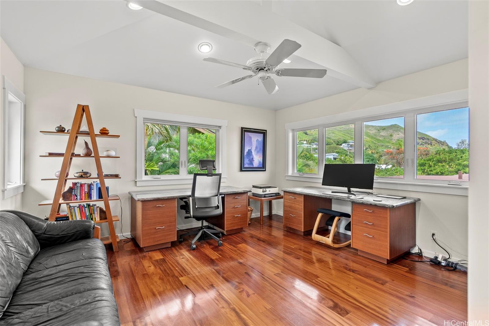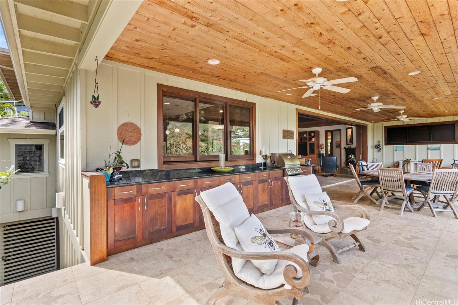 Priced below market! Nestled on a hillside cul-de-sac in the quiet end of Lanikai, this move-in ready, architect-designed, custom-built home offers a perfect blend of luxury & tranquility. Built new in 2011, it features seamless indoor/outdoor flow. The gourmet kitchen includes Thermador appliances & abundant custom Pyinkado cabinets. Custom mahogany sliders in the great room open 24' to a spacious covered lanai, creating a treehouse feel w/lush surroundings & gentle tradewinds. Travertine floors run seamlessly from the main level out onto the lanai, while the 2nd level showcases stunning Tigerwood floors. Upstairs features a primary suite w/ensuite bath, large walk-in closet & private lanai w/ocean & Mokulua Island views. A 2nd bedroom on this level w/a full bath can make a perfect office. The lower level, built new in 2020, consists of an expansive L-shaped rec room w/a wet bar, full bath, & a lanai w/steps leading to a terraced backyard filled w/plumeria, citrus, avocado, and banana trees. Eco-friendly features include 44 owned solar panels, an EV plug & a backup battery system. A short walk to Lanikai Beach, this home offers privacy, comfort & an unparalleled lifestyle.