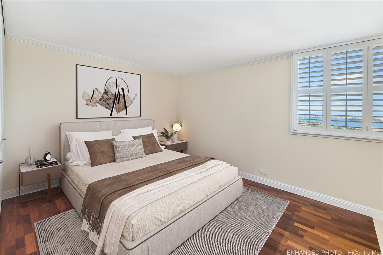 Say aloha to your new home in paradise! This beautifully updated two-bedroom, two-bathroom condominium offers an incredible opportunity to enjoy breathtaking panoramic views of Pearl Harbor and sparkling water from your private lanai. Relax in the open, airy layout, perfect for unwinding or hosting family and friends. The rich Australian Eucalyptus hardwood floors create a warm and inviting atmosphere throughout. The chef-inspired kitchen features top-of-the-line appliances, including a Bosch stove, microwave, built-in dishwasher, and Sub-Zero refrigerator, all beautifully complemented by elegant marble countertops. For your convenience, a Miele front-loader washer and dryer are included, as well as California closets and Hunter Douglas electric shades that offer a touch of sophistication and ease.