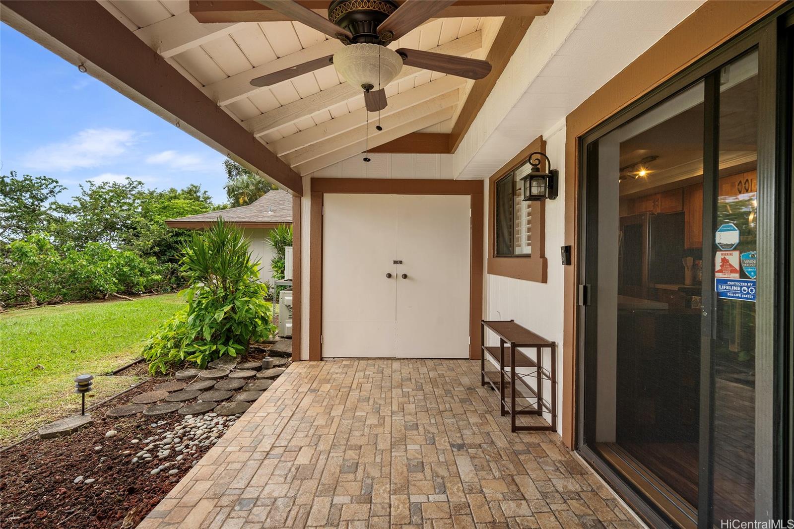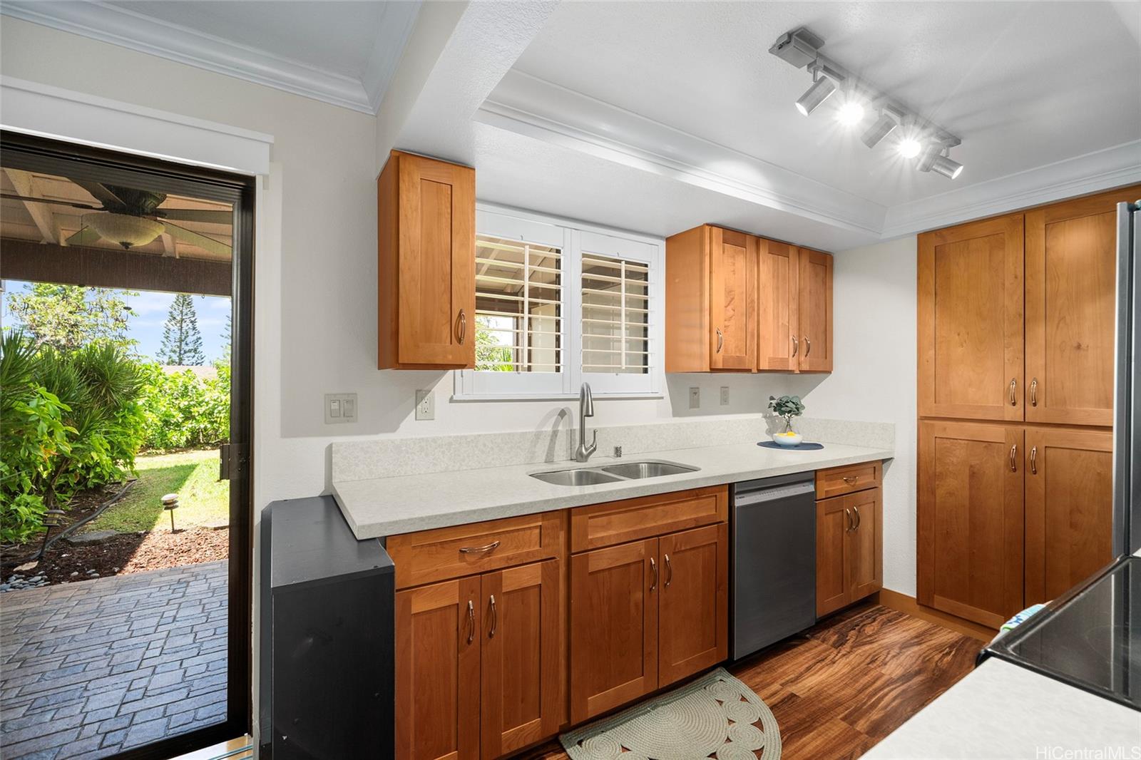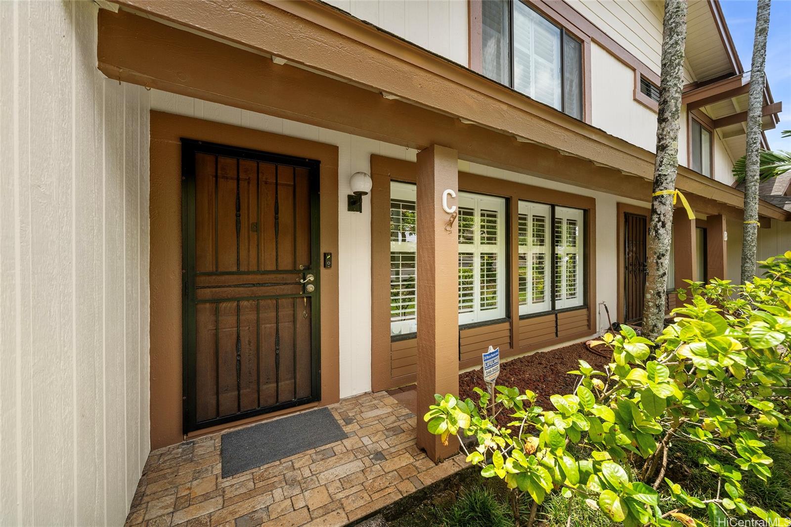 Imagine waking up to views of Pearl Harbor and the majestic ocean beyond. This beautifully updated and spacious townhome features luxurious koa aesthetic laminate flooring, plantation shutters for an island touch, as well as a modern kitchen complete with shaker-style cabinets and quartz countertops. The interior has been recently repainted and features smooth refinished ceilings (no more popcorn), as well as doors with engraved wood frames and etched glass inserts that add a touch of whimsy and sophistication. There's more! Closet Systems and ceiling fans in every bedroom, newer dishwasher, washer, dryer, full-sized garage, large open patio, yard space, visitor and street parking and fantastic amenities are more great reasons not to let this one get away! Property to be conveyed "As Is."