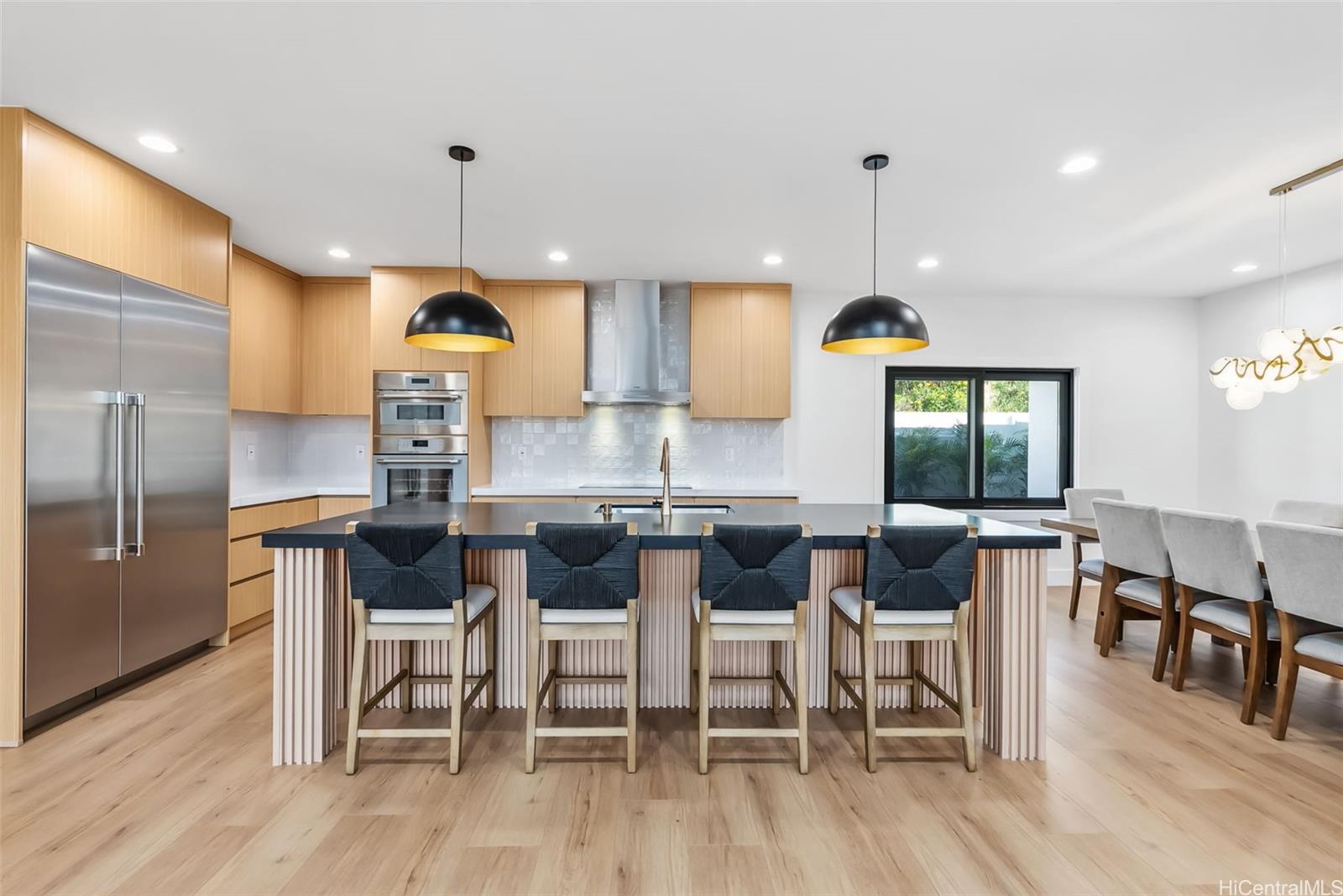 マウナオル・エステーツのゲートコミュニティにある、ラグジュアリーでモダンな隠れ家。2エーカーを超える敷地から、息を呑むような海と山の景色をお楽しみください。息を呑むようなマカハ渓谷を背景に佇む、この素晴らしい特注住宅で、究極のモダンラグジュアリーをご体験ください。広々としたオープンコンセプトの住宅は、高い天井、大きな窓、そしてたっぷりの自然光を備え、優雅さと快適さを追求して設計されています。シェフの夢であるキッチンには、特注のウォークインパントリー、高級家電(サーモドア)、特注キャビネット、そして大きなアイランドがあり、カジュアルな食事にも、おもてなしにも最適です。メインスイートには、モダンな設備と上品な仕上げが施されたスパ風のバスルームがあります。特大のスライドドアを開けると、プライベートな裏庭のオアシスへと続きます。手入れの行き届いたプール、緑豊かなランドスケープ、そして2面のピックルボールコートは、おもてなしや静かな環境への寛ぎに最適です。美しくデザインされた屋外ラウンジエリアとパティオは、星空の下での食事や朝のコーヒーに最適です。この家は建築の傑作であり、贅沢さ、プライバシー、そして自然の美しさが完璧に融合しています。この比類なき楽園をぜひご自身で体験してください!