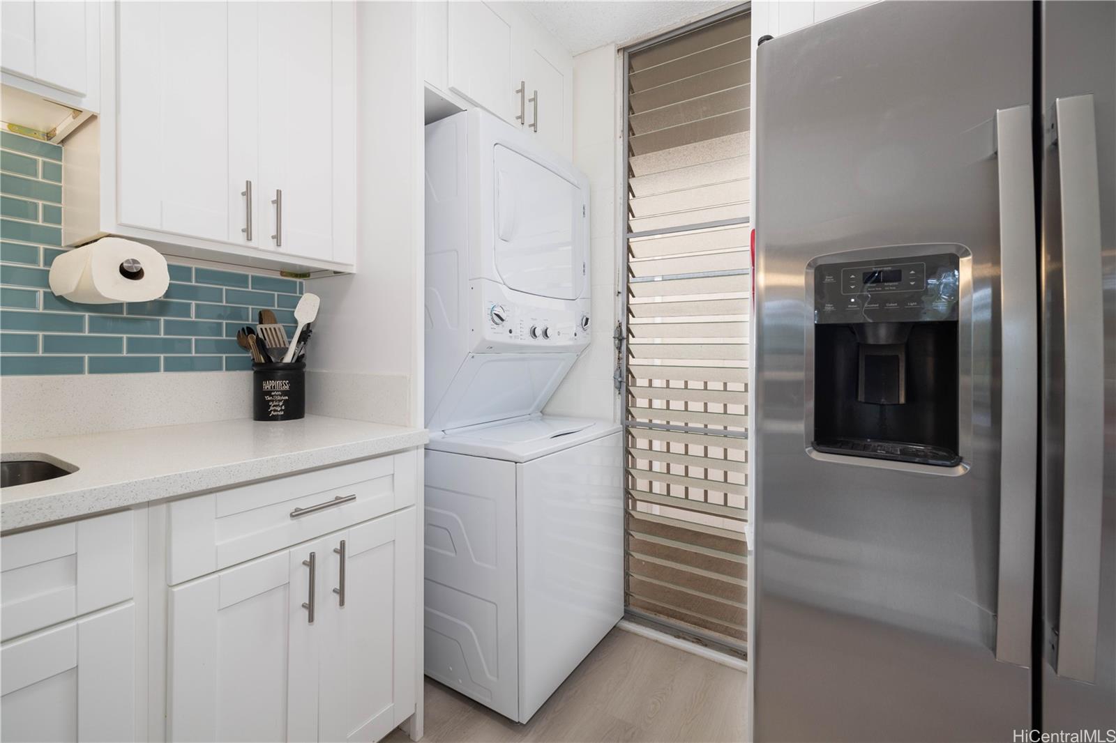 Stunningly Remodeled in 2023, Top-Floor, Corner Unit, No Stairs or Elevator Needed! Welcome to this three-bedroom, two-bathroom corner unit, with two assigned parking stalls. This home has been upgraded with high-end finishes, offering the perfect blend of style, comfort, & functionality. As you enter, you'll be greeted by the sleek stainless steel appliances & quartz countertops in the kitchen. The under-mount sinks & premium hardware throughout the kitchen & bathrooms highlight the meticulous attention to detail that went into the renovation. The spacious bedrooms feature ample closet space for easy organization, while the bathrooms exude luxury with a walk-in shower in the primary bath & sophisticated finishes. For added convenience, this unit comes with an in-unit washer/dryer, making daily chores a breeze. Step outside to enjoy not one, but two separate lanais perfect for sipping your morning coffee as you listen to the peaceful stream below, or unwinding with a glass of wine while surrounded by natures tranquility. This meticulously designed unit is a true gem. Don't miss the opportunity to call it your new home!
