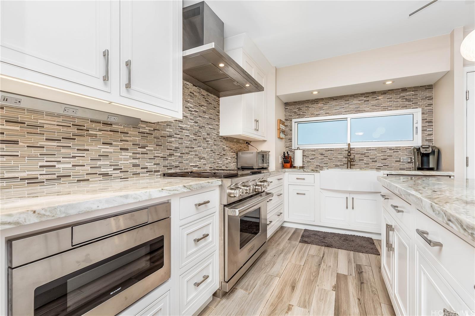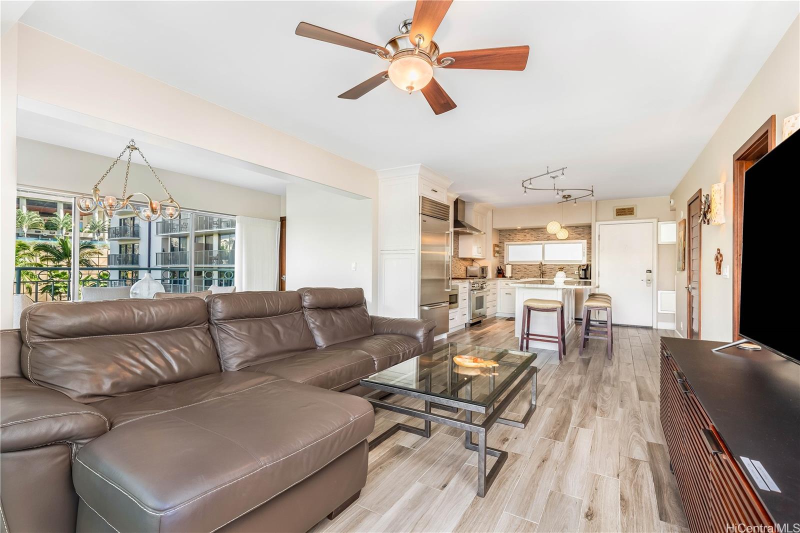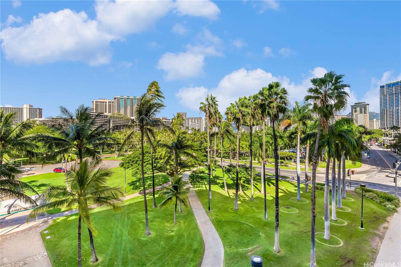 Fully furnished corner unit at well known the only beachfront condominium in Waikiki. Being fully remodeled in 2017, the unit is in excellent condition with updated and stylish kitchen and baths. Split A/Cs, microwave, oven, refrigerator, washer, dryer and motorized curtain are equipped. Open up all the windows and enjoy a wide open view of Fort DeRussy Park. With the new elevator installed in early 2023 and the lobby renovation completed in December 2023, the building has a fresh air. A second to the beach, popular take out restaurant Steak Shack on the ground floor and all the fun in walking distance.