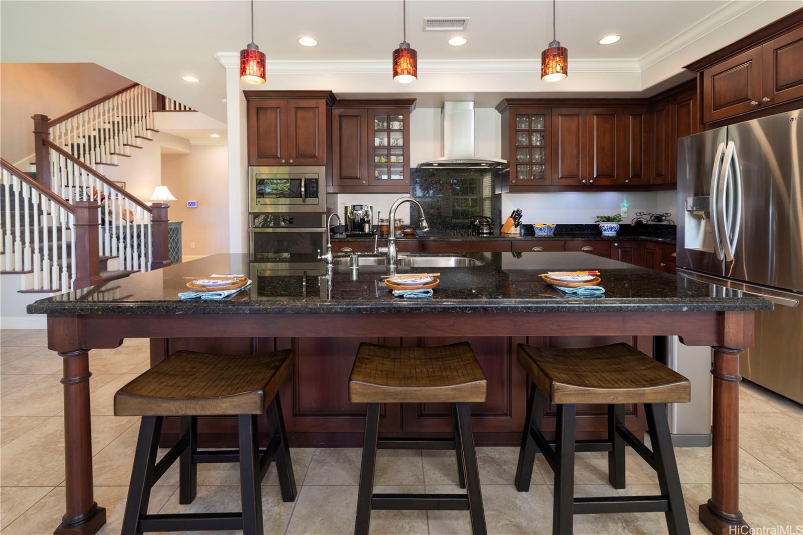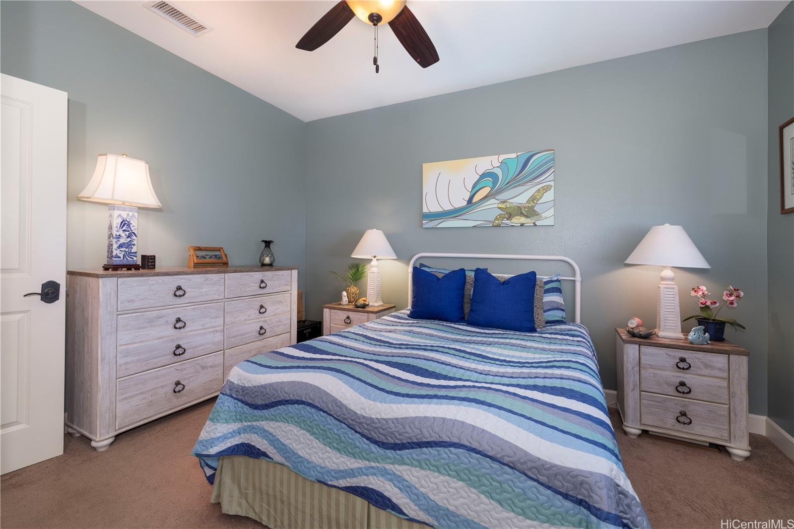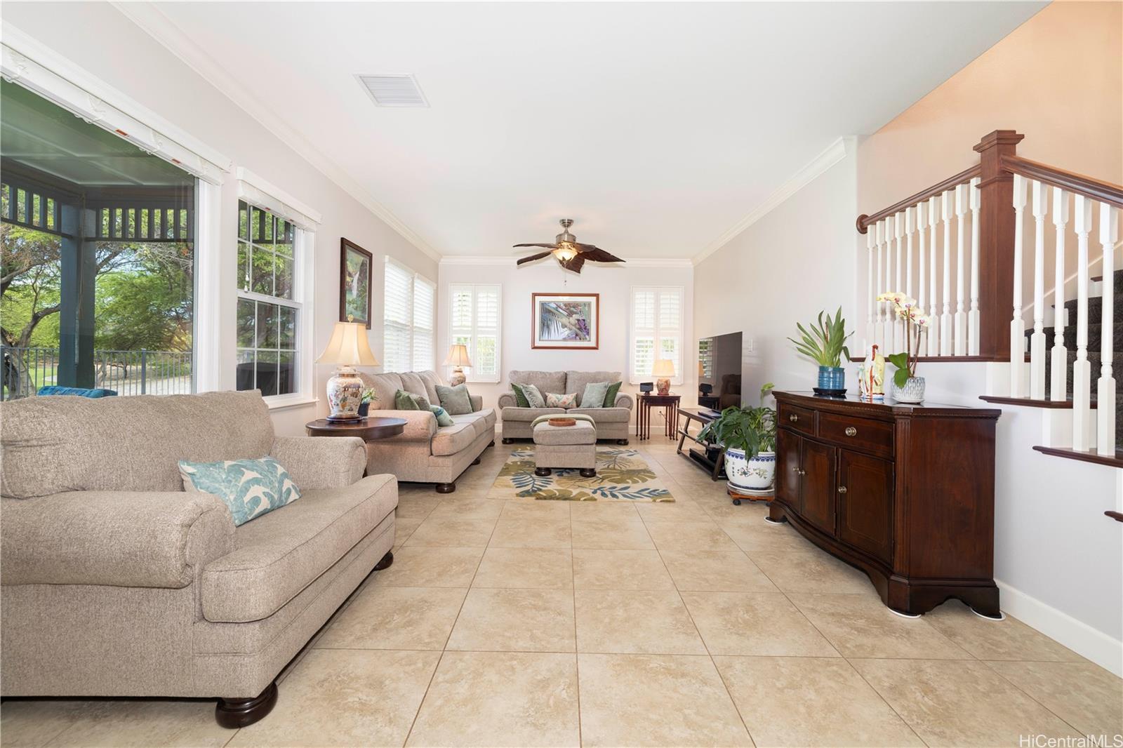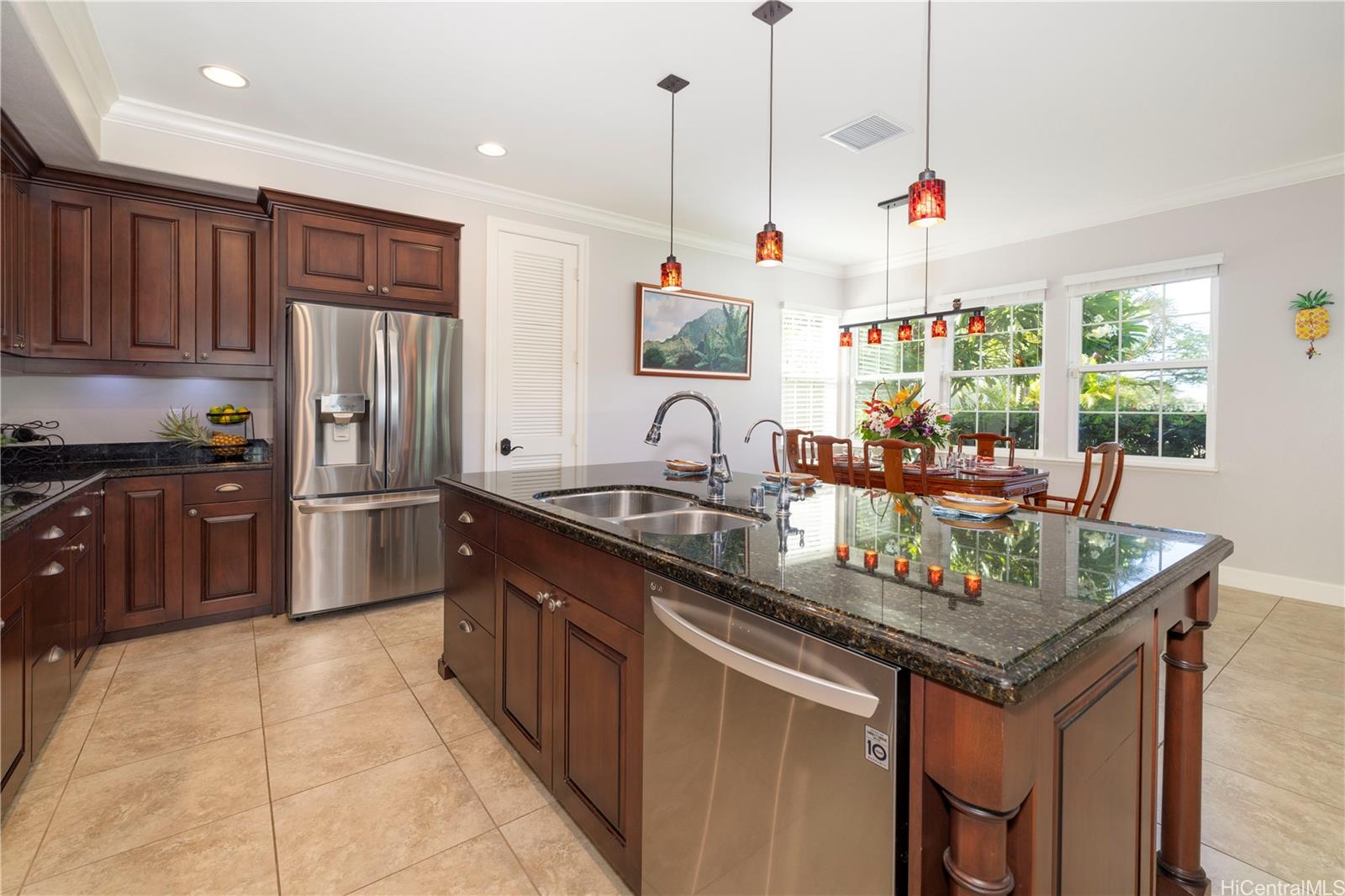 Fronting the Hoakalei Golf Course, this meticulous 4-bedroom home is refined island living! From the welcoming foyer, the French doors open to a bonus room—ideal as a private office, reading retreat, or den—along with a main-level bedroom & full bathroom, perfect for guests or multi-generational living. The modern kitchen has upgraded cabinetry, stainless steel appliances, granite counters, and a large island with additional seating.