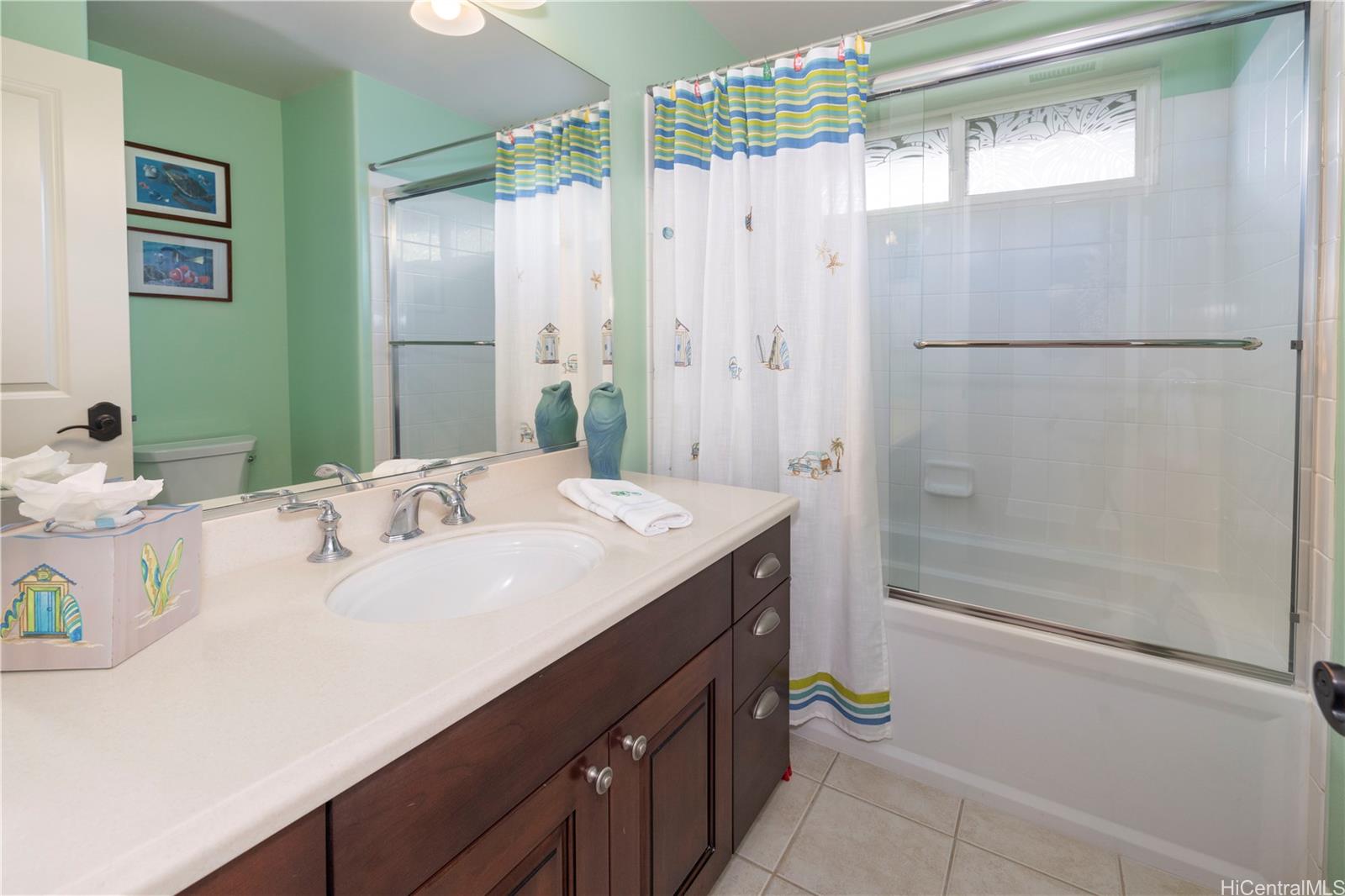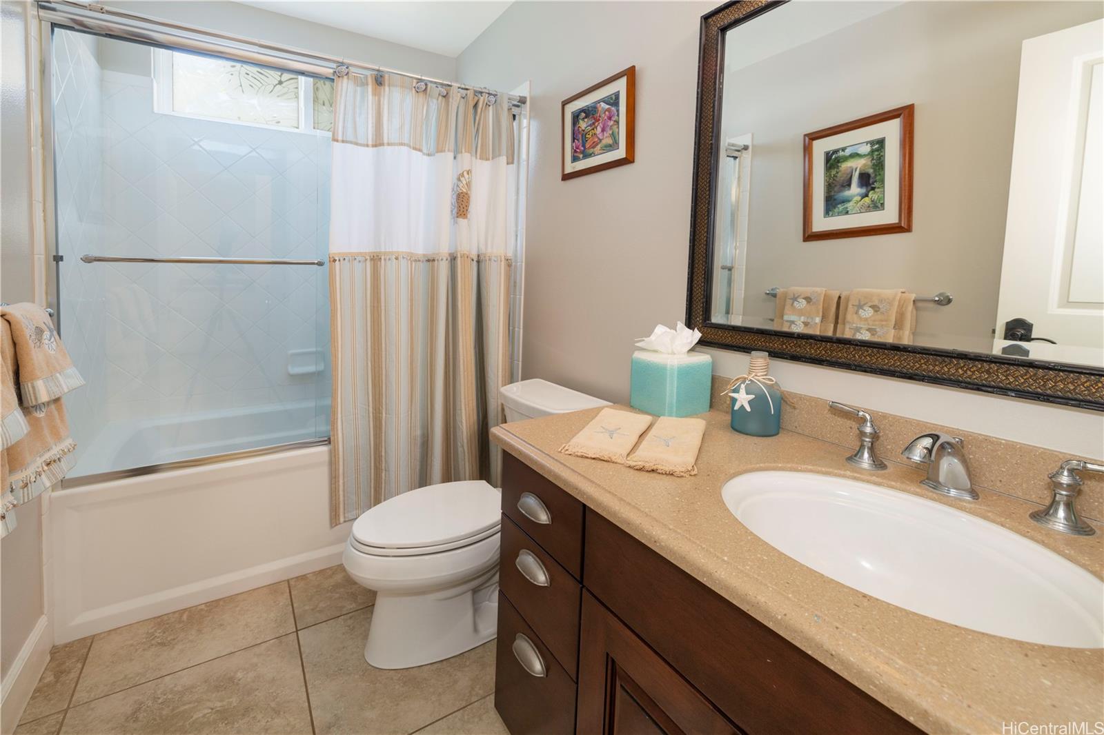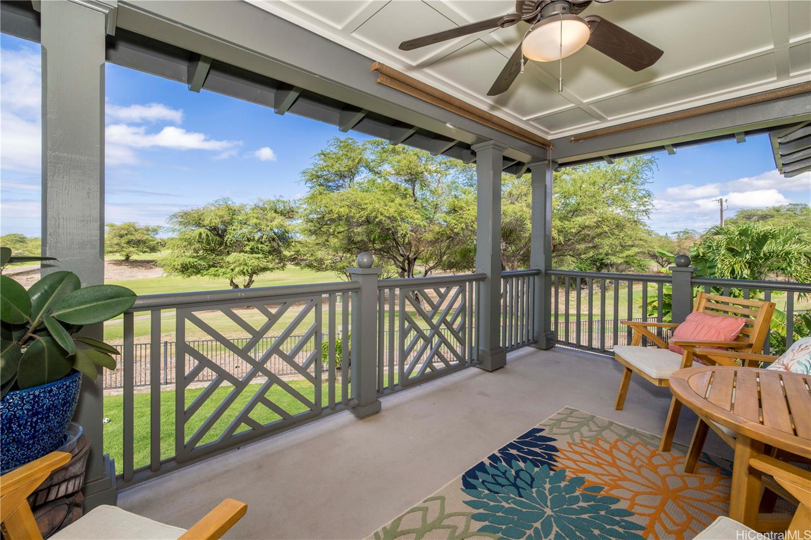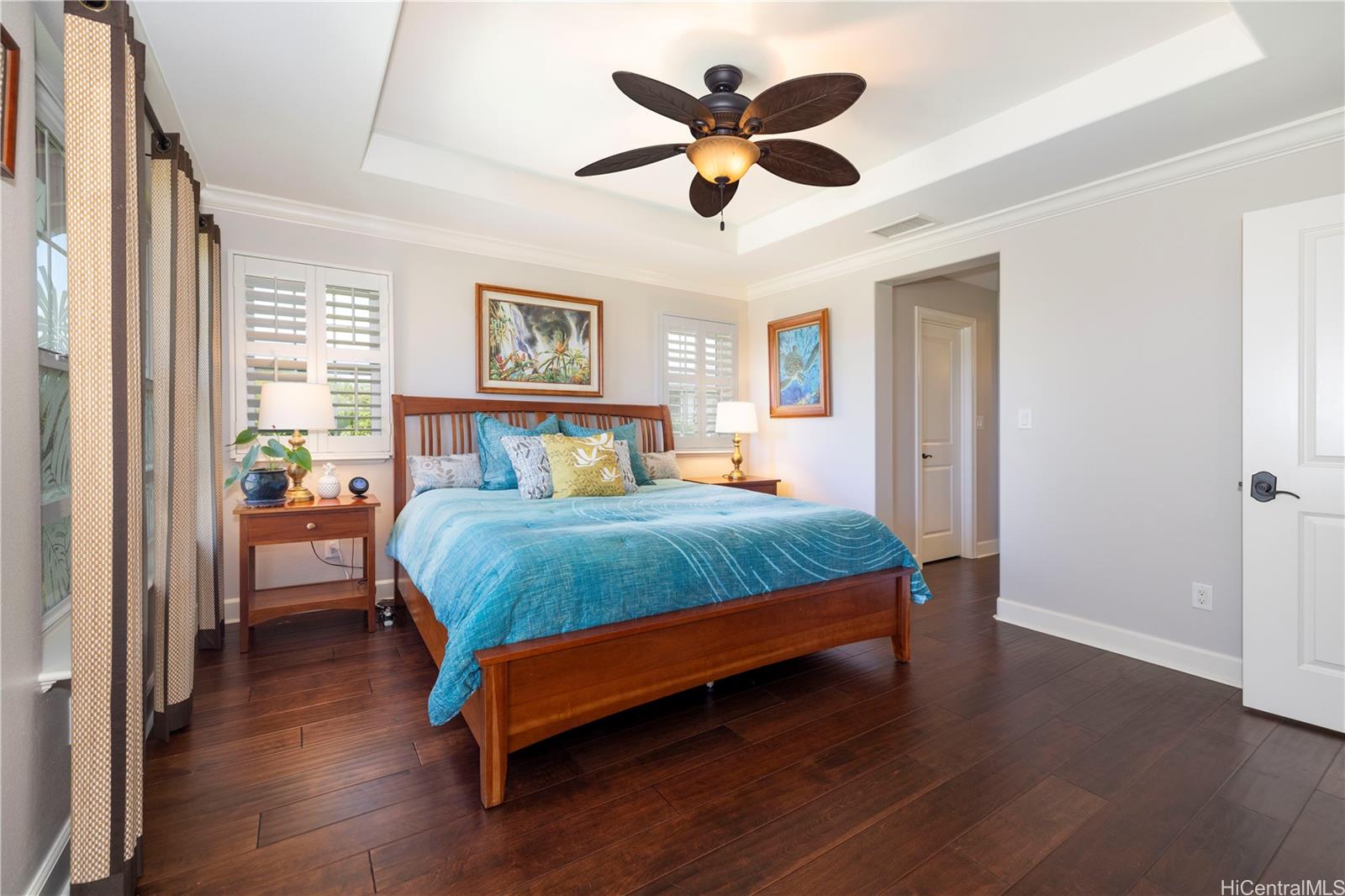 Fronting the Hoakalei Golf Course, this meticulous 4-bedroom home is refined island living! From the welcoming foyer, the French doors open to a bonus room—ideal as a private office, reading retreat, or den—along with a main-level bedroom & full bathroom, perfect for guests or multi-generational living. The modern kitchen has upgraded cabinetry, stainless steel appliances, granite counters, and a large island with additional seating.