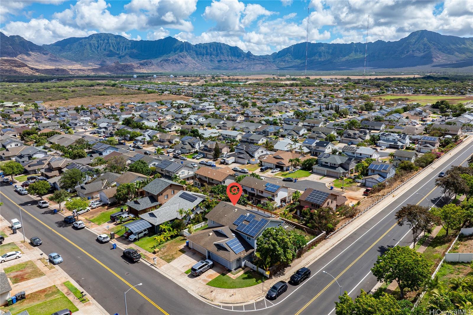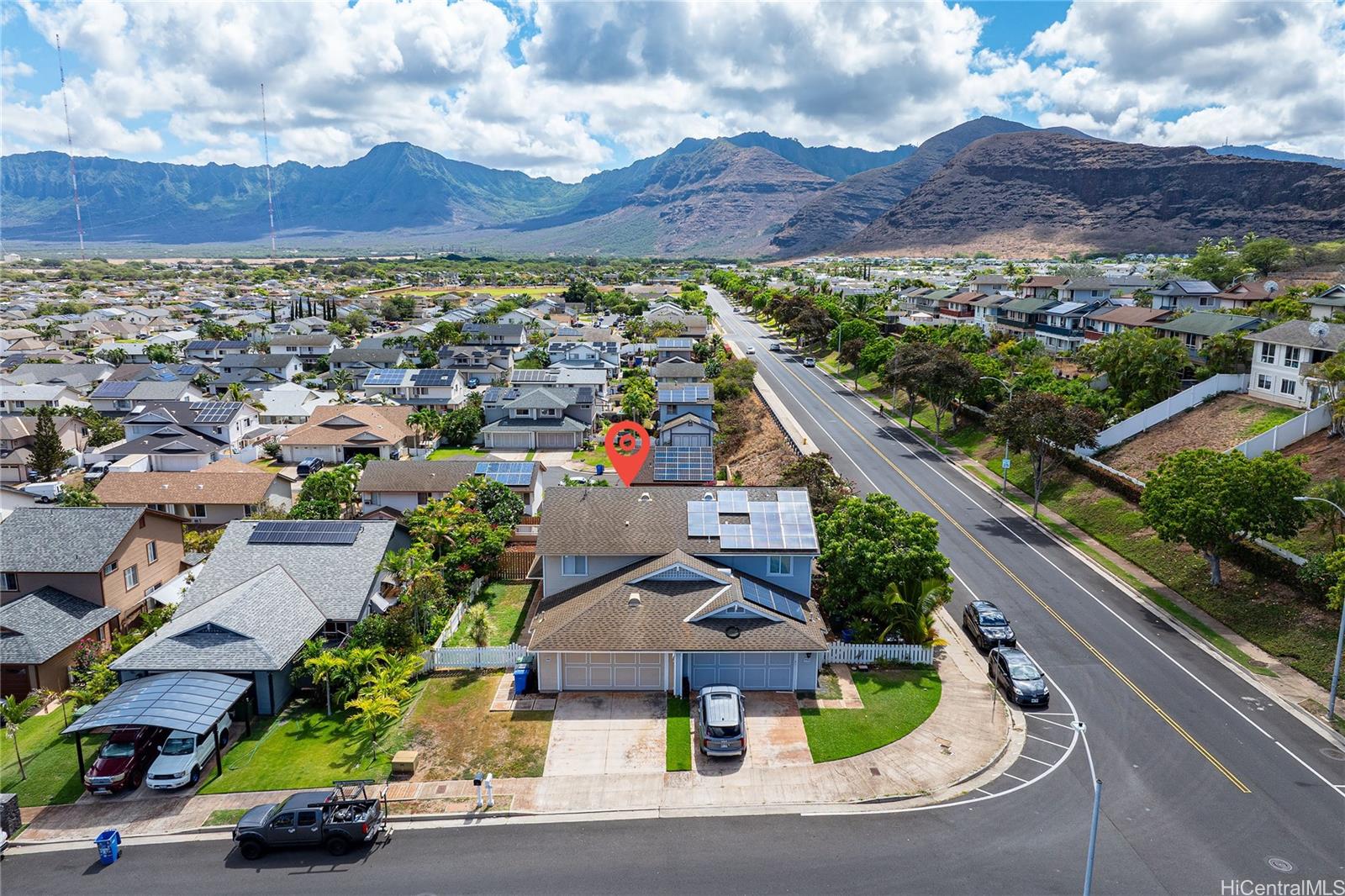 Freshly upgraded with NEW split AC units in every room and NO maintenance fee, this charming home sits on an elevated lot in Lokelani Maili Kai, right below the famous pink pill box hiking trail, offering sweeping views of the Waianae Mountain Range, ocean, and unforgettable sunsets. The functional floor plan features 4 bedrooms (including one downstairs), 3 full baths, and an open concept living area. The kitchen boasts stainless steel appliances — refrigerator, dishwasher, microwave hood — plus a brand-new gas range/oven for the cooking enthusiast. Step outside to a fully fenced backyard, perfect for gatherings or relaxing in privacy. A two-car garage plus extended driveway provides ample parking. Located near the famous Maili Pillbox hiking trail and with easy access to Farrington Highway, you’re minutes from west Oahu’s best beaches — Ko Olina, Tracks, Nanakuli, Makaha, and Electric Beach — ideal for swimming, surfing, or simply soaking in the island lifestyle.
