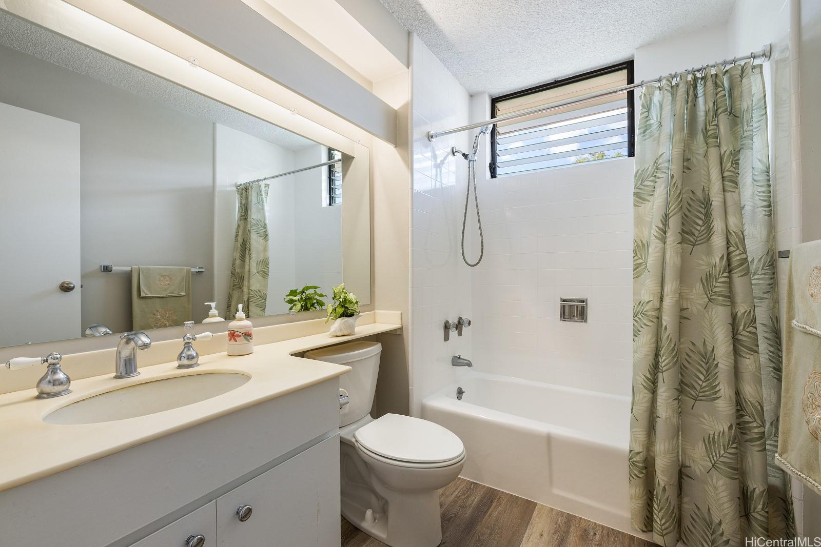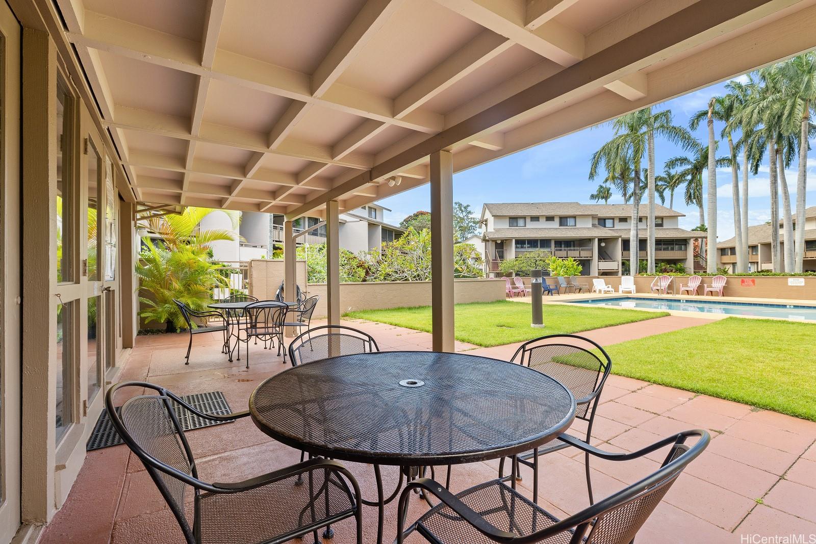 The open, airy layout features a separate dining area and an expansive living room that flows effortlessly to a huge screened lanai of 230 sf, perfect for entertaining and indoor-outdoor living. Step outside to a fenced garden area and lush greenery views. Both bedrooms are generously sized, with the primary suite offering a walk-in closet. This end-unit gem includes two covered, side-by-side parking stalls and a large private storage room. Residents enjoy access to a beautiful swimming pool and a recreation room for gatherings or meetings, all within a highly sought-after tropical community adjacent to Mililani Golf Club and its restaurant. You'll also have membership in the Mililani Town Association that provides access to seven recreation centers and a host of amenities.