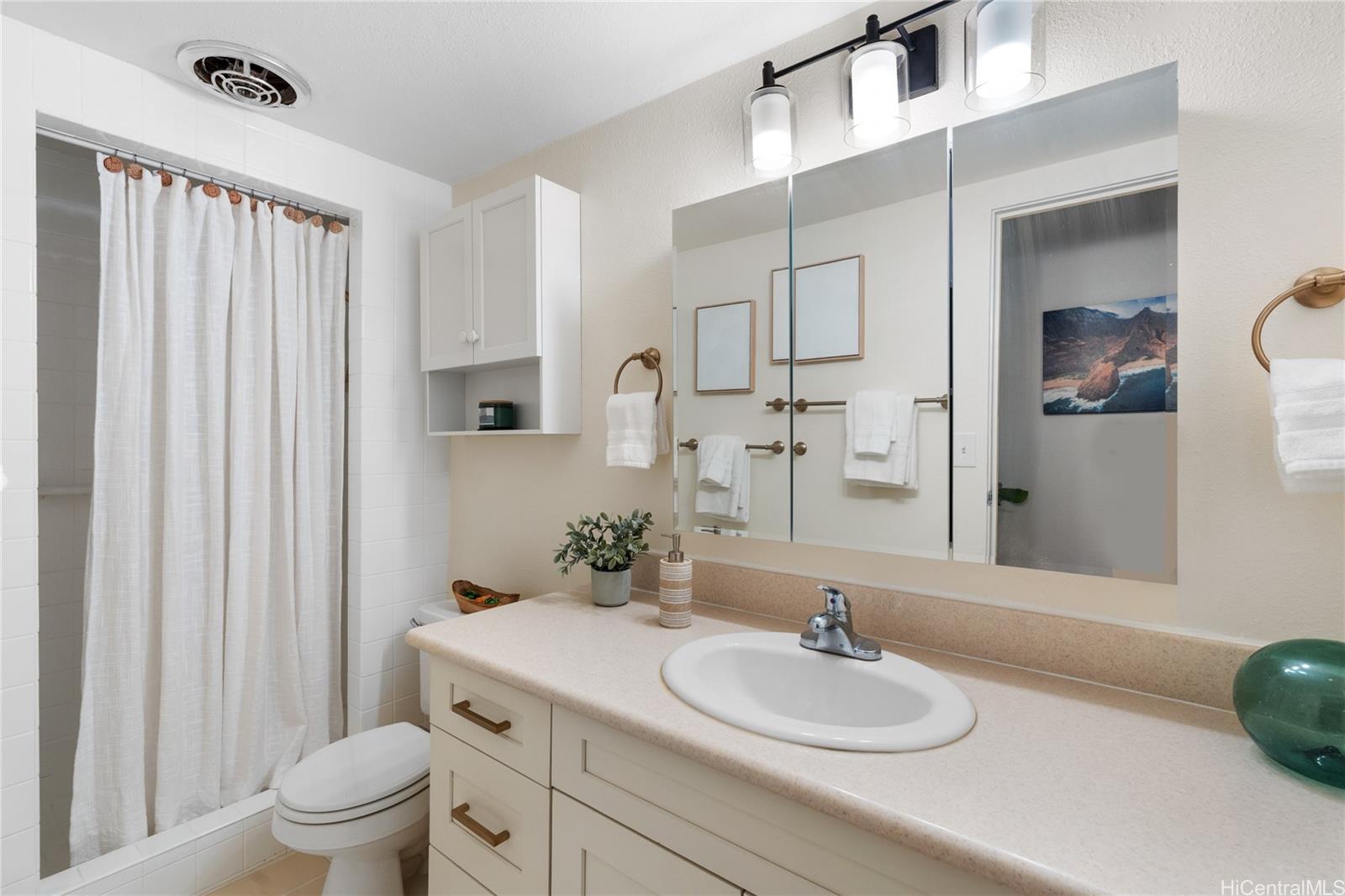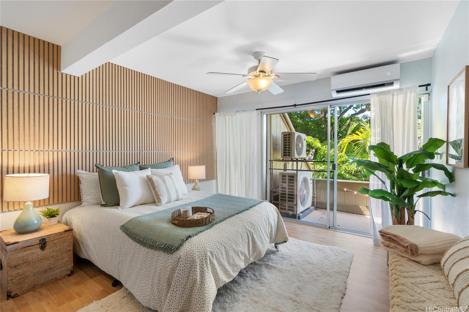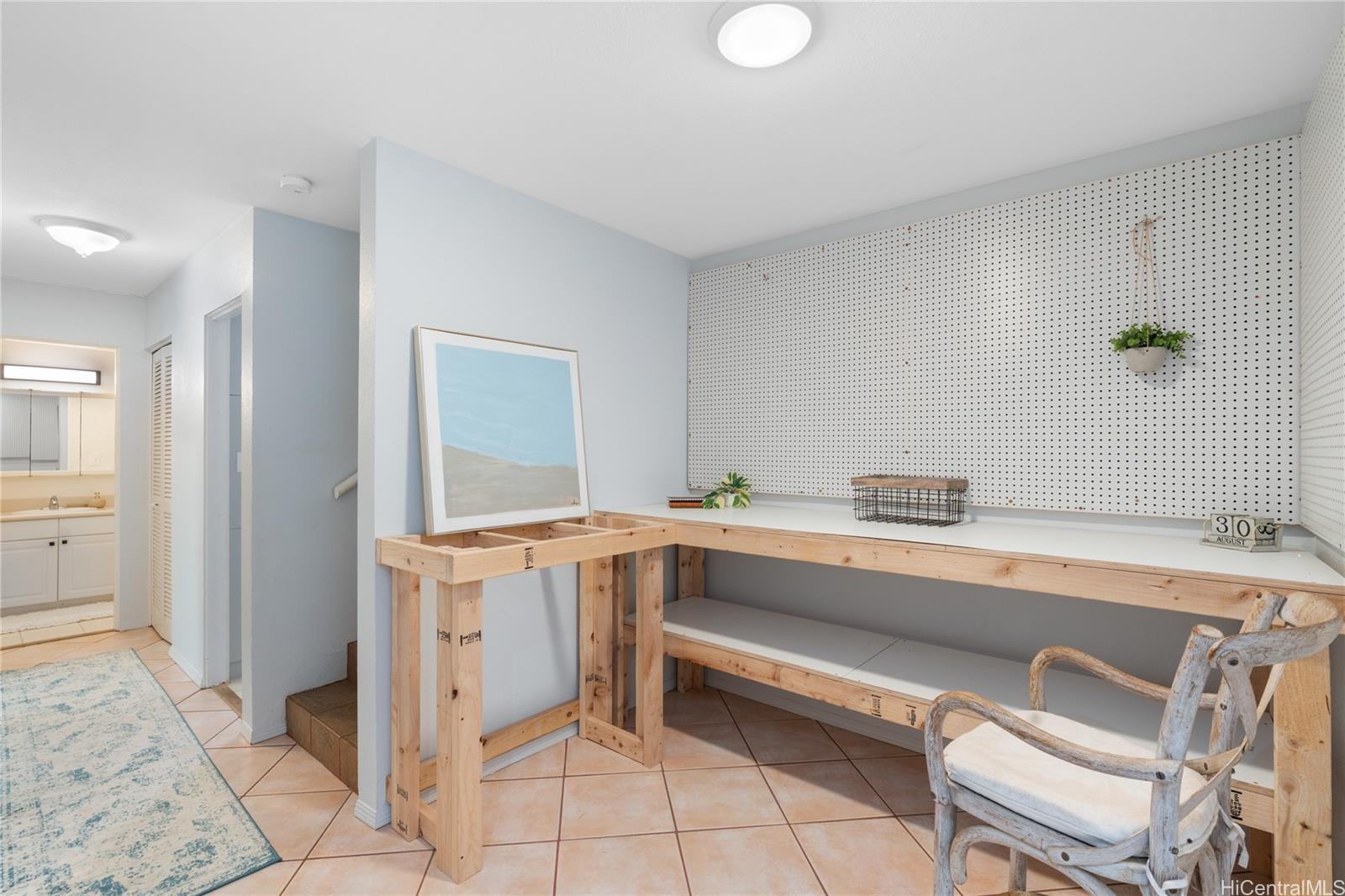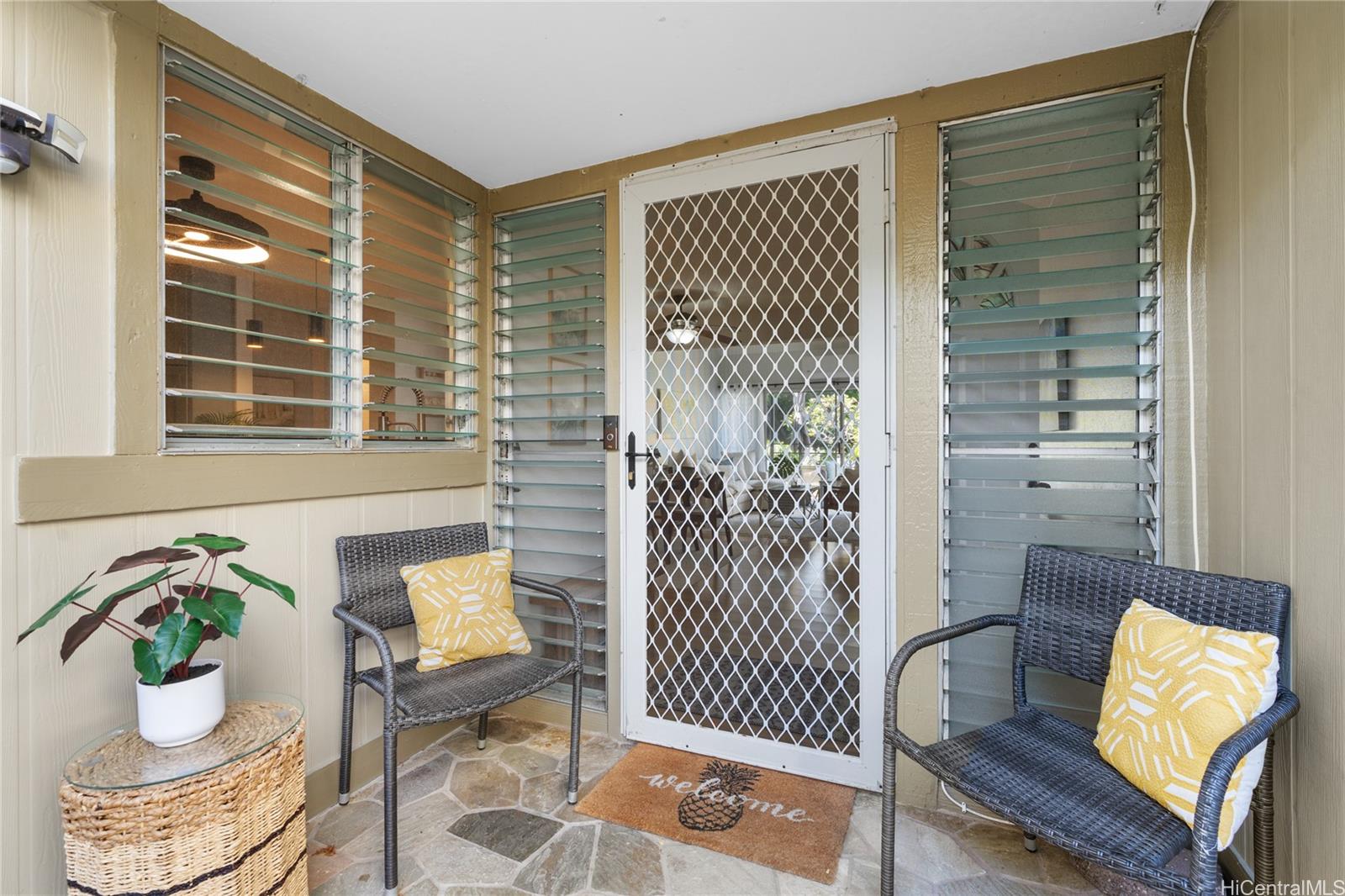 Seller offering $10k CREDIT!! This thoughtfully designed split-level townhome offers the perfect balance of comfort, and functionality. Vaulted ceilings create a bright, open living space that flow from the freshly remodeled kitchen to the dining and living areas. New lighting fixtures enhance the warm, inviting atmosphere, making this space ideal for casual gatherings or entertaining. Step outside to the spacious lanai, where mornings begin with coffee and views of the lush tropical surroundings. The primary suite, conveniently located on the entry level, provides ease and comfort, while the lower level extends the living experience with two additional bedrooms, a private fenced lanai, and a versatile flex space perfect for a home office, hobby room. The lanai also features direct access to wide-open grassy grounds. Practicality is built in with generous storage within the unit and an additional space near your two assigned parking stalls. Recent updates include new lighting, a remodeled kitchen, and four efficient split A/C units to keep the home cool year-round. With quick access to H-3, Kailua, and Kaneohe, this property combines convenience with the relaxed island lifestyle.