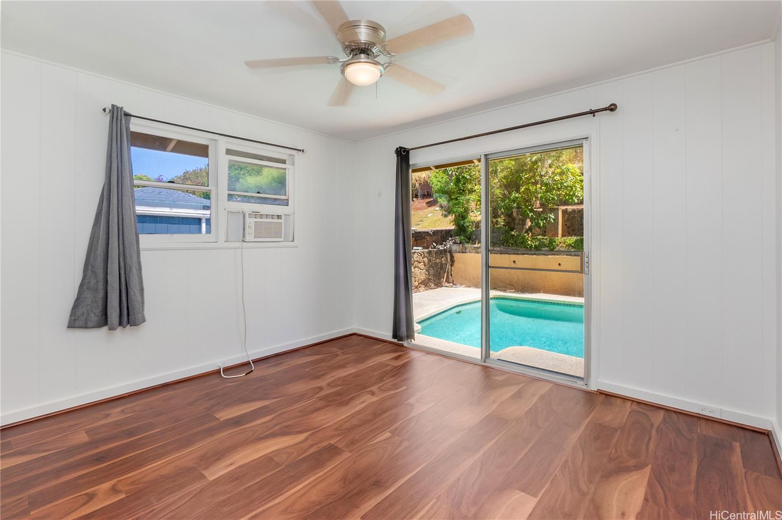 Amazing opportunity to own in Kailua! This flexible floor plan offers endless possibilities with a well-maintained 4-bedroom, 2-bath main home (currently configured as a 3/1 plus a spacious studio). An additional remodeled studio (5th bedroom), separated by the saltwater pool, enjoys treetop and mountain views of Enchanted Lake, along with cool breezes and privacy. Ideal for multigenerational living, a home office, or rental income potential. The property is fully fenced and landscaped with a sprinkler system—perfect for your fur babies! Conveniently located near world-famous Kailua beaches, parks, shops, and restaurants, with easy access to the H-3 and Pali Highway—without having to fight traffic in Kailua town. Put this home on your must-see list! Number of bedrooms differs from tax records. One or more photos have been enhanced.