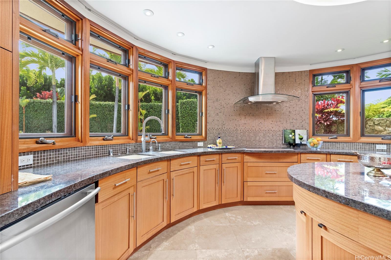 Modern Island Sanctuary in the heart of Kahala...single level home with very open floor plan ..living, dining, kitchen, primary bedrooms all opening out to the swimming pool and lush manicured landscaping .. vaulted ceilings with wood trim, skylights and lots of glass to let in the natural light, exquisite coral stone throughout the home enhance the architecture, sophisticated chef's kitchen with high end appliances ... innovative revolving glass doors from living room looking out to the pool with waterfalls and indoor water feature...seamless indoor/outdoor flow.
