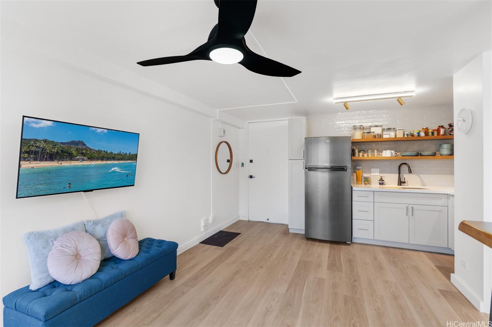 ソルトレイクにある、モダンで改装済みの角部屋ユニット。スタイリッシュでシックなこのユニットは、すぐに入居可能な改装済み、家具完備の1ベッドルーム/1バスルームのリースホールドコンドミニアムで、洗練されたモダンな雰囲気が漂います。ビニール製のフローリング、省スペースのマーフィーベッド、オープンシェルフ付きのクォーツ製キッチンカウンター、レインシャワー、木目調タイル、石畳のフローリングを備えたスタイリッシュなバスルームなど、充実した設備が備わっています。大きな角窓からは自然光がたっぷりと差し込みます。24時間体制のセキュリティシステムを備え、ショッピング、レストラン、高速道路へのアクセスも便利です。ホノルル中心部にある都会の隠れ家として最適です。