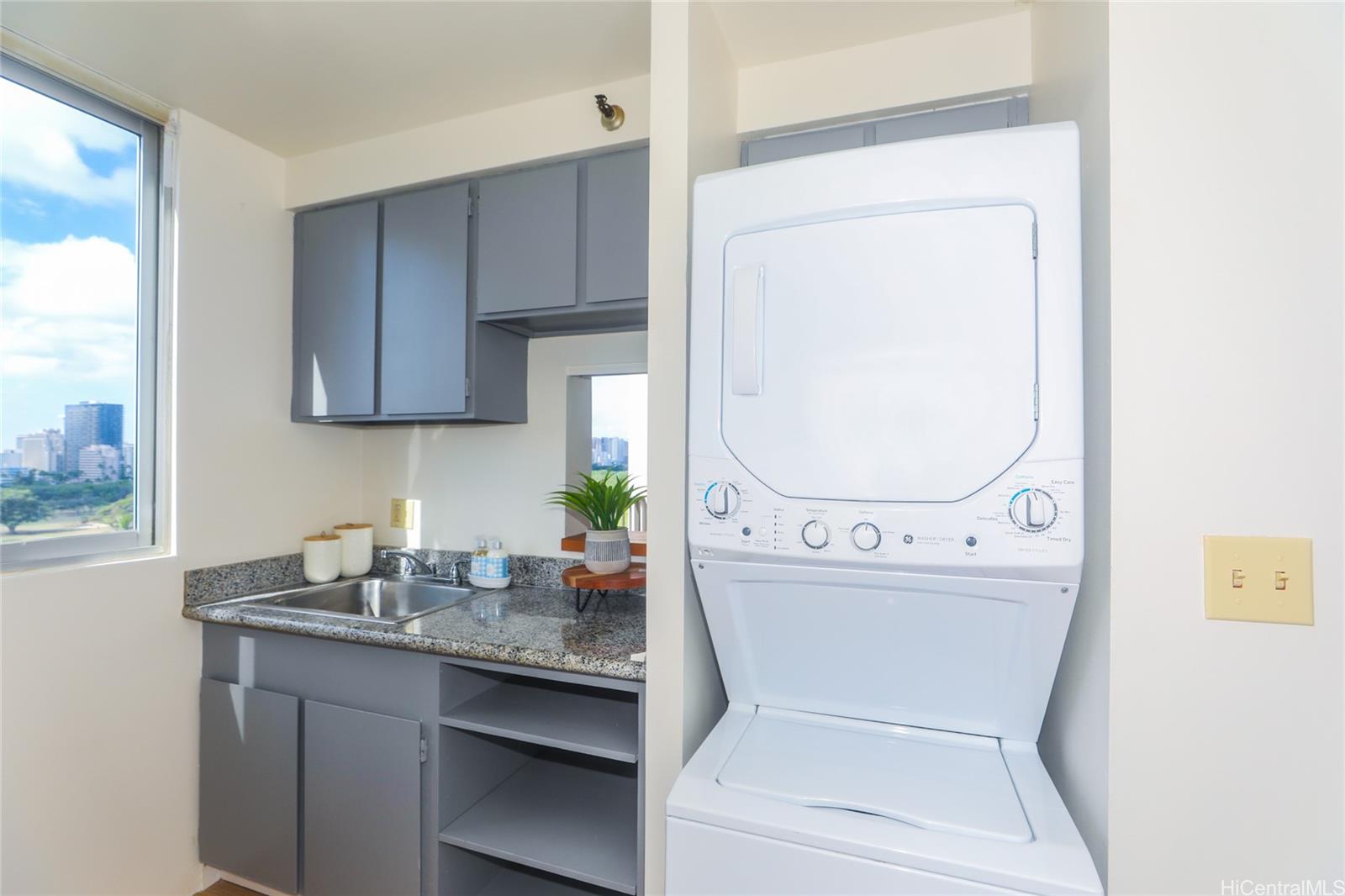 Spacious 2 bedroom 2 bath unit with 1 parking stall in the conveniently located Fairway House condominium. This well maintained unit has been freshly painted and has new carpet and vinyl plank flooring. Unit also features fire sprinklers, an in unit washer & dryer and unobstructed views of Diamond Head, Waikiki, and Ala Wai Golf Course. Building has a multitude of amenities including a tennis court, swimming pool, dog park and more. Fantastic location near Iolani School, Safeway, bus lines and several eateries along Kapahulu Ave.