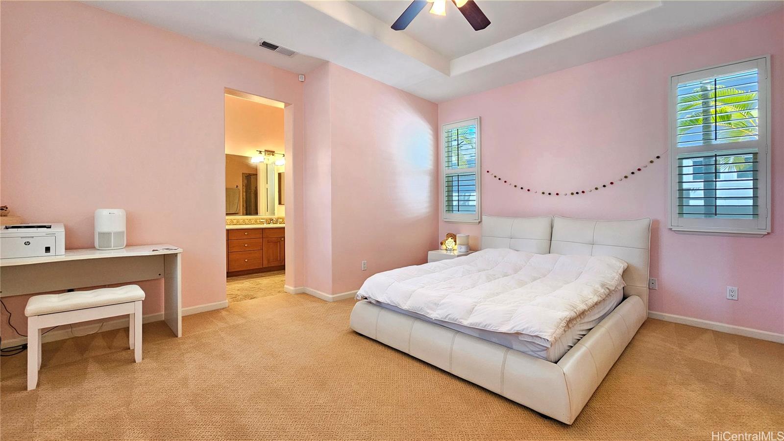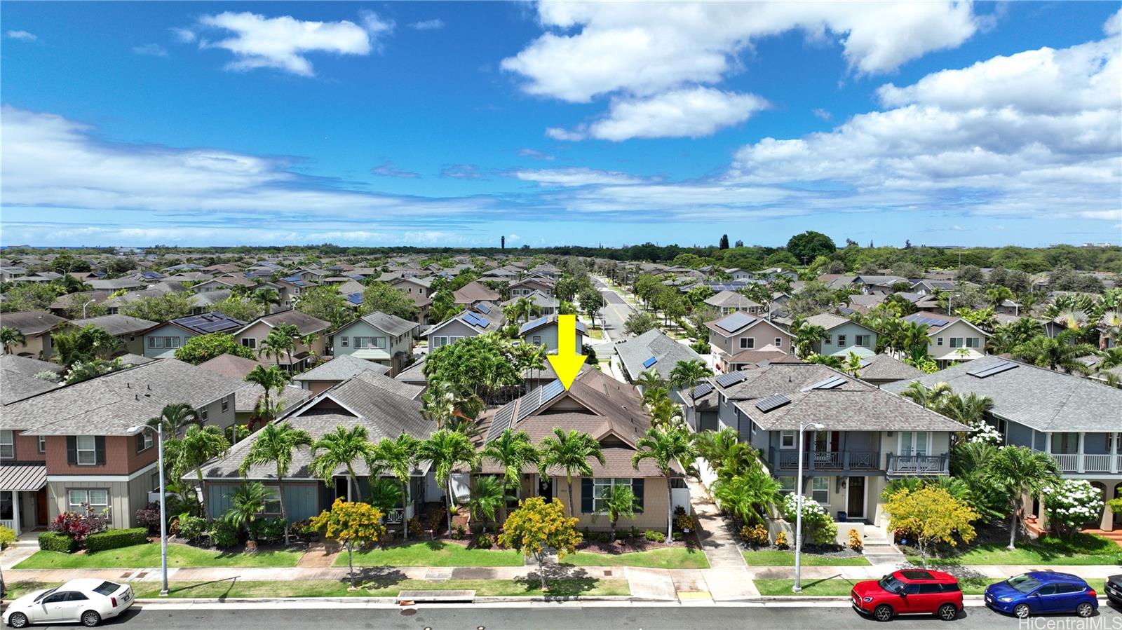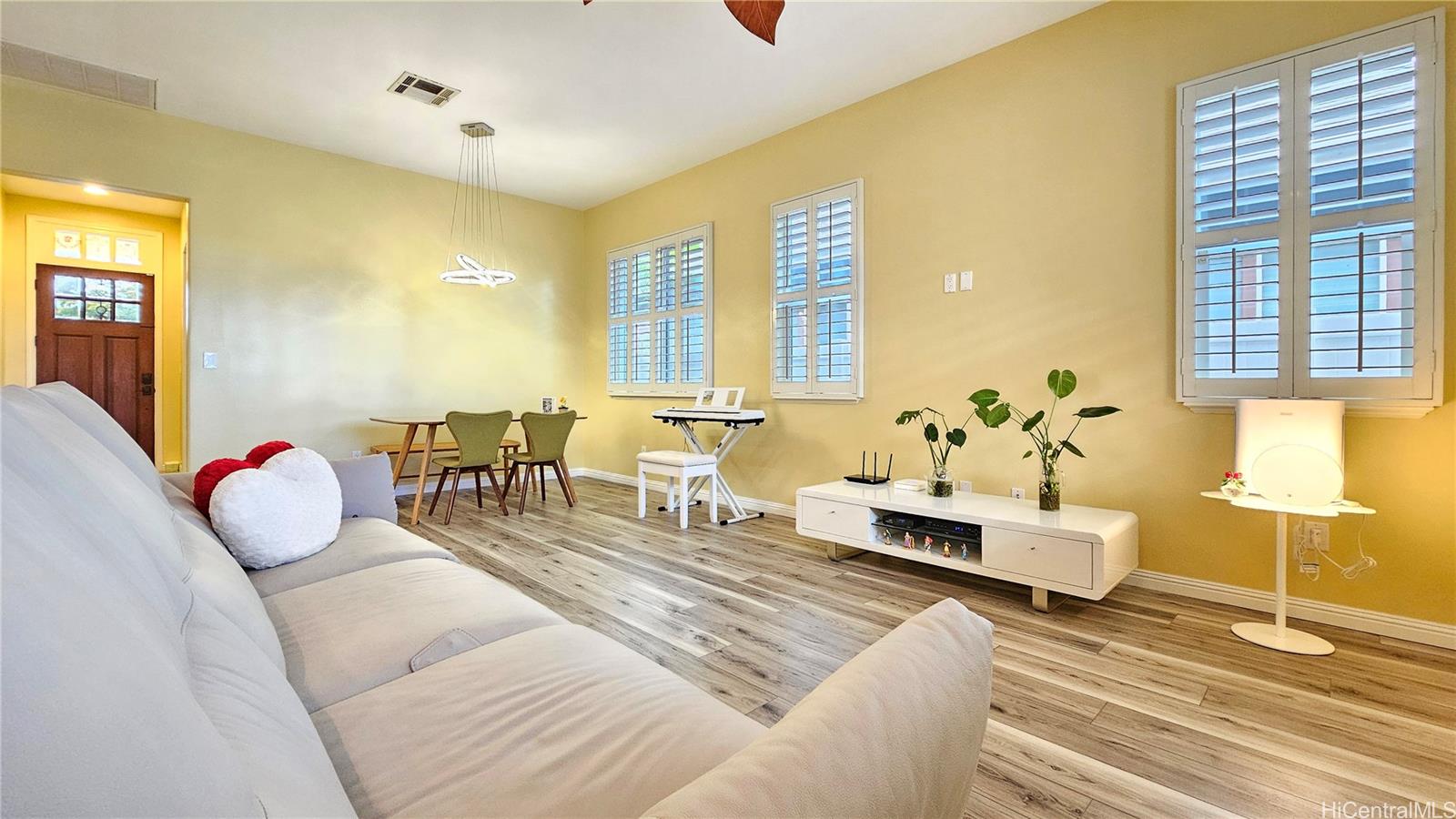 91-1022 Waillikahi Street in Ewa Beach is a beautifully maintained single-level home located in the highly desirable Hoakalei – Ka Makana community. This thoughtfully upgraded residence features soaring high ceilings, a bright open layout, and a landscaped garden with an automatic sprinkler system for easy care. The home is equipped with 24 owned solar panels, significantly reducing electricity costs and adding long-term value. Additional improvements include new living room flooring and molding, a freshly painted interior and exterior, and a new water heater with PV panel. The kitchen offers a new microwave and garbage disposal, while the bathrooms showcase a sleek glass shower enclosure, modern fixtures, and updated lighting. Comfort is assured with central A/C that was fully serviced in April 2025, including replacement of the vent, motor, fan, and capacitor, plus professional coil cleaning. This move-in ready property combines modern upgrades, owned solar, and the convenience of single-level living—all within the resort-style Hoakalei community.