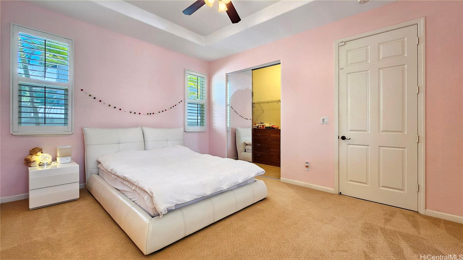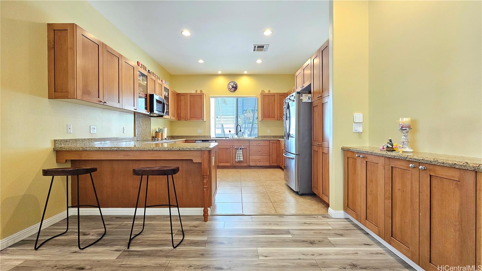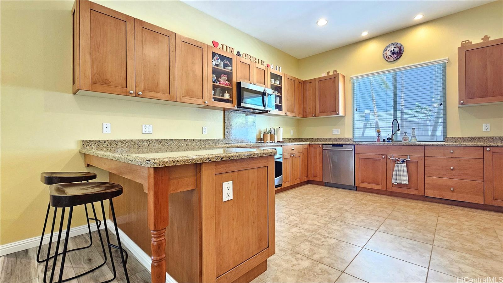 91-1022 Waillikahi Street in Ewa Beach is a beautifully maintained single-level home located in the highly desirable Hoakalei – Ka Makana community. This thoughtfully upgraded residence features soaring high ceilings, a bright open layout, and a landscaped garden with an automatic sprinkler system for easy care. The home is equipped with 24 owned solar panels, significantly reducing electricity costs and adding long-term value. Additional improvements include new living room flooring and molding, a freshly painted interior and exterior, and a new water heater with PV panel. The kitchen offers a new microwave and garbage disposal, while the bathrooms showcase a sleek glass shower enclosure, modern fixtures, and updated lighting. Comfort is assured with central A/C that was fully serviced in April 2025, including replacement of the vent, motor, fan, and capacitor, plus professional coil cleaning. This move-in ready property combines modern upgrades, owned solar, and the convenience of single-level living—all within the resort-style Hoakalei community.