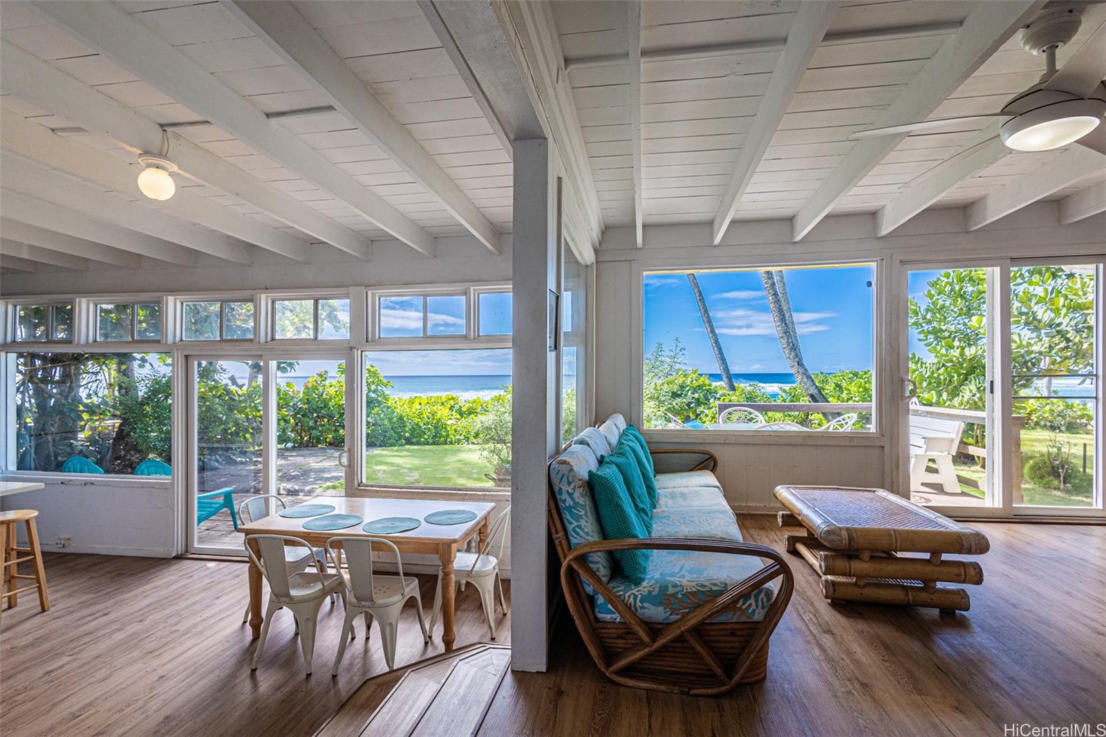 Discover the Ultimate North Shore sanctuary, where a private path leads directly to the sand. This oceanfront retreat is designed to showcase breathtaking views of the surf and sunsets from its open-concept living space and updated modern kitchen. Step outside to your private oasis with an expansive back deck and a spacious front lawn—perfect for entertaining or simply soaking in the coastal beauty.