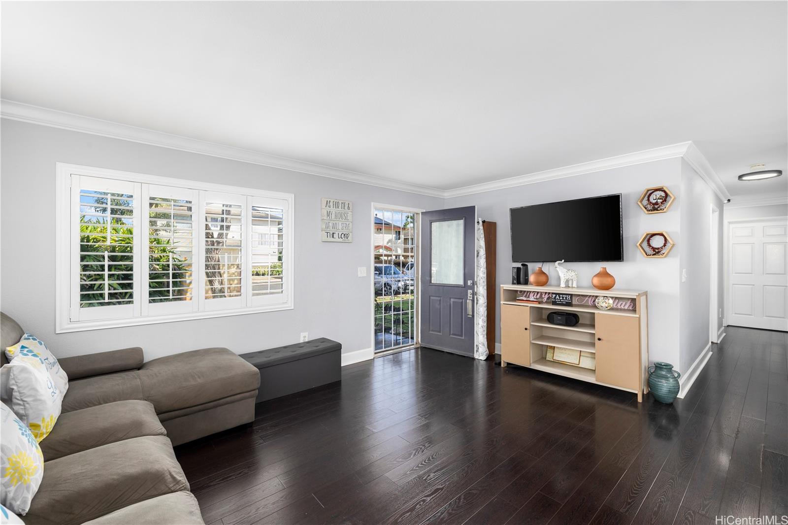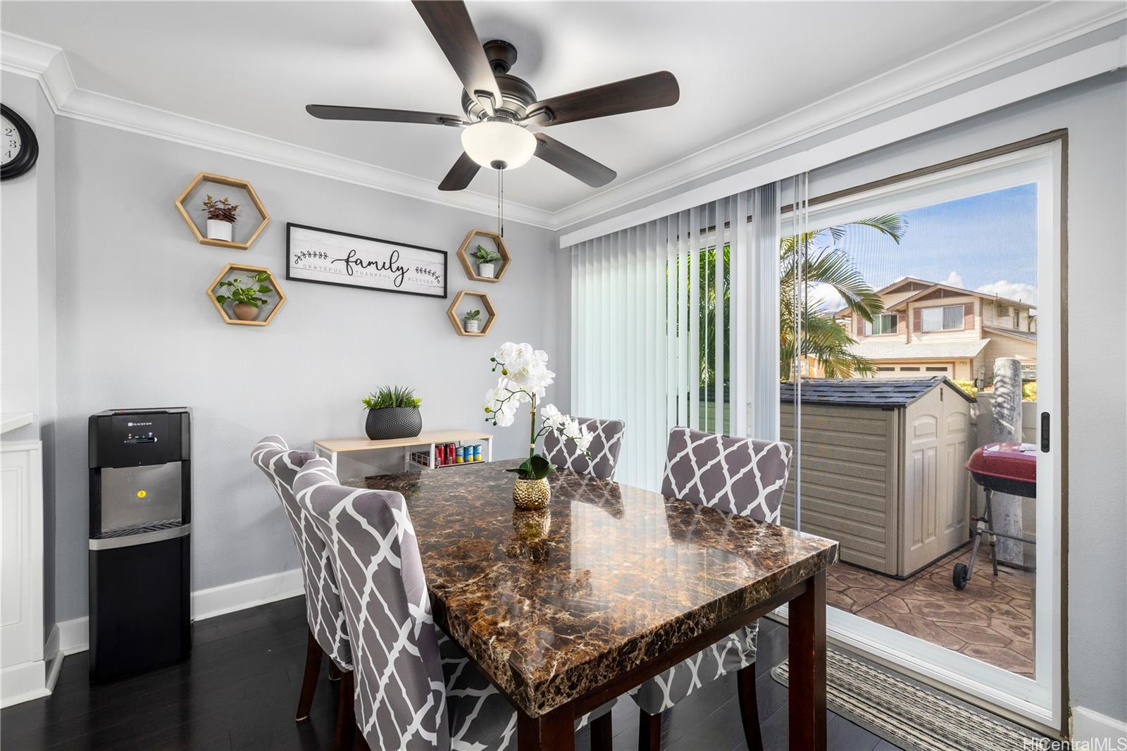 DO NOT MISS THIS OPPORTUNITY TO OWN THIS RARELY AVAILABLE 3 Bedrrom, 2 Full Bath GROUND FLR END UNIT with Own Washer & Dryer Unit & a yard in Ewa Gentry. This gem, - Feels Like a Single-Family! Pet-friendly (2 pets allowed buyer to verify) with pool & playground access. This well -maintained 3-bedroon, 2-bath townhome blends comfort, style, and functionality with thoughtful upgrades throughout, 2 parking stalls w/lots of street parking, private 225 sq. ft. lanai with stamped concrete and extra storage - perfect for entertaining or relaxing, thoughtful upgrades-stainless steel appliances, plantation shutters, crown molding, new washer/dryer & more. Prime location near Holomua Elementary, shopping, dining & freeway. An ideal choice for first-time buyers or anyone seeking a move-in-ready home in highly desirable neighborhood!