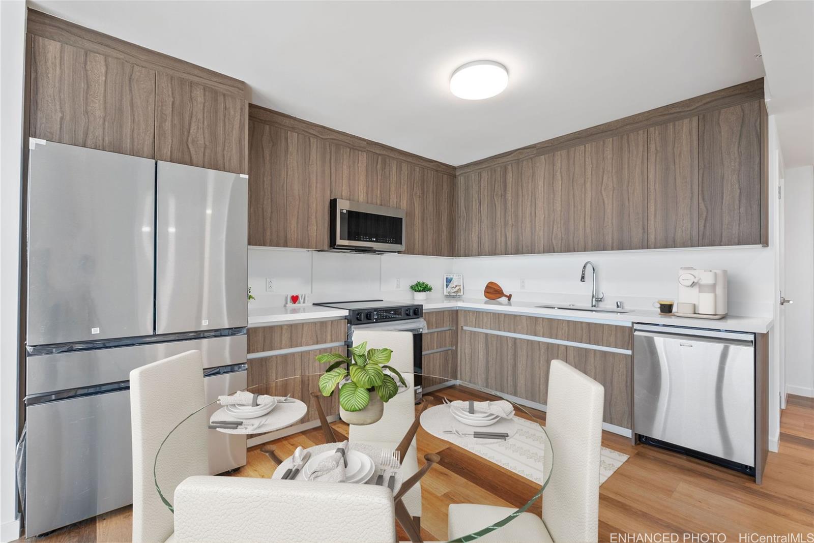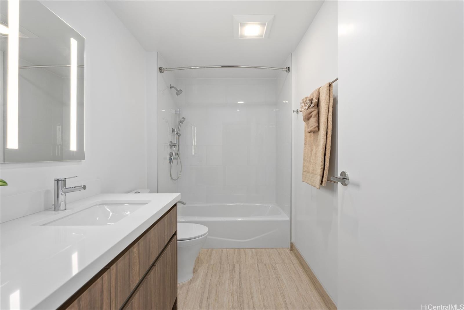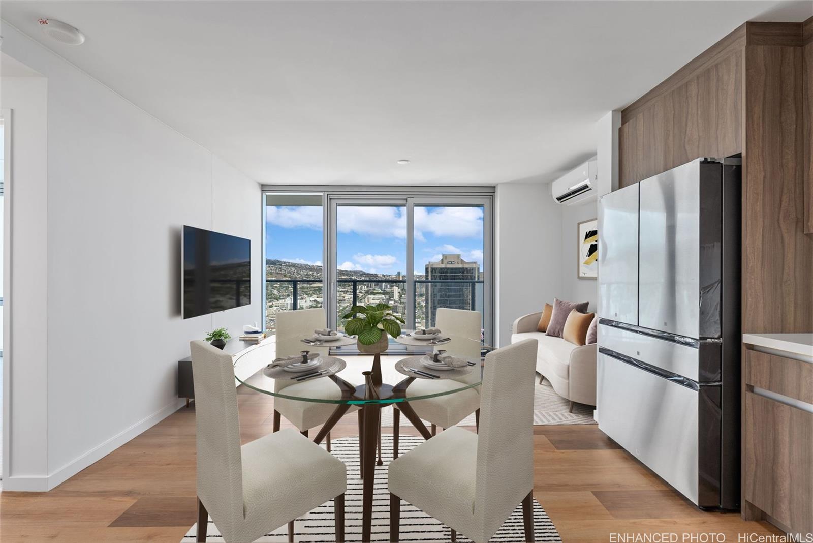 PRICED TO SELL!!! Liona 3607 at The Park on Keeaumoku offers a stunning one-bedroom residence with a private lanai - Diamond Head view and sunrise, perfect for enjoying Honolulu's urban landscape. This unit features an open-concept living area with luxury vinyl plank flooring and floor-to-ceiling windows that maximize natural light and views. The kitchen is designed with quartz countertops, modern plumbing fixtures, and sleek stainless steel appliances, making it both functional and stylish. The bedroom is a cozy retreat with carpeted floors for comfort, while the bathroom is equipped with quartz countertops, modern fixtures, and LED medicine cabinets. A quiet, energy-efficient split AC system ensures a comfortable climate throughout the home. The building provides resort-style amenities including an infinity pool, spa, movie theater, fitness center with a sauna and yoga room, and private BBQ pavilions. With 24/7 security, secured covered parking, bike storage, and EV charging stations, this pet-friendly unit is an ideal blend of luxury, convenience, and modern living. Don't miss this great Opportunity to Aquire Best Priced 1 Bed! A few photos have been virtually staged(enhanced).