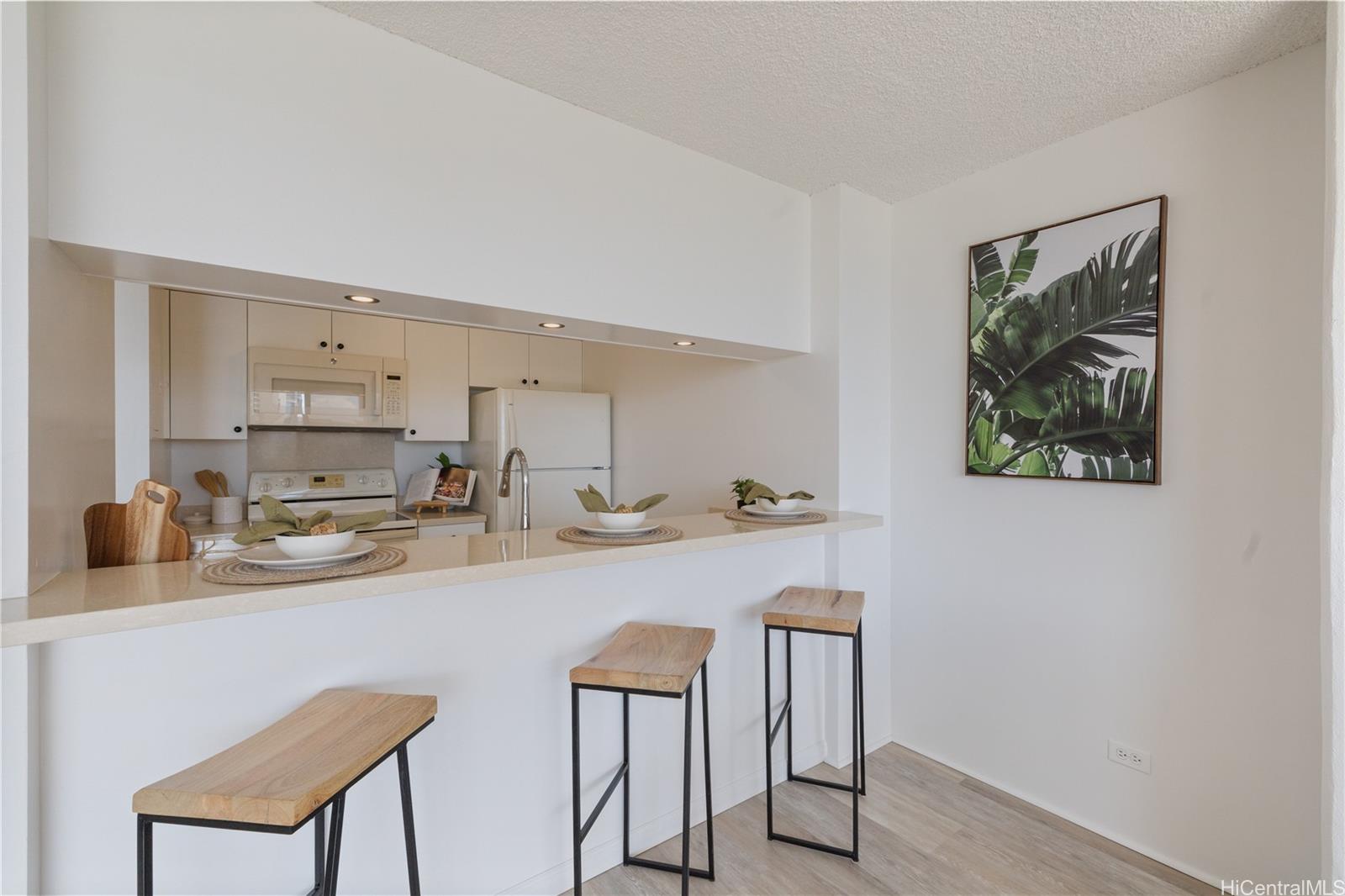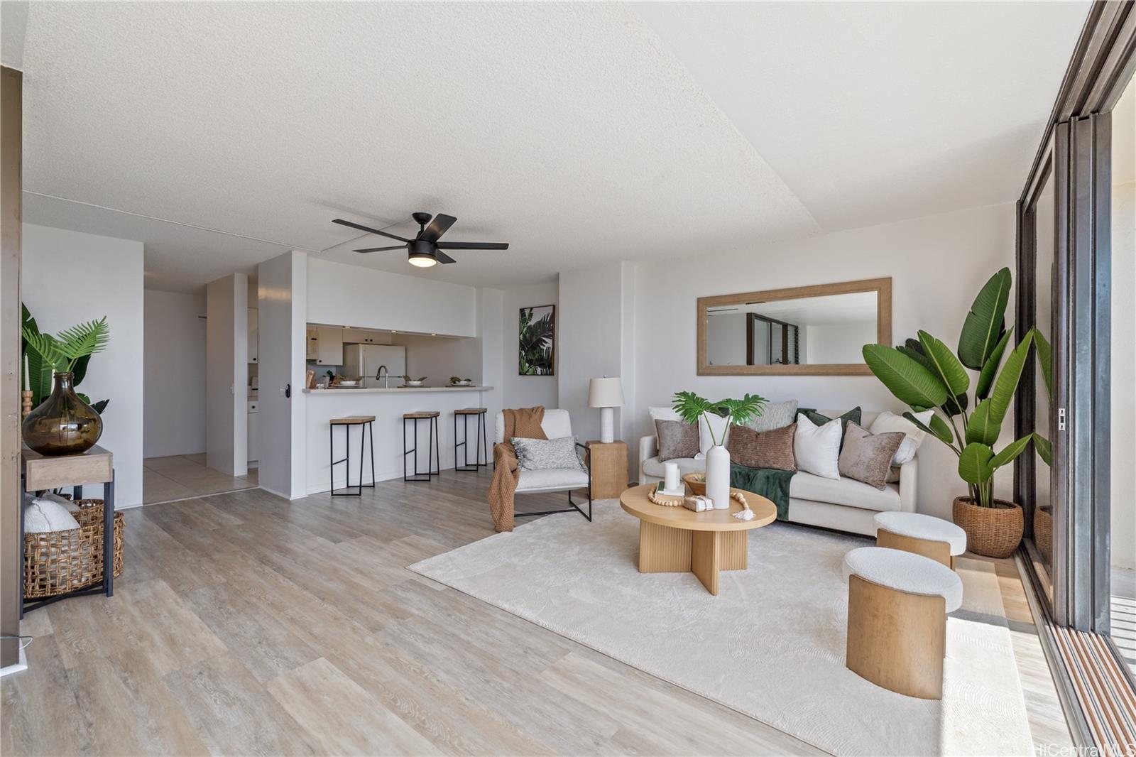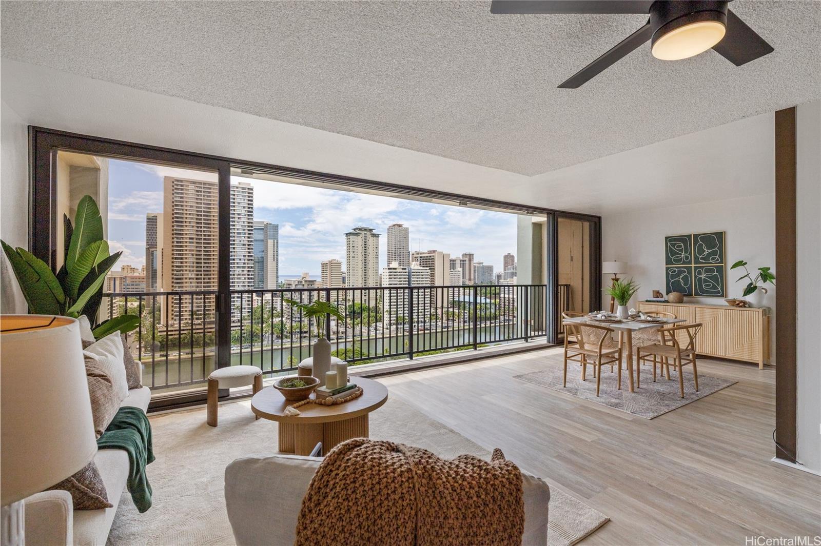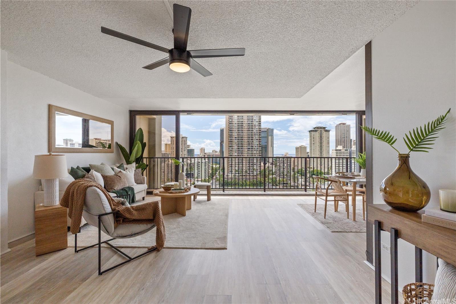Wake up every day to the beauty of Honolulu in this captivating 1-bedroom, 1-bath home at Kaimana Lanais. With 810 sq. ft. of expanded interior space, the enclosed lanai creates an airy, open layout designed for both relaxation and entertaining. Freshly updated with luxury vinyl flooring, new light fixtures, sleek Corian countertops, and crisp paint, this residence blends modern comfort with timeless island style. Floor-to-ceiling multi-slide doors bring in dazzling views of the Waikiki’s skyline, vibrant city, ocean, Diamond Head, and spectacular sunsets—your personal postcard from paradise. The walk-in shower adds a touch of everyday luxury, while building amenities elevate your lifestyle with a pool, recreation room, surfboard racks, secure entry, and pet-friendly living. Perfectly located in Kapiolani, you’re minutes from Waikiki, Ala Wai Golf Course, UH, beaches, parks, shopping, and entertainment. Move-in ready, meticulously maintained, and waiting for you—schedule your showing today!