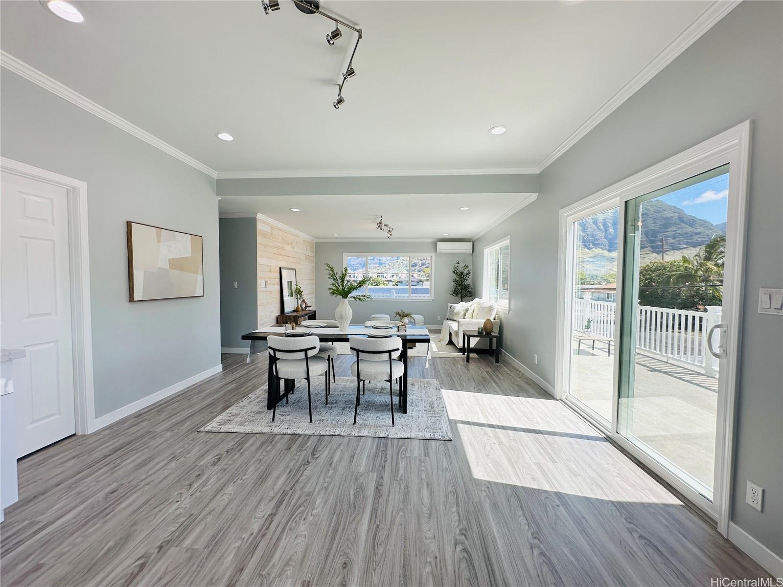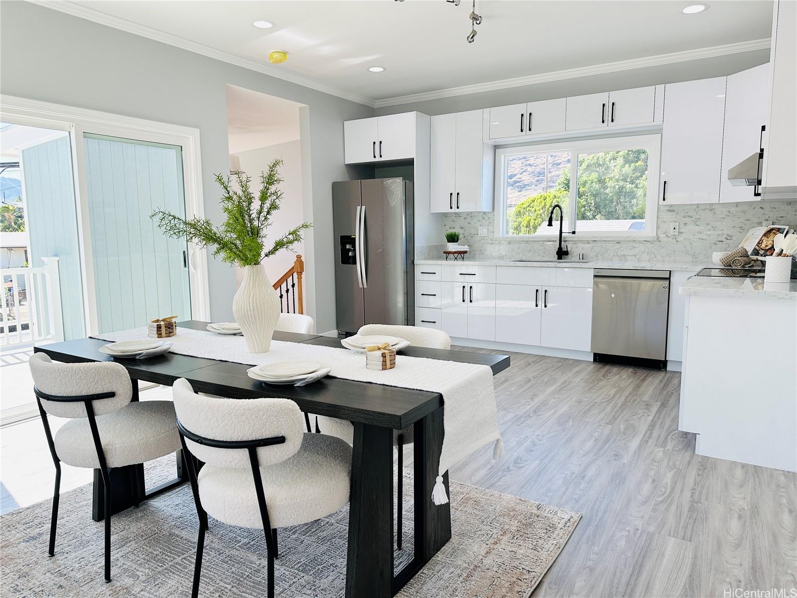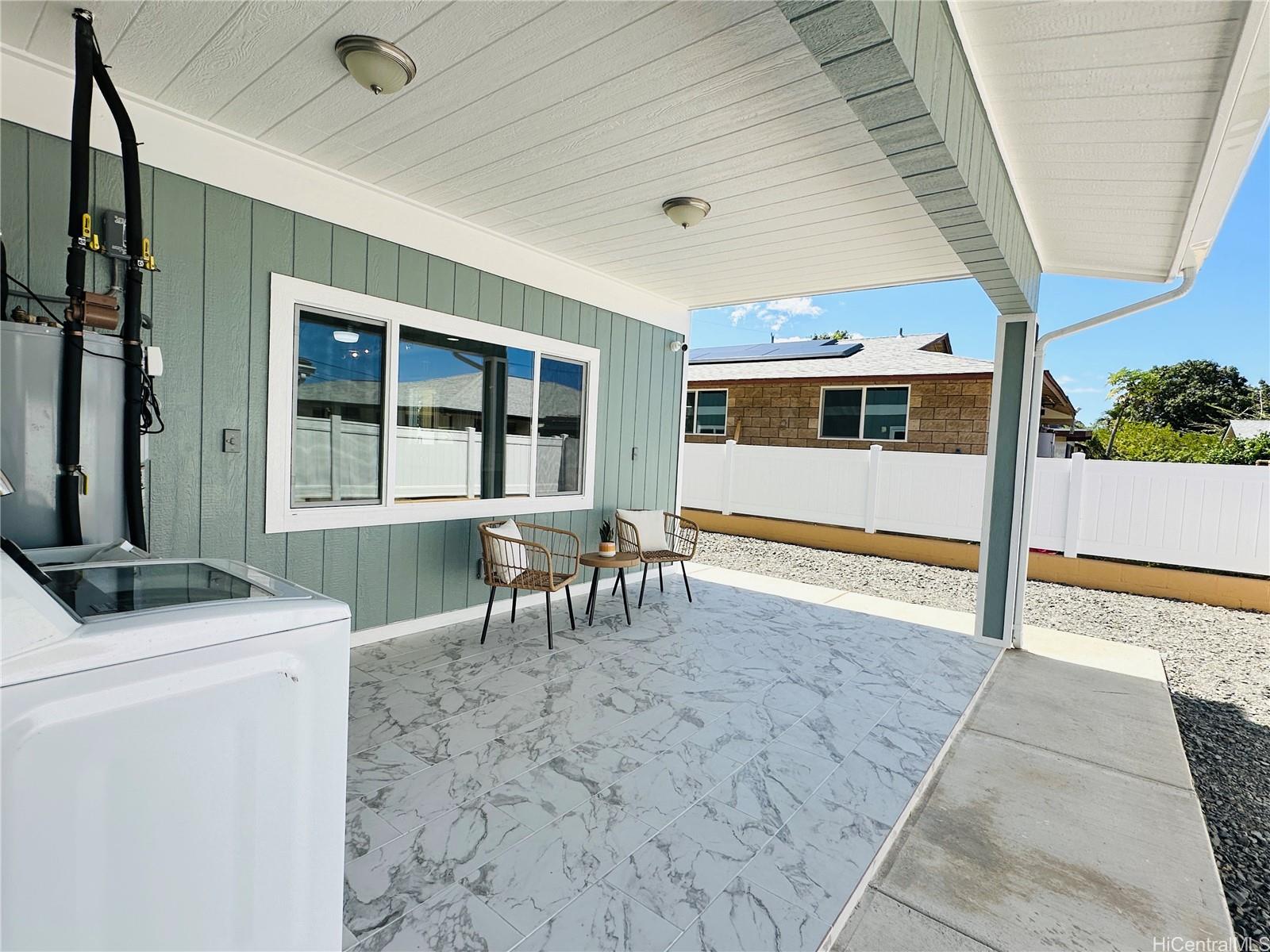 Stunning brand new constructed and beautifully designed contemporary 2-story home featuring 5 bedrooms, 4 bathrooms & 2-car garage with quality materials and finishes. Highlights include porcelain tiles, luxury vinyl plank flooring, recess lights, beautiful kitchen cabinetry & countertops, split AC, and more. Flexible floor plan, great for extended family living. Upper level: 3/2 with full kitchen, dining, living room and a spacious open lanai with stunning mountain views for unwinding after a long day. Lower level: 2/2 with wetbar, family room and a covered patio perfect for the backyard BBQ and entertaining. The open-concept kitchen flows effortlessly into the dining and living areas, creating the perfect space for family gatherings and lasting memories. Large spacious yard for entertaining or gardening. Fully fenced with a motorized gate for privacy. Conveniently located near shopping, schools, and minutes away from Pokai Bay Beach Park. CPR with no common area or HOA fees. Property tax not yet updated.