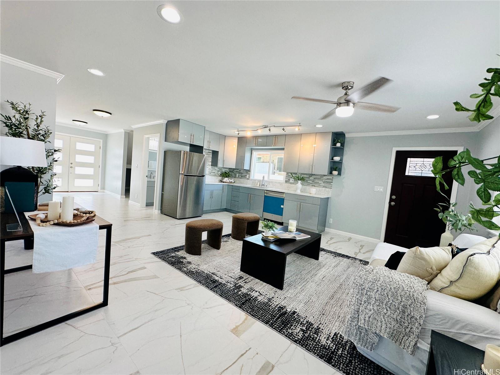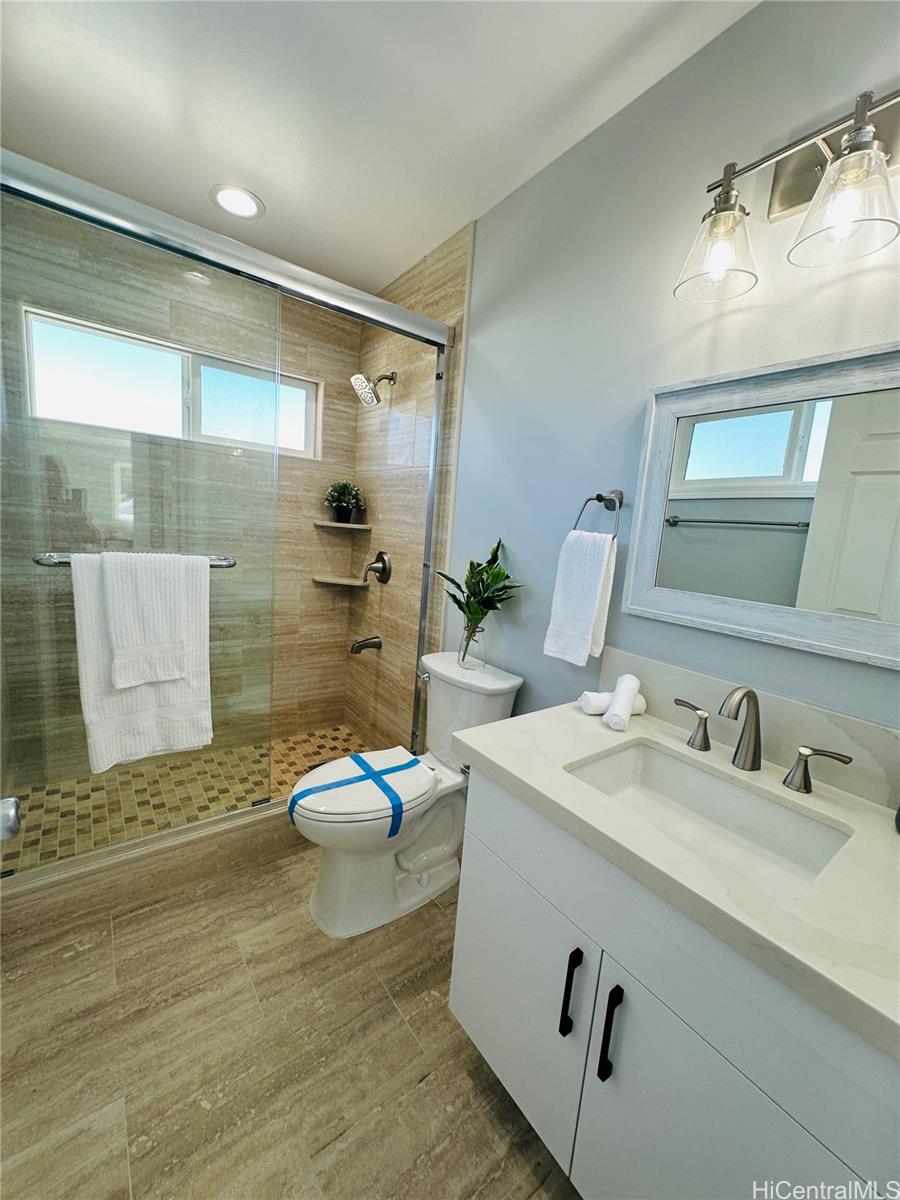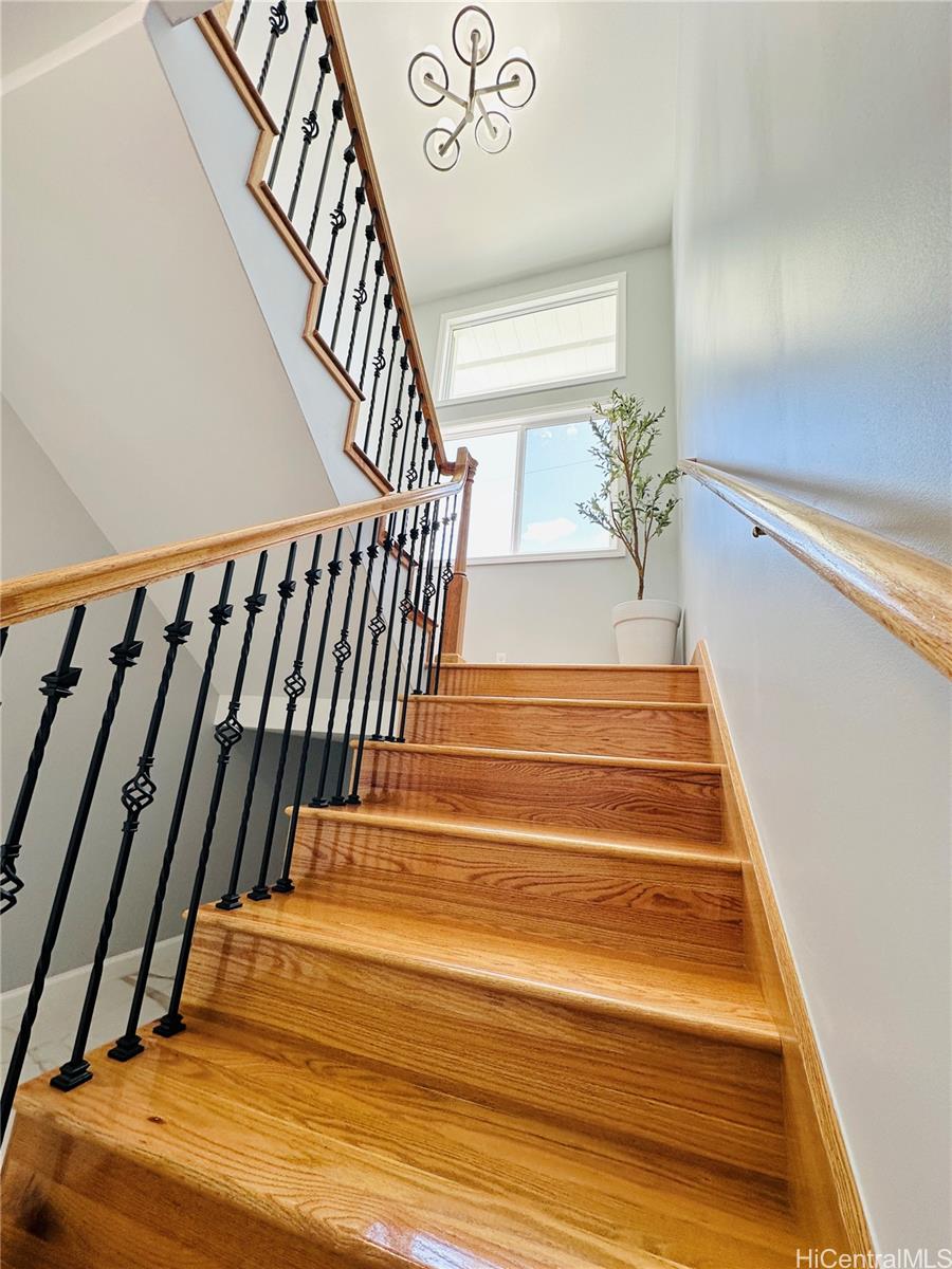 Stunning brand new constructed and beautifully designed contemporary 2-story home featuring 5 bedrooms, 4 bathrooms & 2-car garage with quality materials and finishes. Highlights include porcelain tiles, luxury vinyl plank flooring, recess lights, beautiful kitchen cabinetry & countertops, split AC, and more. Flexible floor plan, great for extended family living. Upper level: 3/2 with full kitchen, dining, living room and a spacious open lanai with stunning mountain views for unwinding after a long day. Lower level: 2/2 with wetbar, family room and a covered patio perfect for the backyard BBQ and entertaining. The open-concept kitchen flows effortlessly into the dining and living areas, creating the perfect space for family gatherings and lasting memories. Large spacious yard for entertaining or gardening. Fully fenced with a motorized gate for privacy. Conveniently located near shopping, schools, and minutes away from Pokai Bay Beach Park. CPR with no common area or HOA fees. Property tax not yet updated.