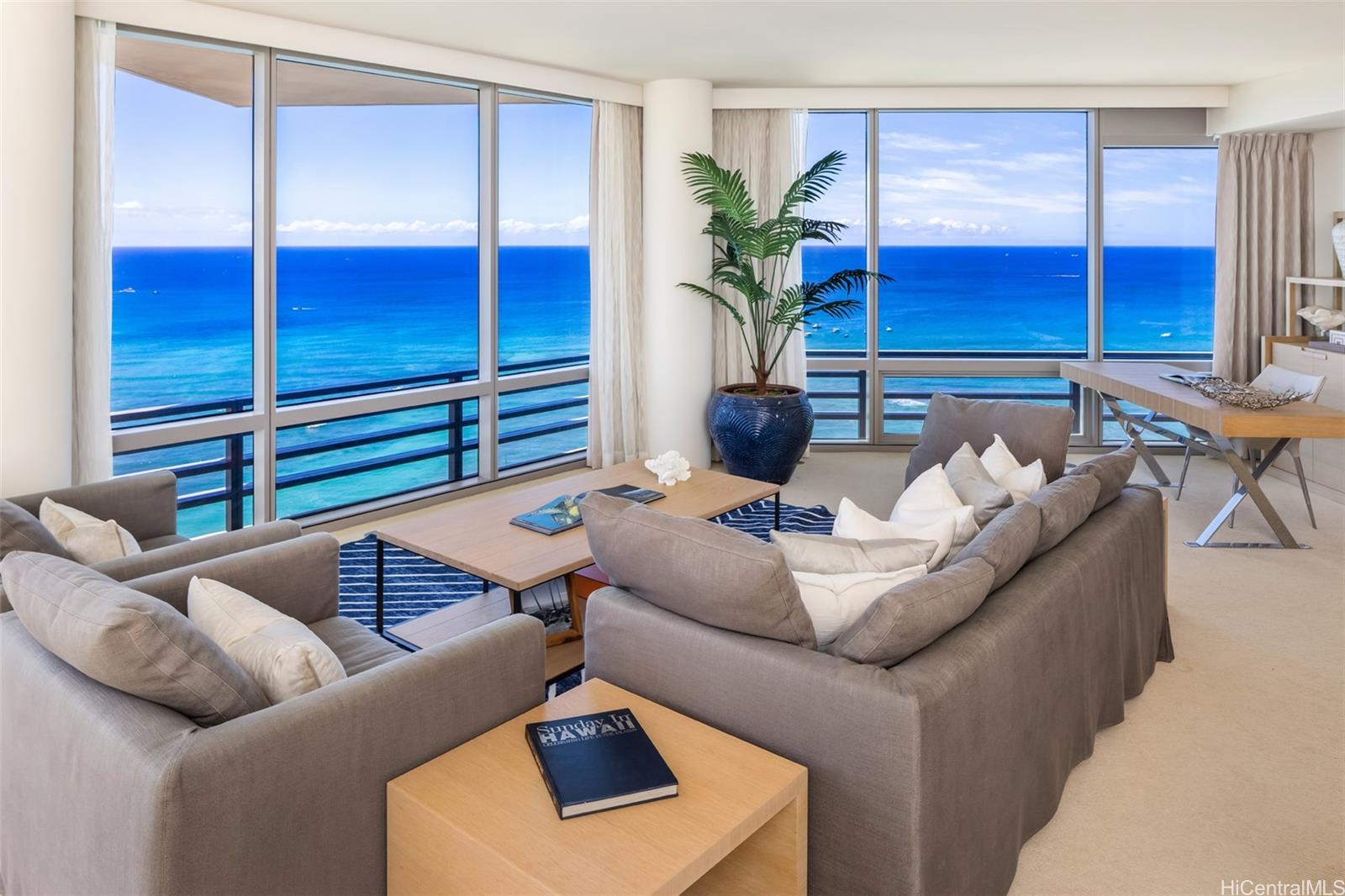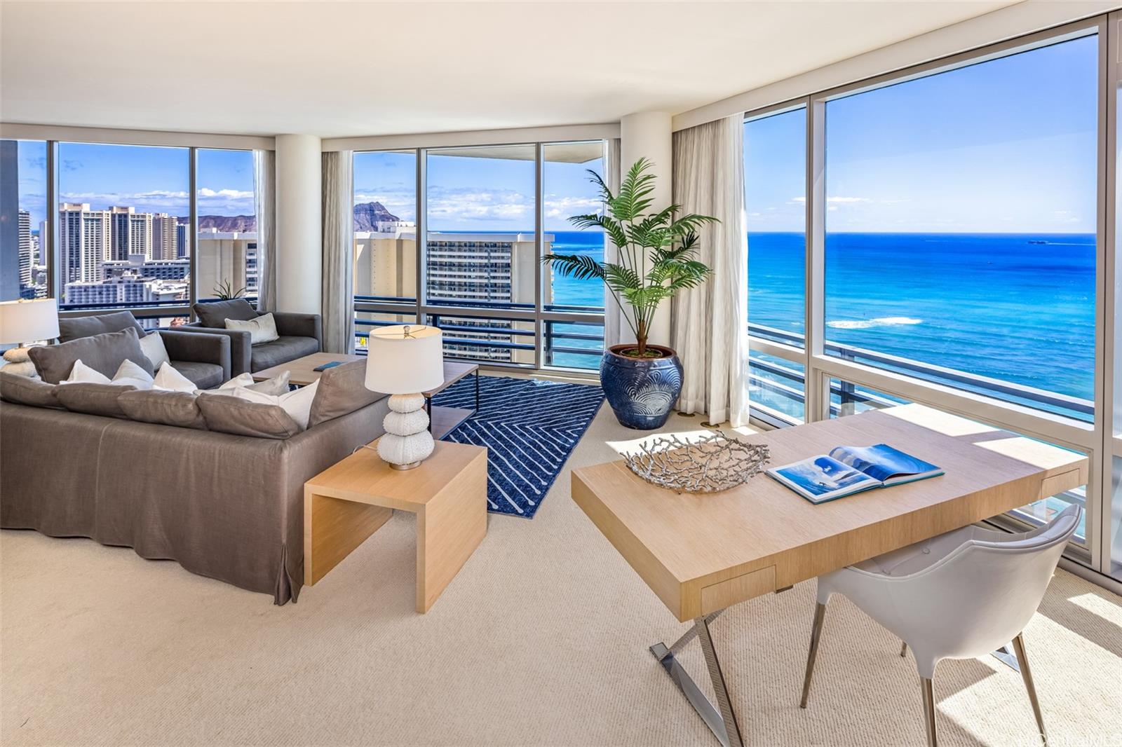 Perched on a high floor, this residence showcases breathtaking, uninterrupted views of the Pacific Ocean, the iconic Diamond Head and Koko Head, a beautiful coastline and the sunset that will be unforgettable. You will also enjoy a sparkle of Friday night fireworks lighting up the horizon.