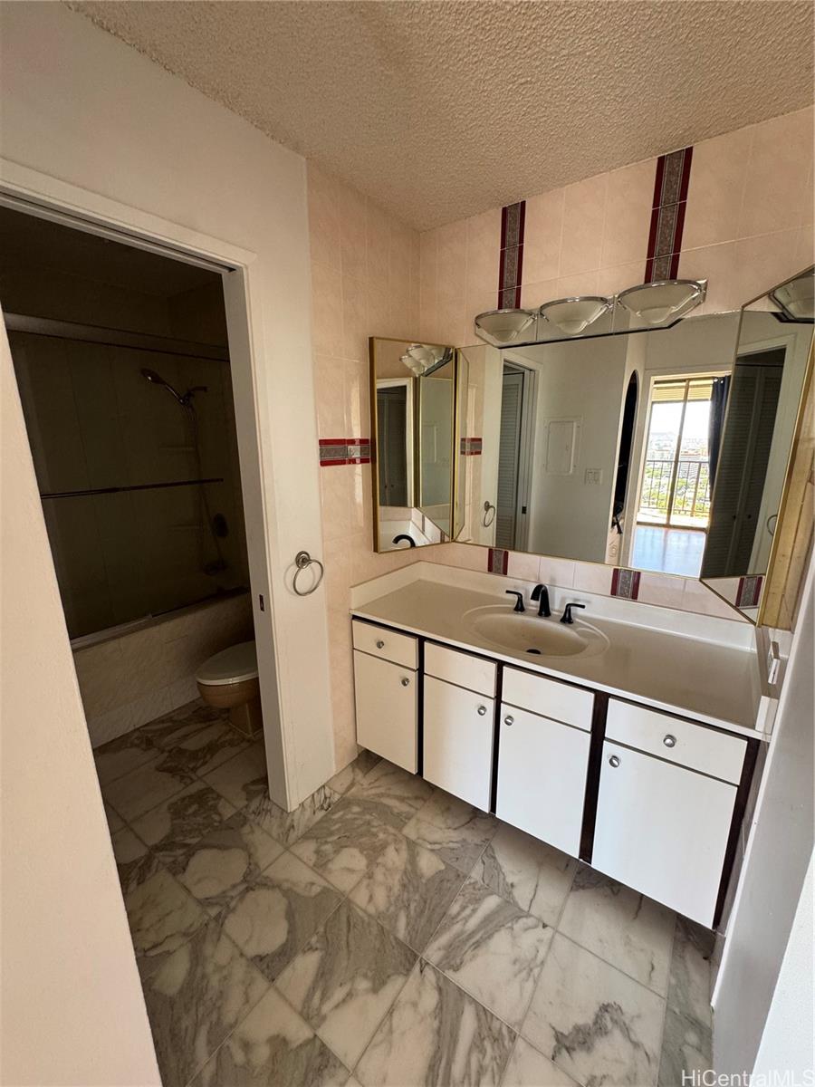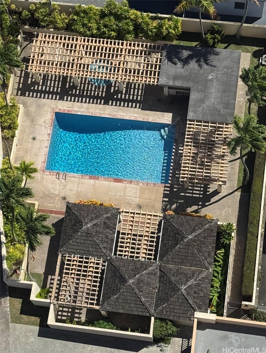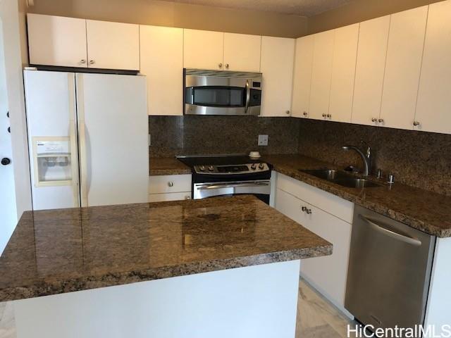 広々としたワンベッドルームには、独立した書斎/オフィスエリアがあり、この部分はラナイの一部が閉鎖されているため、767平方フィートの広さがあります。また、海と山の景色を望む162平方フィートの素敵な広いラナイもあります。セキュリティ付きの建物で、屋根付きのガレージ駐車場#229も完備しています。ショッピング、高速道路、バス停、学校にも近いです。リフォーム済みのラミネートフロア、キッチンにはステンレス製の電化製品、朝食と夕食に使える花崗岩のカウンターがあります。洗濯機、乾燥機、冷蔵庫も新品です。涼しい風が吹き抜ける明るい空間です。設備の整ったプール、サウナ、ジャグジー、常駐管理人付き。高速道路、ショッピング、学校、消防署へのアクセスも抜群です。