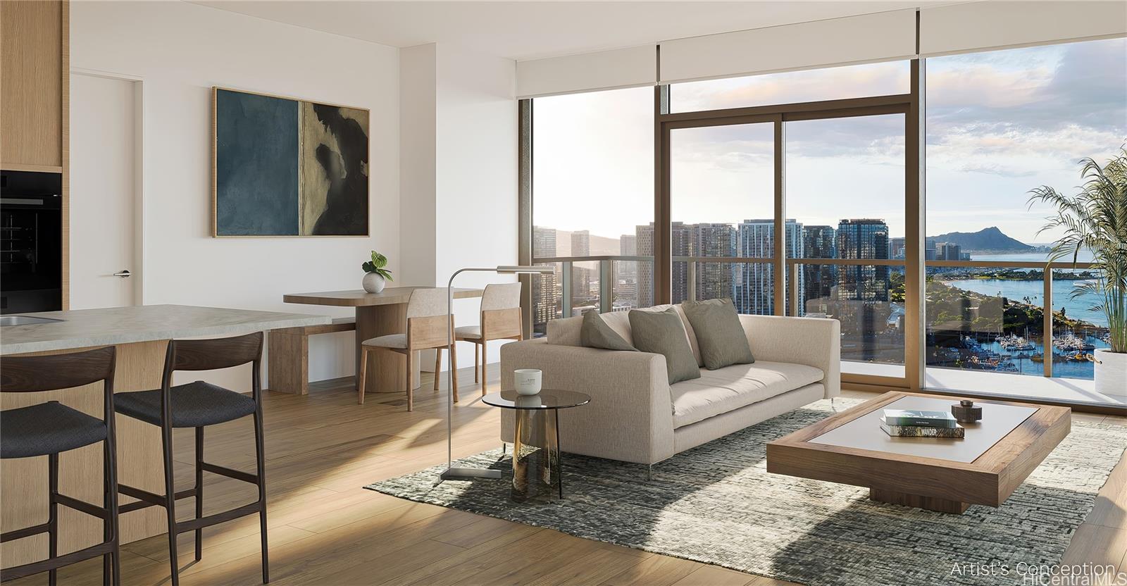 Located on front row Ala Moana Blvd. in vibrant Kaka‘ako. Kali‘u, when completed, will feature a modern coastal living setting rooted in balance. This Signature East facing 2/2.5 residence (Type B 1,146sf) offers boutique island living with a focus on personal well-being. breathtaking views, soaring 9' ceilings, full-height windows, pristine ocean vistas, engineered wood flooring, and a private lanai for seamless indoor-outdoor living. The kitchen is a chef's dream with modern custom cabinetry, premium Miele appliances, a full-height wine column, and natural stone countertops. The spa-like primary bath serves as a personal retreat, complete w/ TOTO fixtures, elegant rain shower. Wellness-inspired amenities elevate the experience further, including an infinity-edge pool, hot/cold plunge pools, private massage rooms, pickleball court, fitness ctr., outdoor BBQ cabanas & indoor entertainment spaces featuring a chef’s kitchen. Kali‘u provides the perfect setting for a life well lived. Est. completion: Summer 2028.