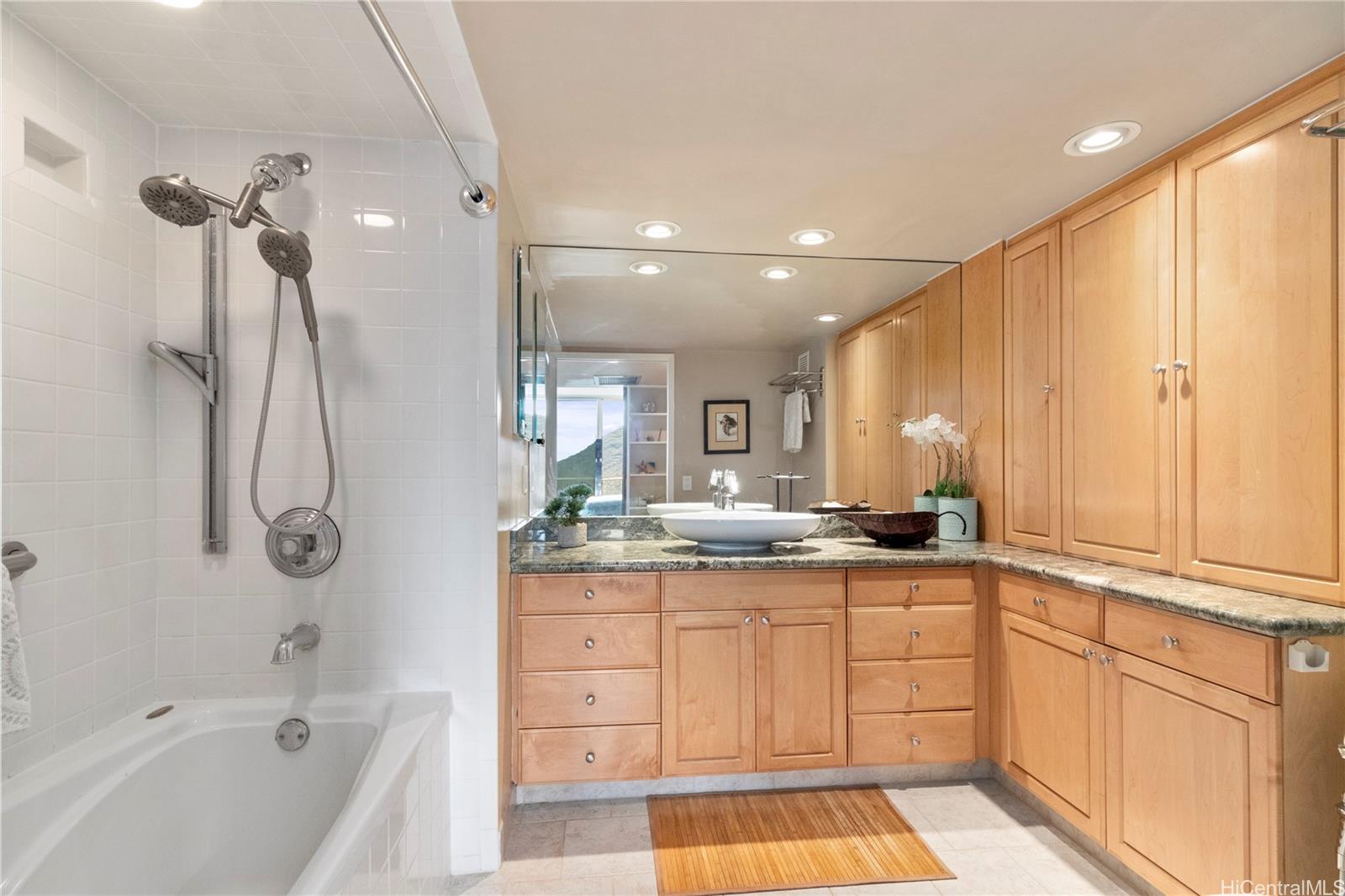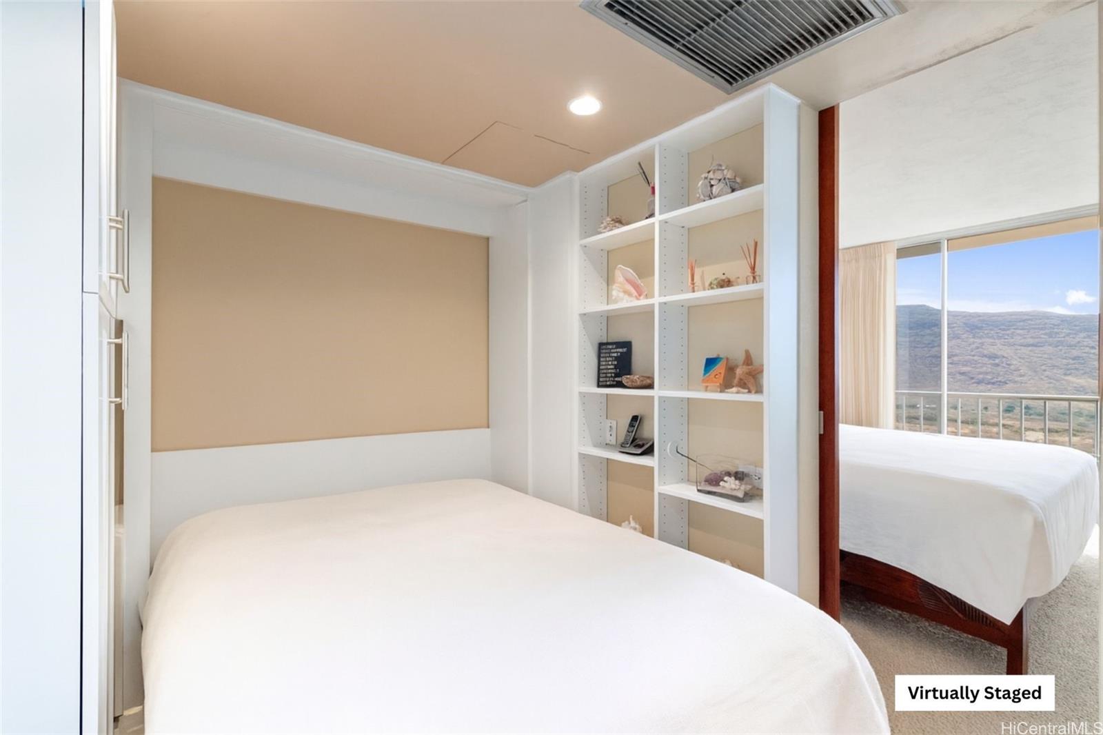 Soffits removed allowing cabinets to reach to the ceiling. Bathroom door was removed & replaced w/a 36-in. pocket door, & one dressing room closet was removed & replaced w/built-in shelving/wall unit that includes a pull-down bed. Original Shoji door replaced w/elegant solid mahogany & fogged glass, & an extra Shoji door added in bedroom for privacy.