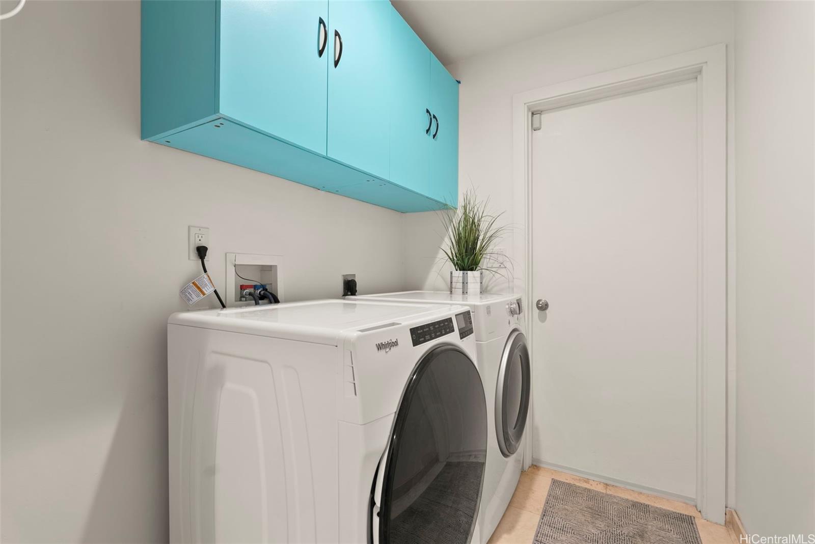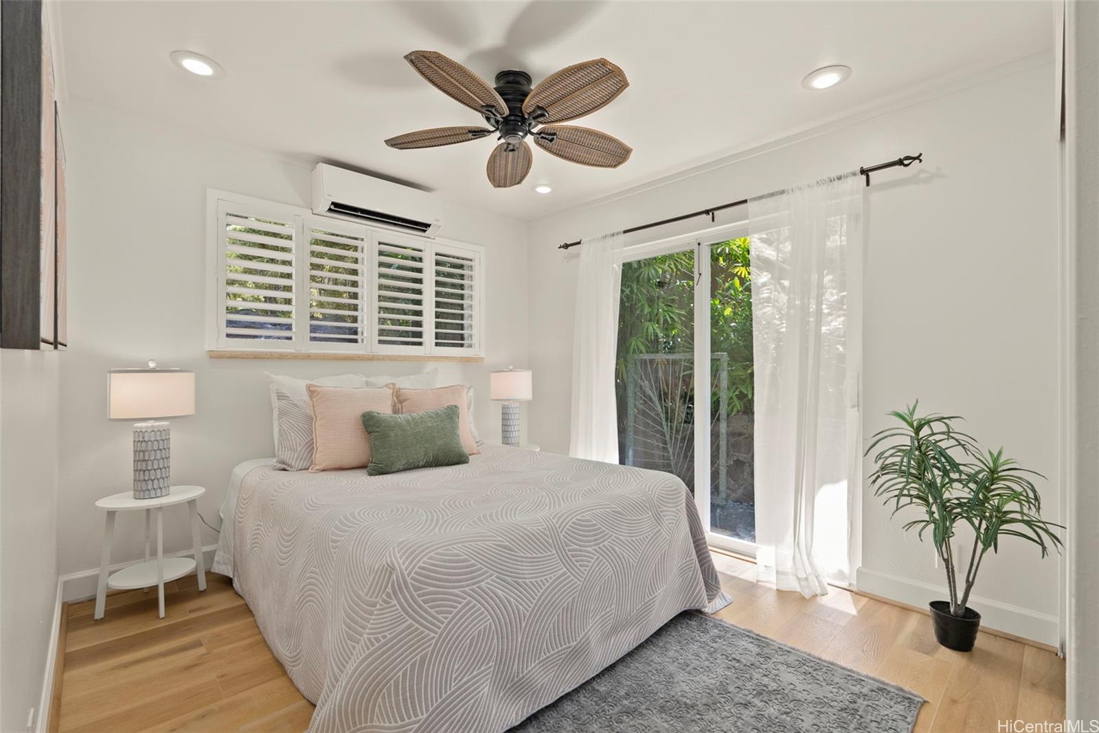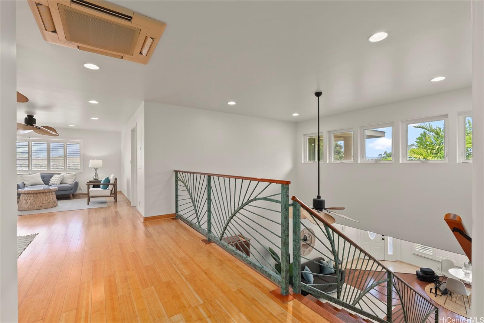 Both levels offer a primary suite, two additional bedrooms (three per floor), a washer and dryer, and generous living areas — ideal for multi-generational living or hosting with ease. The upper level features a wet bar and flexible lounge space, perfect for a media room, game room, or private guest retreat. Throughout the home, there is rich hardwood and bamboo flooring while the chef-inspired kitchen boasts stainless steel appliances and wrap-around countertops. Energy efficiency with an owned photovoltaic system featuring 32 net-metered panels. All of this is set in Enchanted Lake close to dining and shopping, premier golf courses, and some of Oahu’s most beautiful beaches.