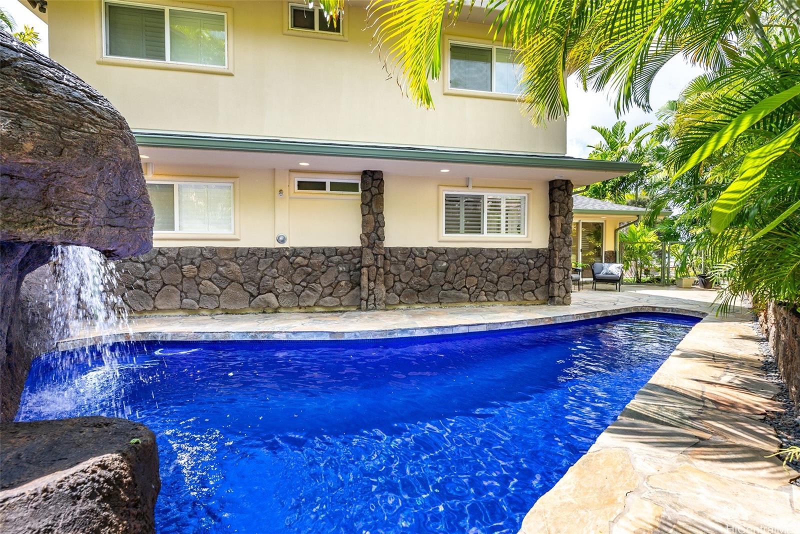 Experience island living with this turn-key 6-bedroom, 4-bath Kailua retreat! Located on a private cul-de-sac, this home offers a resort-style lifestyle with a pool, waterfall feature, and lush tropical landscaping — creating a private oasis perfect for relaxing or entertaining. The spacious floor plan connects open living and dining spaces to outdoor lounging areas, including a pool deck, garden sanctuary with mango trees, and gazebo with sweeping views of the majestic Ko Olau mountain range.