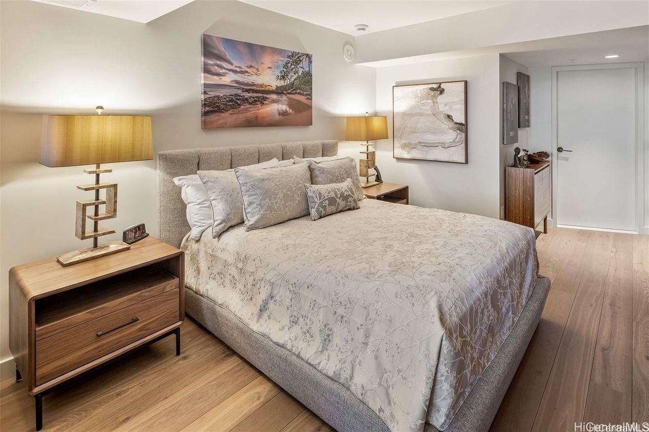 The unit comes fully furnished, including high-end furniture, designer lighting, custom artwork, linens, and kitchenware. The spacious bedroom area adjoins an ultra-luxurious bathroom with a deep soaking tub, separate walk-in shower, and double vanity.
