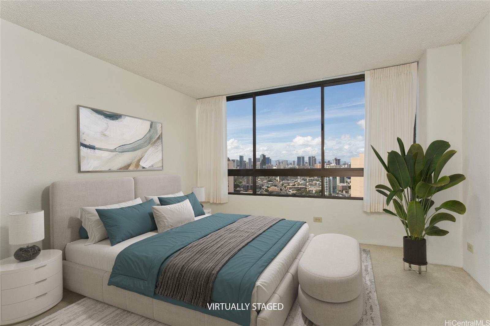 Discover comfort, convenience, privacy, & views—all in one exceptional home. Spacious 2-bed, 2-bath residence offering larger living space & stunning views of the mountains & Waikiki. Beautifully renovated and well maintained, end-unit located on the quiet side. The building is currently being upgraded with new plumbing—already completed for this unit. The list price factors in the special assessment, which will be buyer's responsibility. 100% hurricane insurance and sprinklers. HOA covers elect. water, sewer, cable, & internet. A fantastic variety of amenities inc.pool, sauna, jacuzzi, tennis & pickleball courts, putting green, bbq, car wash station, guest parkings, & more for everyday enjoyment. Centrally located, easy access to major bus routes, shops, school, H-1 and restaurants.