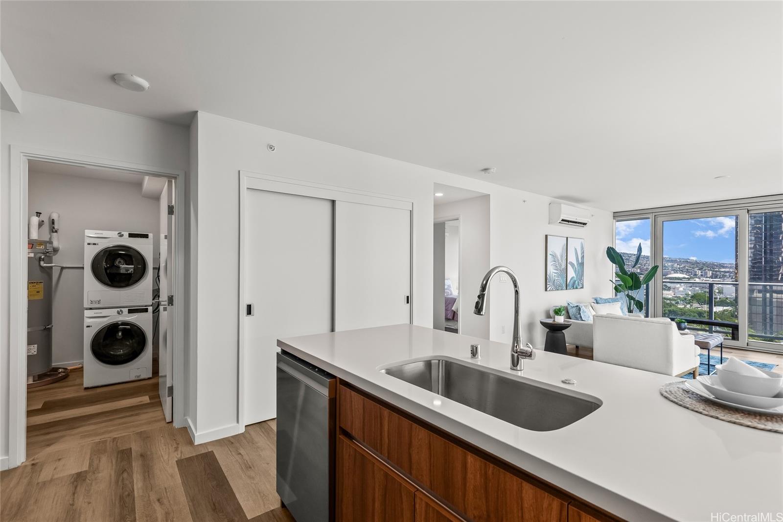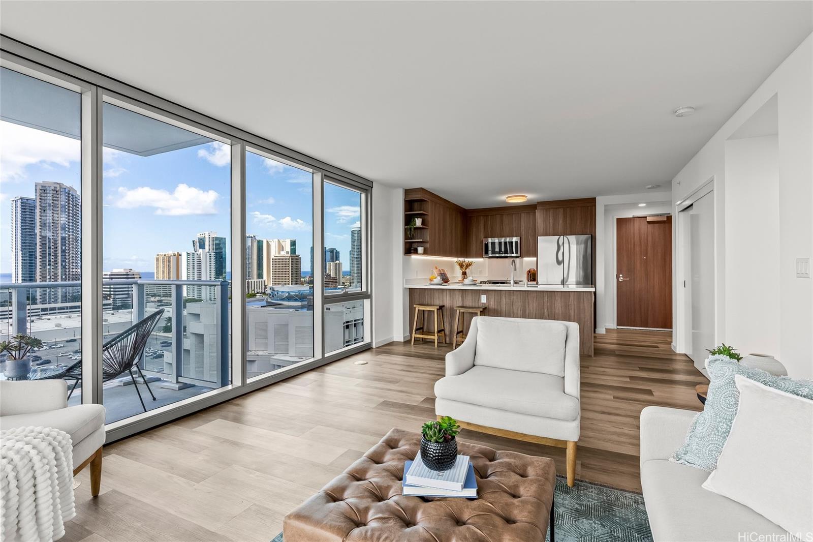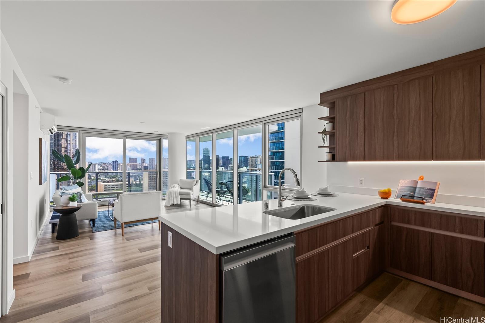 Experience modern island living at The Park on Keeaumoku #1801 in the Liona Tower, Honolulu’s newest condominium community. This highly desired corner-end “01” stack features the second largest two-bedroom floor plan with an expansive wraparound lanai showcasing panoramic views of the mountains, Diamond Head, and the ocean. Located on the preferred cooler side of the building, enjoy excellent trade winds and comfortable island breezes throughout the day. The Park on Keeaumoku offers resort-style amenities including a pool, fitness center, private cabanas, walking paths, and inviting gathering areas—all set within Honolulu’s vibrant metro hub near Ala Moana and Kapiolani. Two side-by-side parking stalls are conveniently located near the building entrance, offering comfort and accessibility in one of Honolulu’s most dynamic new communities. Whether you’re seeking a stylish new home or a smart investment, The Park on Keeaumoku allows for mid-term and long-term rentals, making it an excellent choice for both owner-occupants and investors. VA APPROVED and Pet-Friendly building.