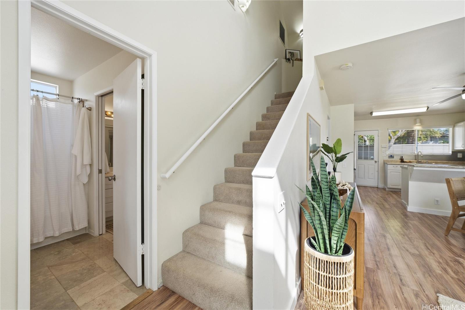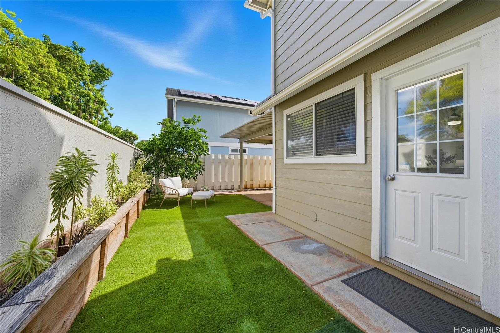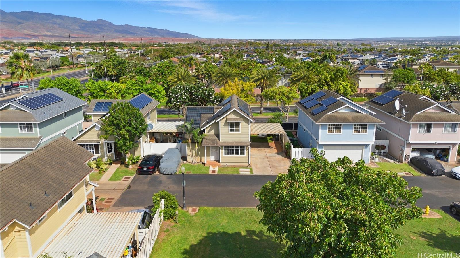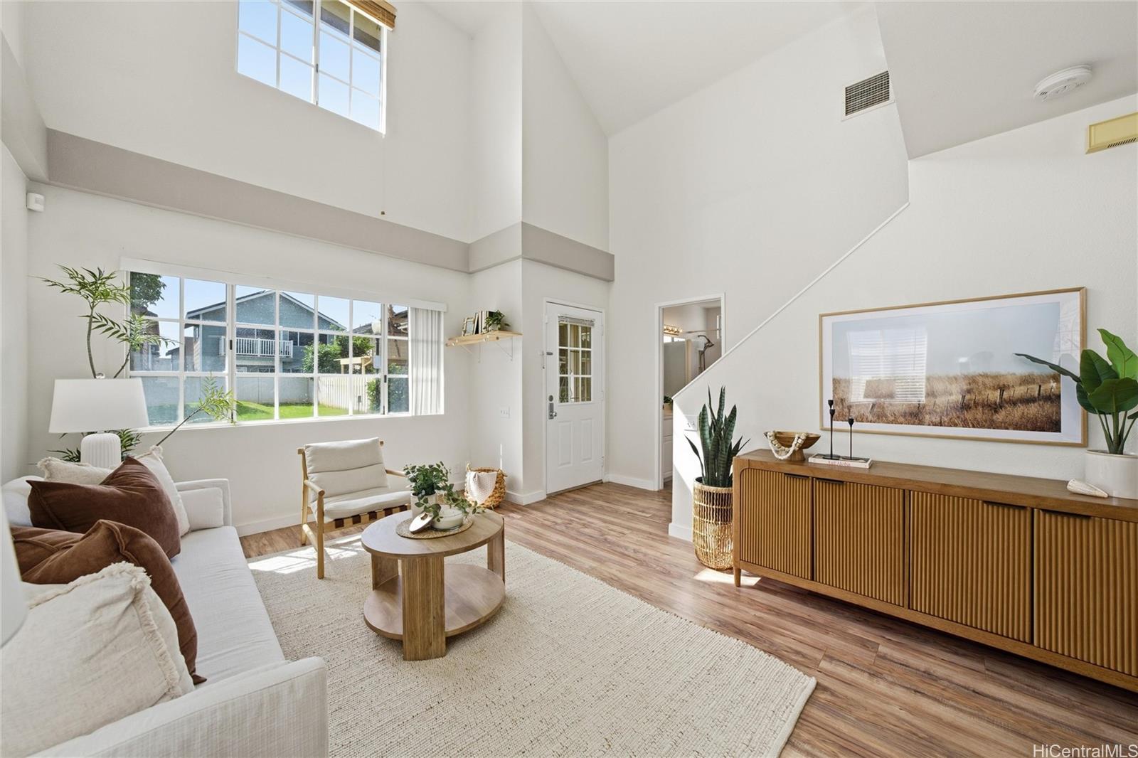 Price Improvement! This beautifully maintained 2-bedroom, 2-bath home features a spacious layout with vaulted ceilings, central air conditioning, and sleek vinyl laminate flooring. The primary suite with a full ensuite bath is conveniently located on the first floor, while the second bedroom and full bath offer privacy upstairs. Enjoy the convenience of a 2-car carport plus two additional driveway spaces, along with guest parking nearby. Positioned across from a lush green open space, this home offers a peaceful setting in a thriving community. Modern upgrades include updated appliances and a powerful energy-efficient setup with 21 owned photovoltaic panels and 2-Tesla Powerwall batteries—helping you save on utilities. Located in the heart of Ewa, you're just minutes from shopping, dining, entertainment, banks, the post office, and public transportation. BONUS: This property comes with a VA assumable loan at an incredibly low 2.25% interest rate. This is an exceptional opportunity for qualified VA buyers. Maintenance Fee will actually be DECREASING to $400.17 in January 2026!