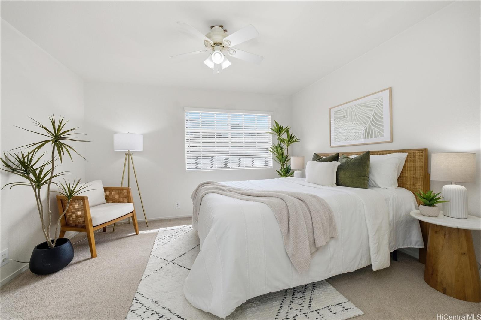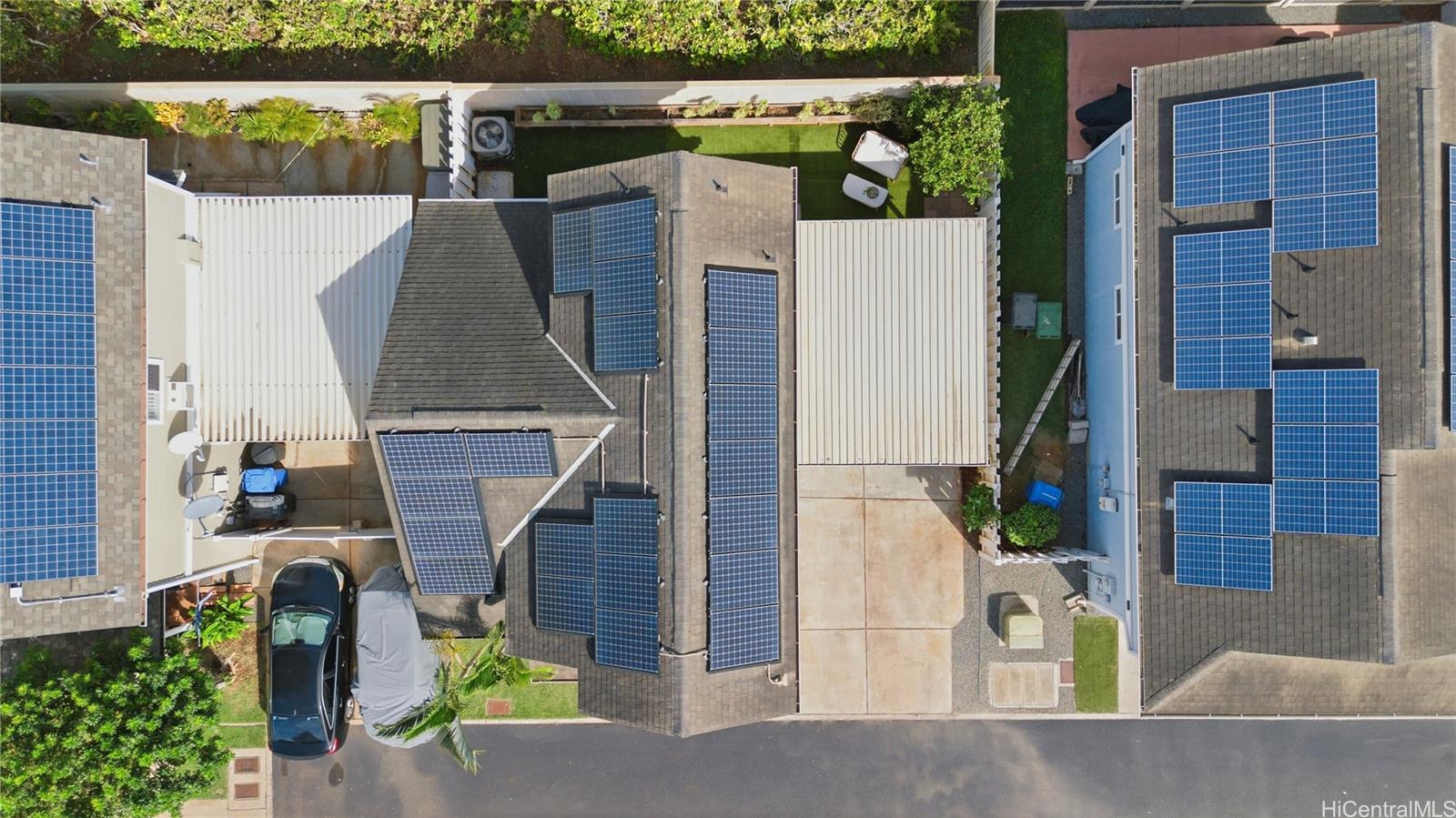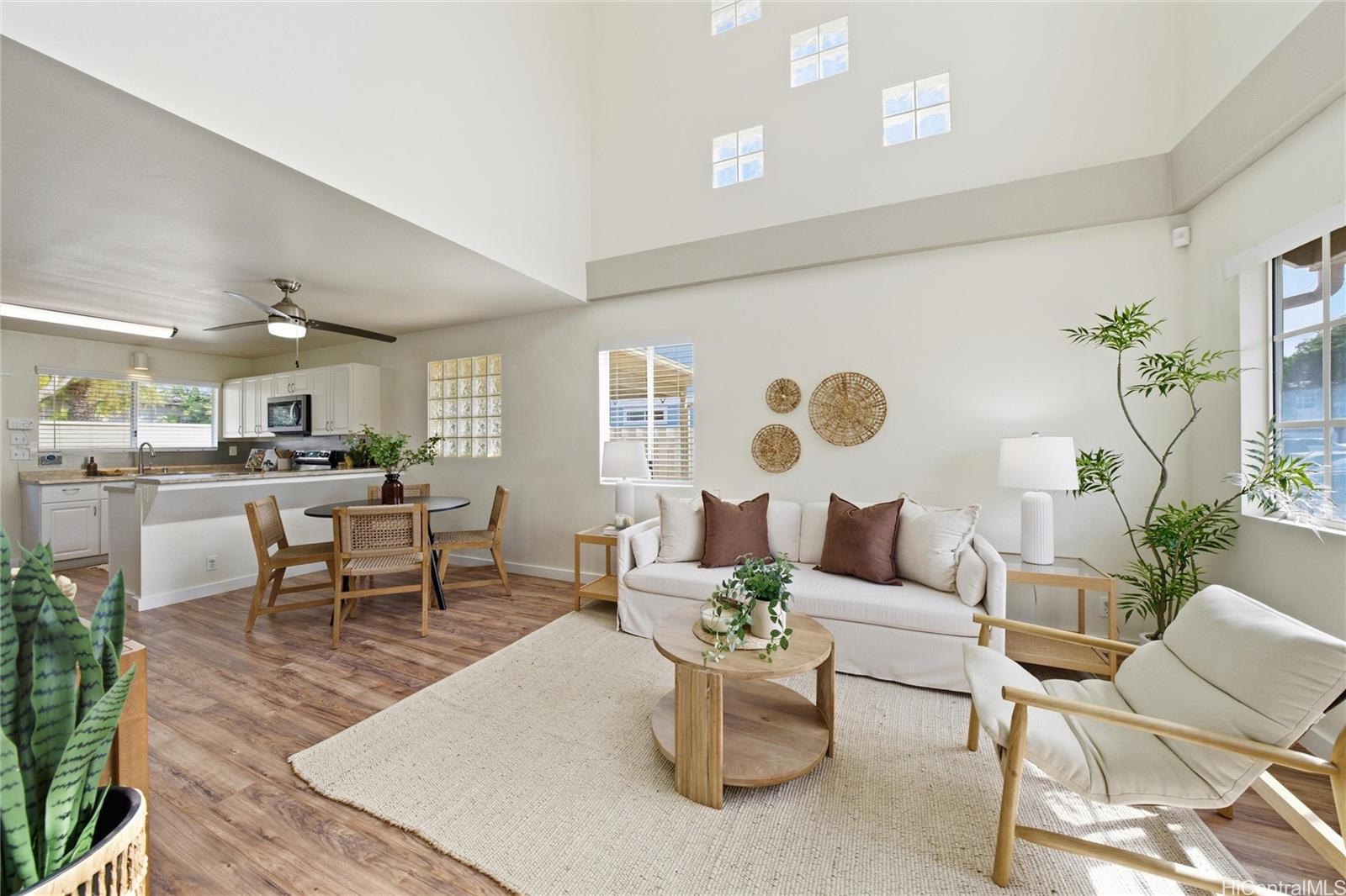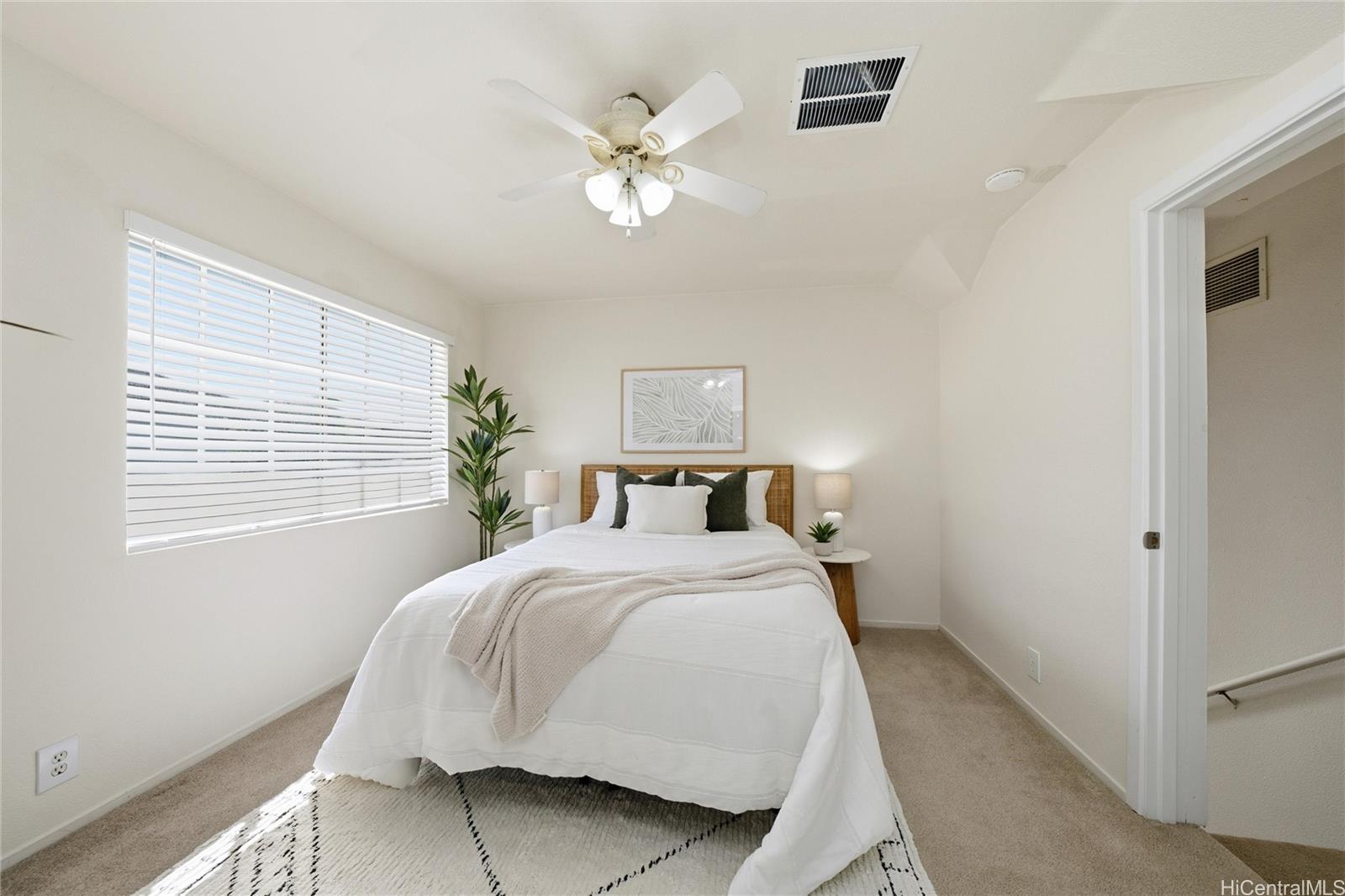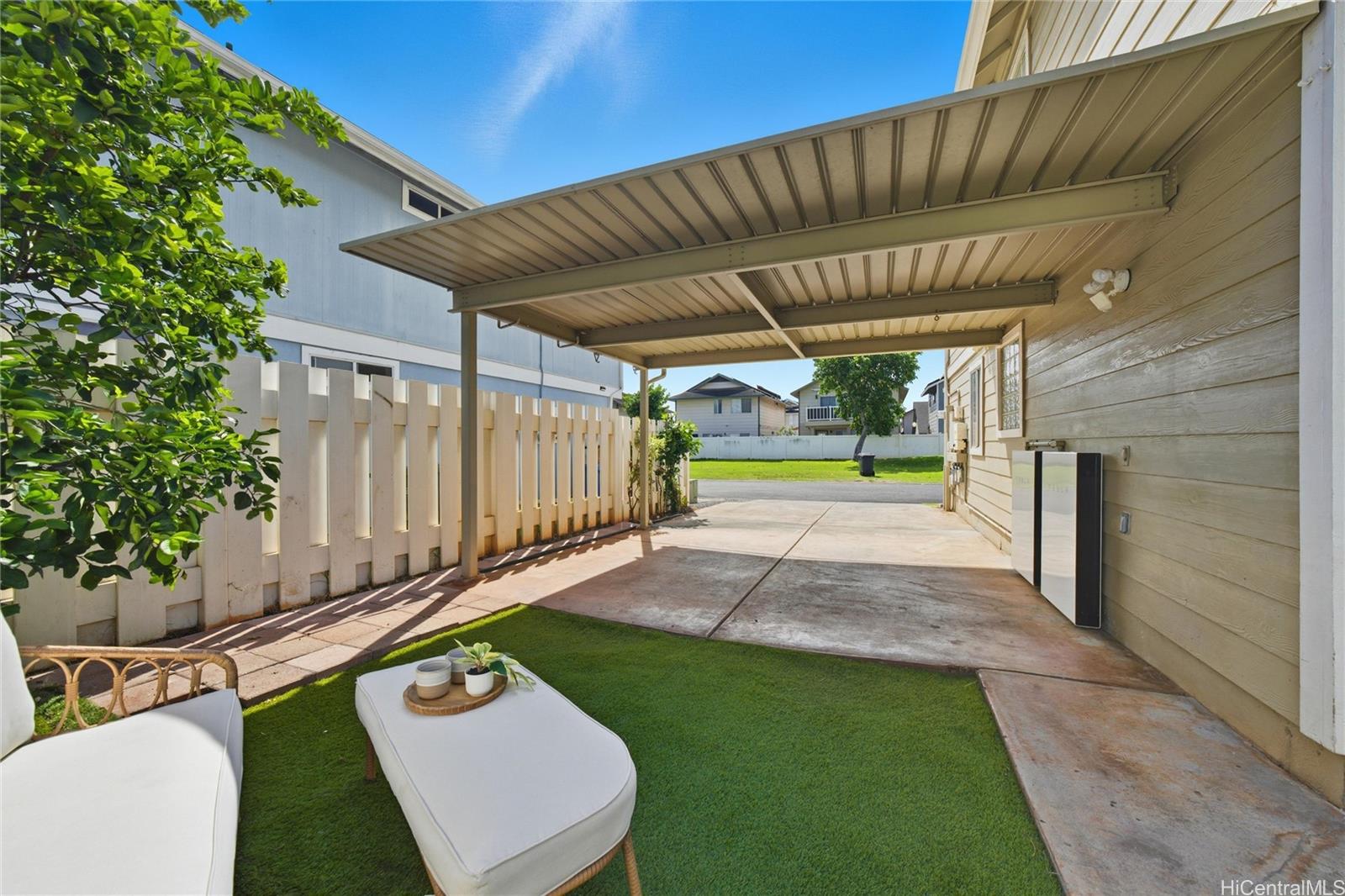 Price Improvement! This beautifully maintained 2-bedroom, 2-bath home features a spacious layout with vaulted ceilings, central air conditioning, and sleek vinyl laminate flooring. The primary suite with a full ensuite bath is conveniently located on the first floor, while the second bedroom and full bath offer privacy upstairs. Enjoy the convenience of a 2-car carport plus two additional driveway spaces, along with guest parking nearby. Positioned across from a lush green open space, this home offers a peaceful setting in a thriving community. Modern upgrades include updated appliances and a powerful energy-efficient setup with 21 owned photovoltaic panels and 2-Tesla Powerwall batteries—helping you save on utilities. Located in the heart of Ewa, you're just minutes from shopping, dining, entertainment, banks, the post office, and public transportation. BONUS: This property comes with a VA assumable loan at an incredibly low 2.25% interest rate. This is an exceptional opportunity for qualified VA buyers. Maintenance Fee will actually be DECREASING to $400.17 in January 2026!