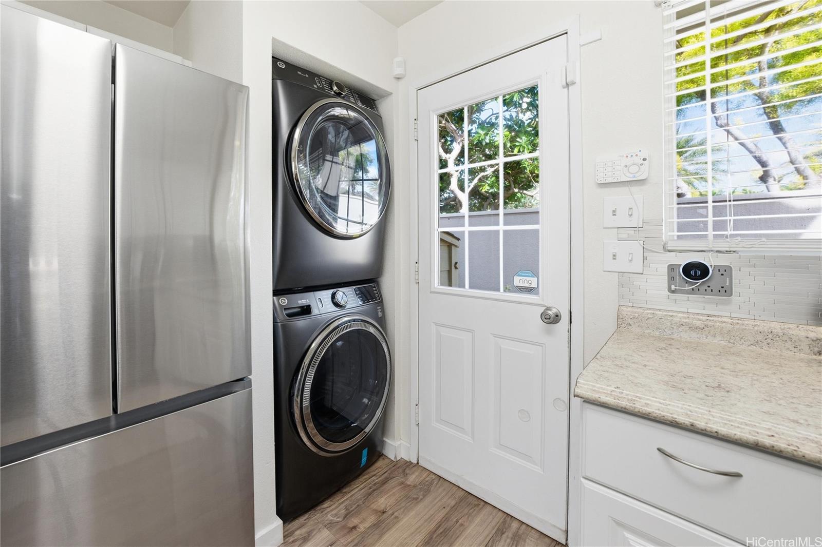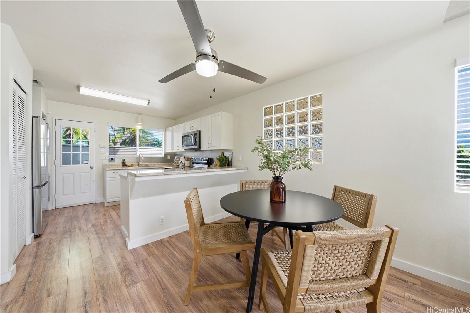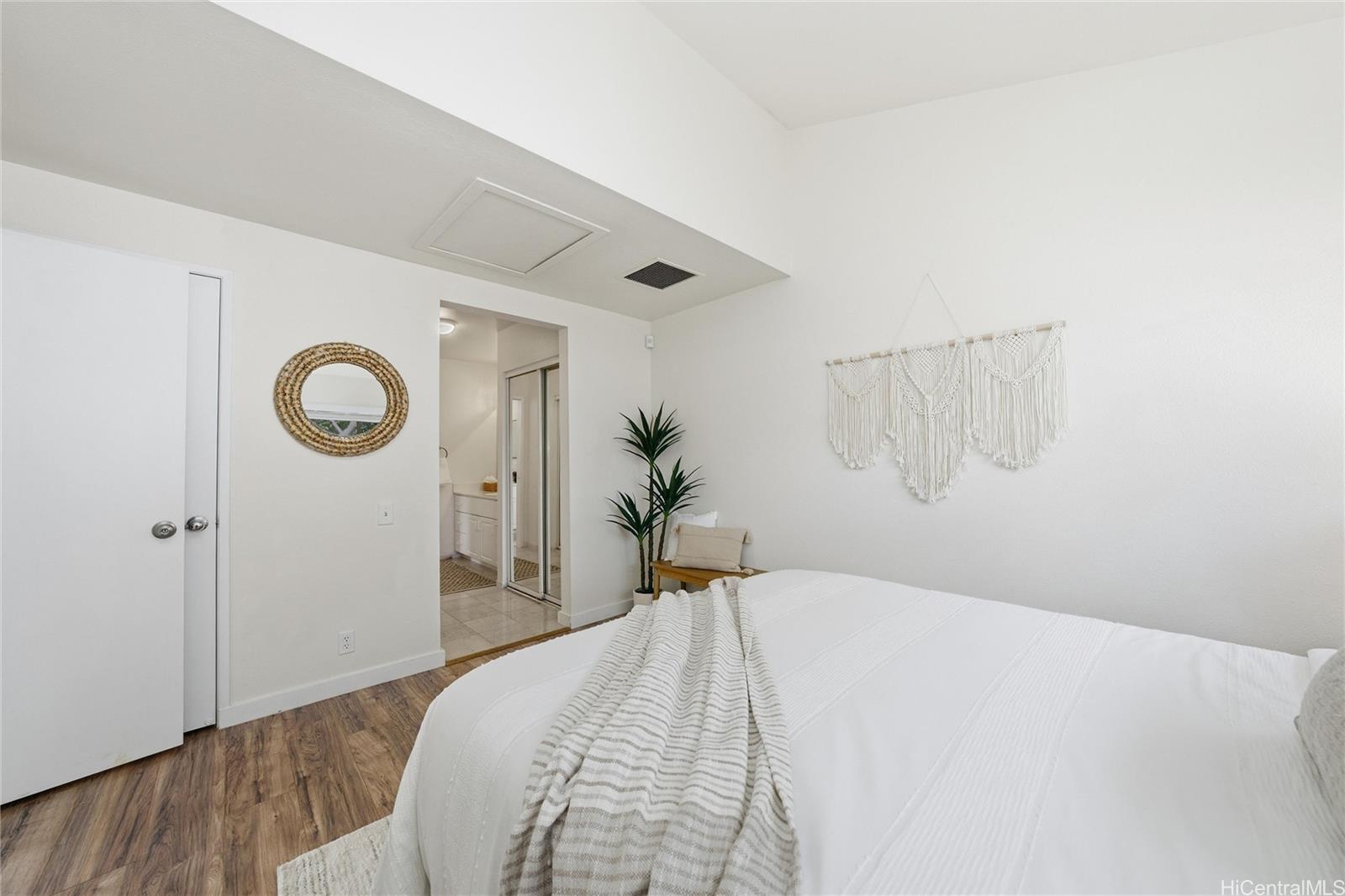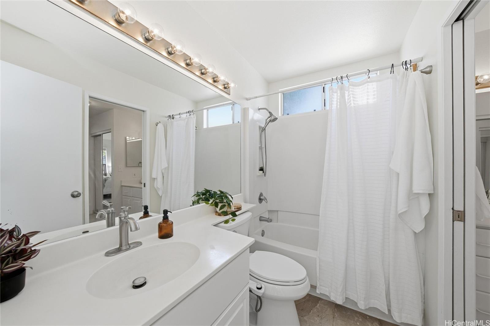 Price Improvement! This beautifully maintained 2-bedroom, 2-bath home features a spacious layout with vaulted ceilings, central air conditioning, and sleek vinyl laminate flooring. The primary suite with a full ensuite bath is conveniently located on the first floor, while the second bedroom and full bath offer privacy upstairs. Enjoy the convenience of a 2-car carport plus two additional driveway spaces, along with guest parking nearby. Positioned across from a lush green open space, this home offers a peaceful setting in a thriving community. Modern upgrades include updated appliances and a powerful energy-efficient setup with 21 owned photovoltaic panels and 2-Tesla Powerwall batteries—helping you save on utilities. Located in the heart of Ewa, you're just minutes from shopping, dining, entertainment, banks, the post office, and public transportation. BONUS: This property comes with a VA assumable loan at an incredibly low 2.25% interest rate. This is an exceptional opportunity for qualified VA buyers. Maintenance Fee will actually be DECREASING to $400.17 in January 2026!