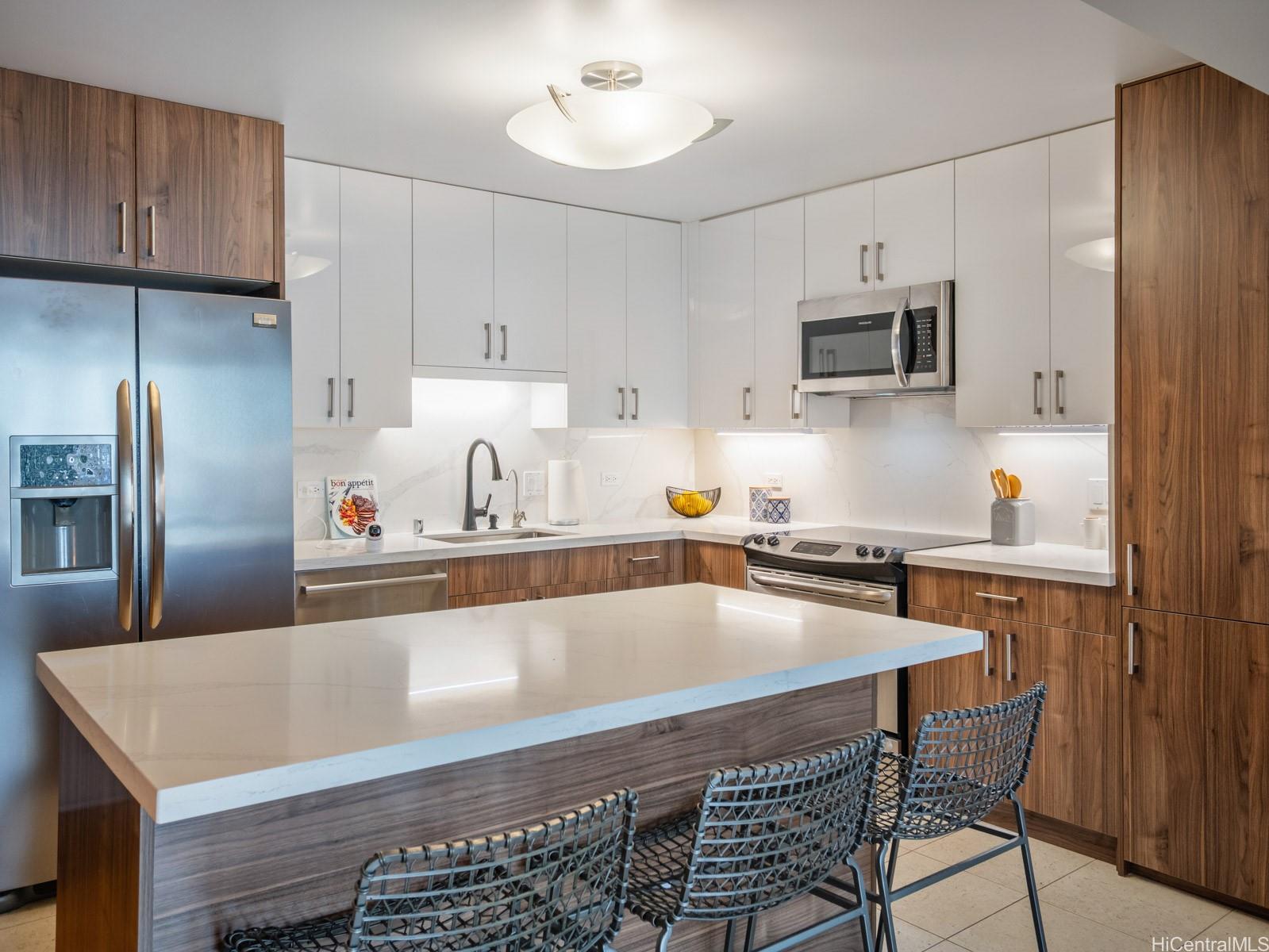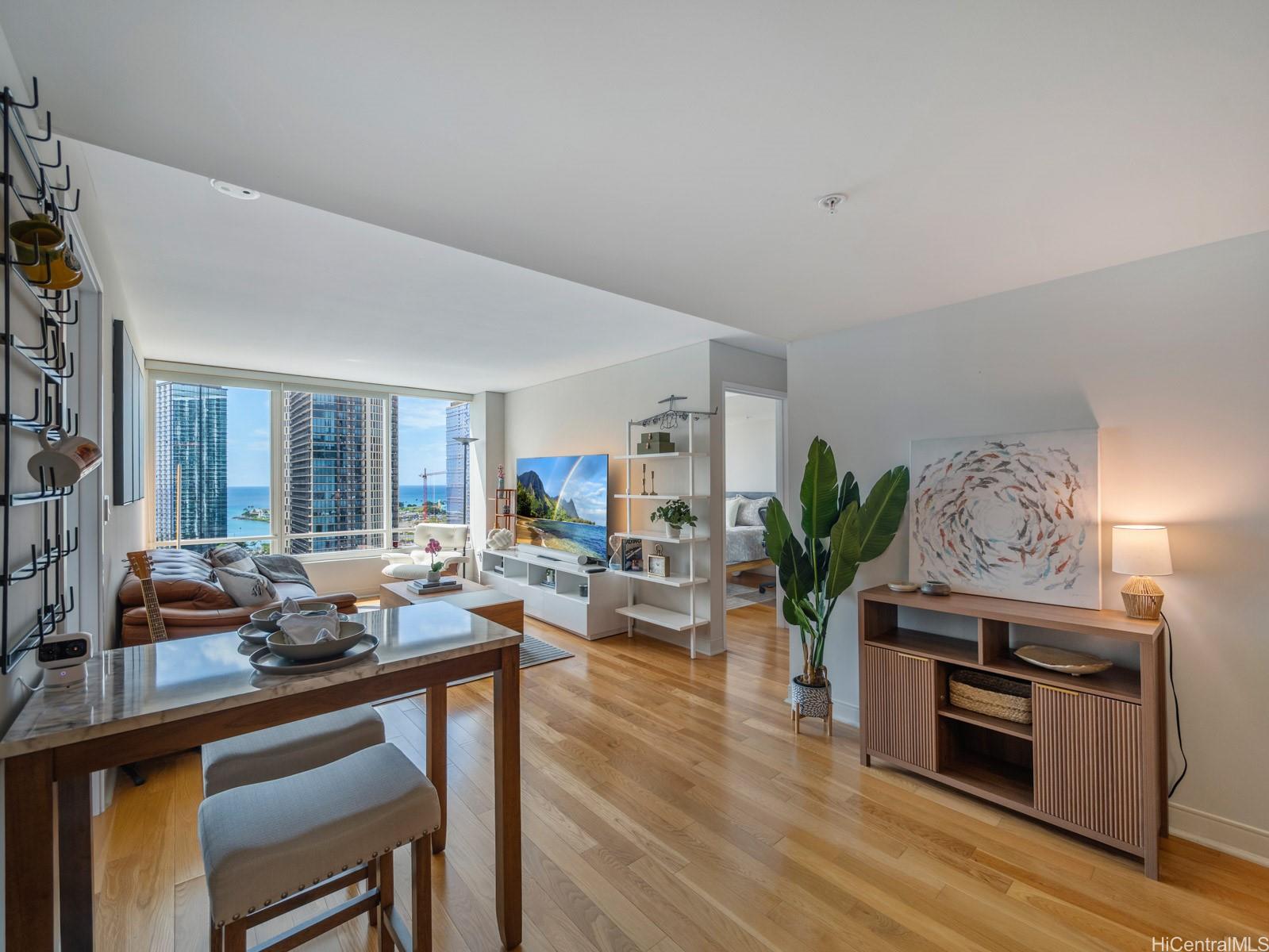 This upgraded 2-bedroom, 2-bath residence on the 26th floor of Pacifica Honolulu features a flexible alcove- prefect for a home office or den- plus expansive windows that flood the living spaces with natural light and showcases sweeping ocean and city views. Enjoy a brand-new kitchen, wood flooring, built-in cabinetry, and an in-unit washer/dryer. Comes with two tandem parking stalls. Ideally located near Ala Moana Center, Whole Foods, Ward Village, beaches, and surf spots- with Blaisdell Center just across the way for concerts and farmer's markets. Resort-style amenities include a full gym, sauna, pool, hot tub, BBQ areas, poolside cabanas, dog park, theater rooms, and multiple lounge areas. Pacifica is secure, pet-friendly, and offers 24-hour front desk service- convenient, comfortable living in the heart of Honolulu.