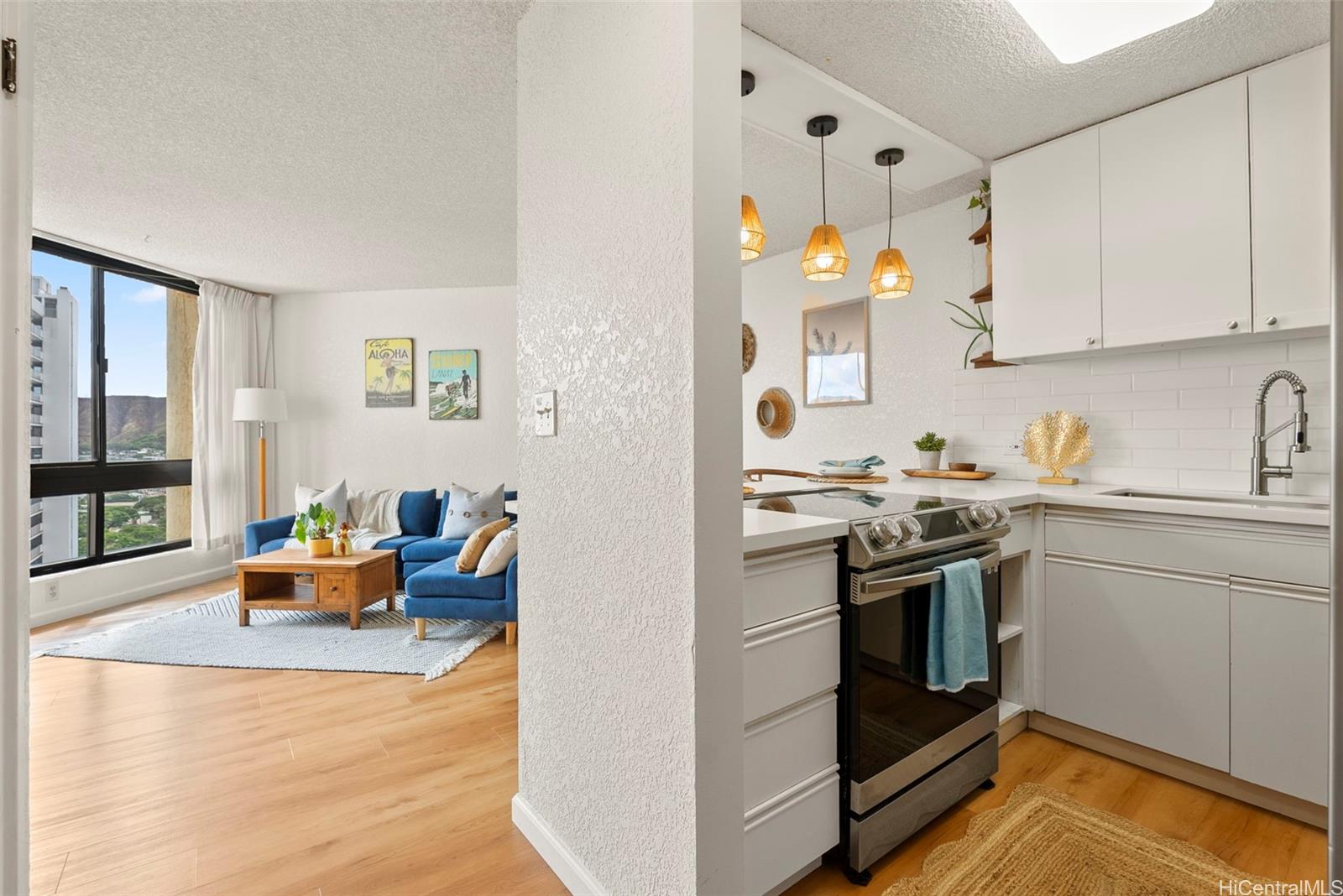 Welcome to Liliuokalani Gardens, one of Waikiki’s most sought-after residences! This 1-bedroom, 1-bath unit with one parking stall is located on the preferred stack with stunning, unobstructed views of Diamond Head, sunrise, ocean, mountains, and Waikiki city lights. Enjoy an open-concept living area with a refreshed kitchen, new stainless steel appliances, fresh paint, and central AC to keep things cool. The newly renovated bathroom features beautiful tile work and modern finishes. Relax and take in Diamond Head & amazing sunrise views from your living room or right from your bed. The building offers resort-style amenities — a sparkling pool, sauna, tennis courts, BBQ areas, EV Chargers, and 24-hour security — all surrounded by lush tropical grounds and koi ponds. Perfectly located near Waikiki Beach, Kapi'olani Park, the Honolulu Zoo, & Diamond Head. This complex is 100% hurricane insured and VA approved!