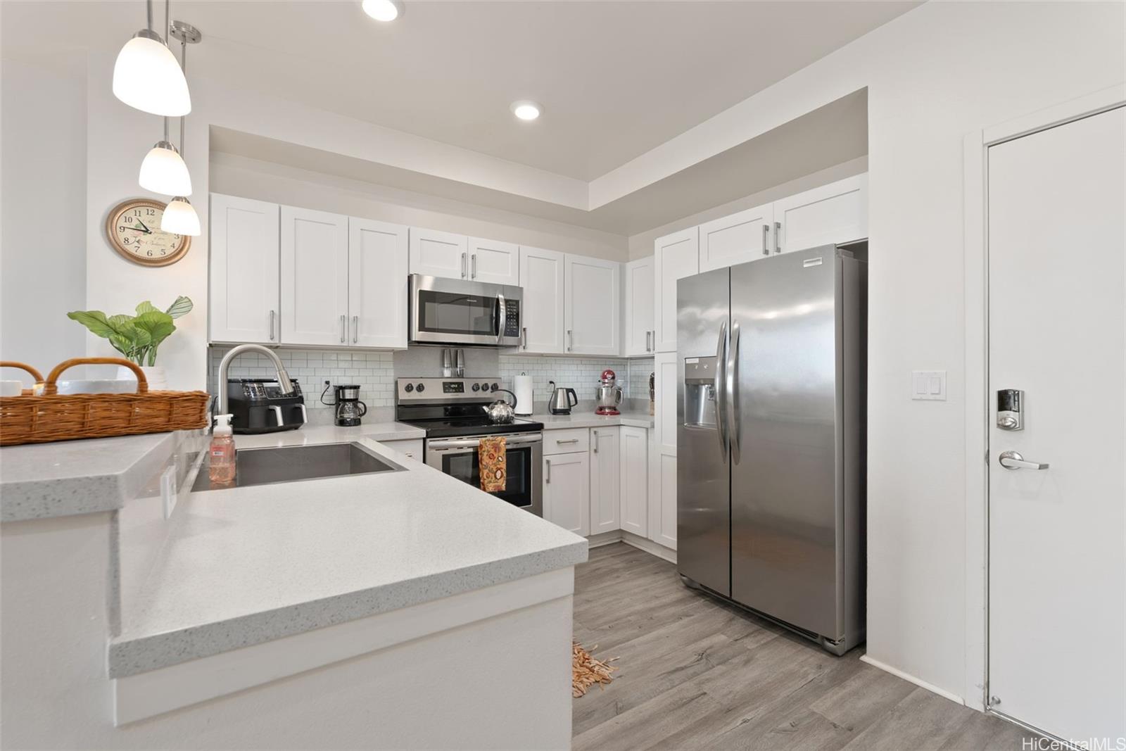 セキュリティ完備の建物内にある、広々とした2ベッドルーム、2バスルームの住宅で、快適なアイランドライフをお楽しみください。各部屋にスプリットエアコンを備え、涼しく快適な空間です。自然光がたっぷり差し込み、ゆったりとくつろげるラナイでゆったりとおくつろぎいただけます。フルサイズの洗濯機と乾燥機、Bluetooth接続対応のスマートホームシステム、そしてキーレスエントリーを備え、快適な毎日をお過ごしいただけます。指定駐車スペース2台分付き。ハワイ大学ウェストオアフ校、鉄道駅、カ・マカナ・アリイにも近く、ショッピング、お食事、エンターテイメントに大変便利です。さらに、近隣のソーホー・コミュニティセンターもご利用ください。コミュニティセンターは、地域の人々と交流を深めるのに最適な場所です。