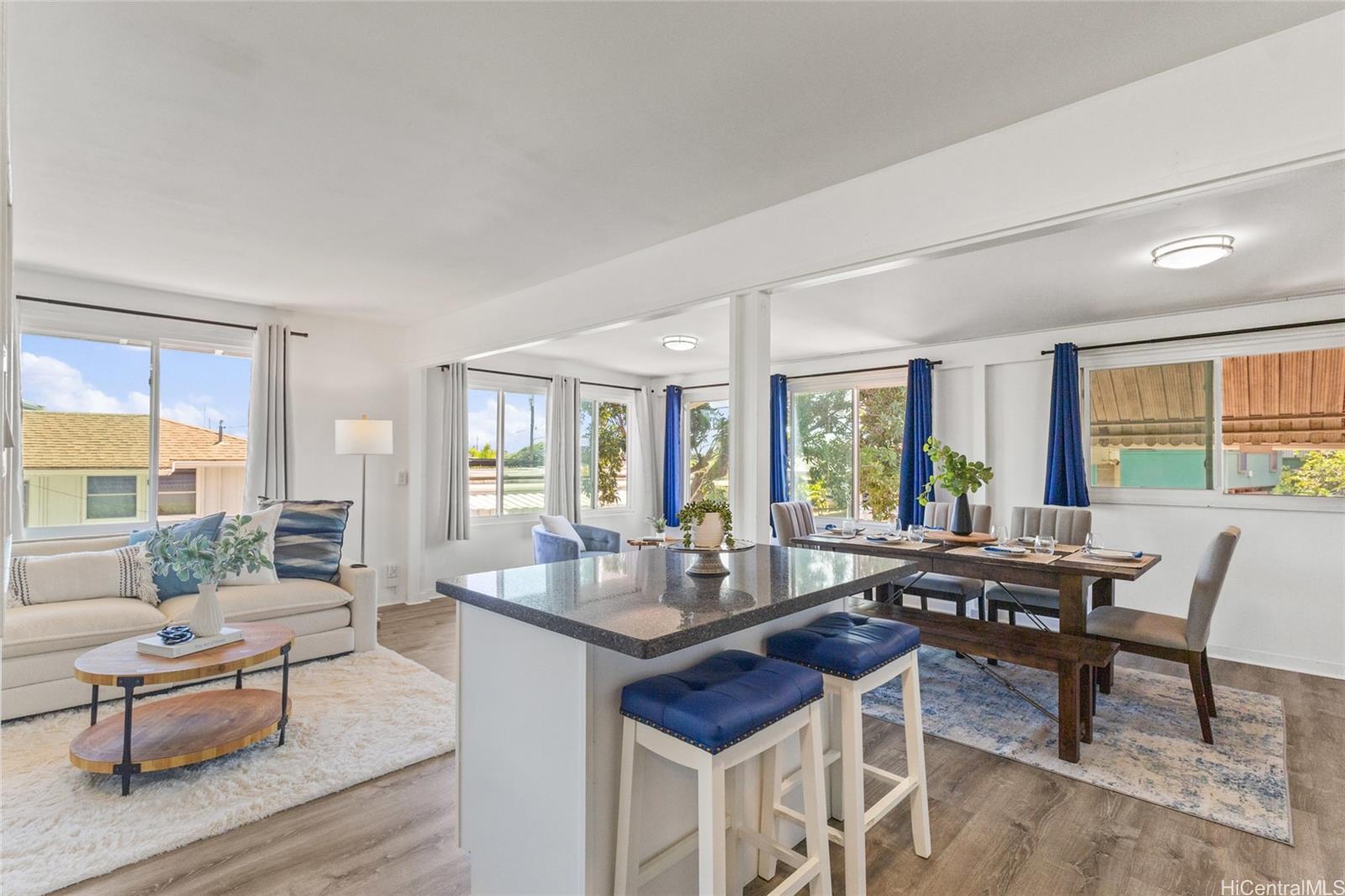 Discover this beautifully remodeled 3-bedroom, 2-bath home with a flexible recreation room, perfectly situated in the heart of Pearl City. The open-concept layout features a bright living area that flows seamlessly into the modern kitchen, complete with sleek cabinetry, quartz countertops, and stainless steel appliances. Both bathrooms have been stylishly updated with contemporary finishes and fixtures. Double-pane windows enhance comfort and efficiency throughout. Step outside to a covered patio, ideal for outdoor dining or entertaining. A two-car carport provides convenient parking and additional storage. Located just minutes from Pearl Highlands, Pearlridge Center, and freeway access, this home offers the perfect balance of modern living and everyday convenience.
