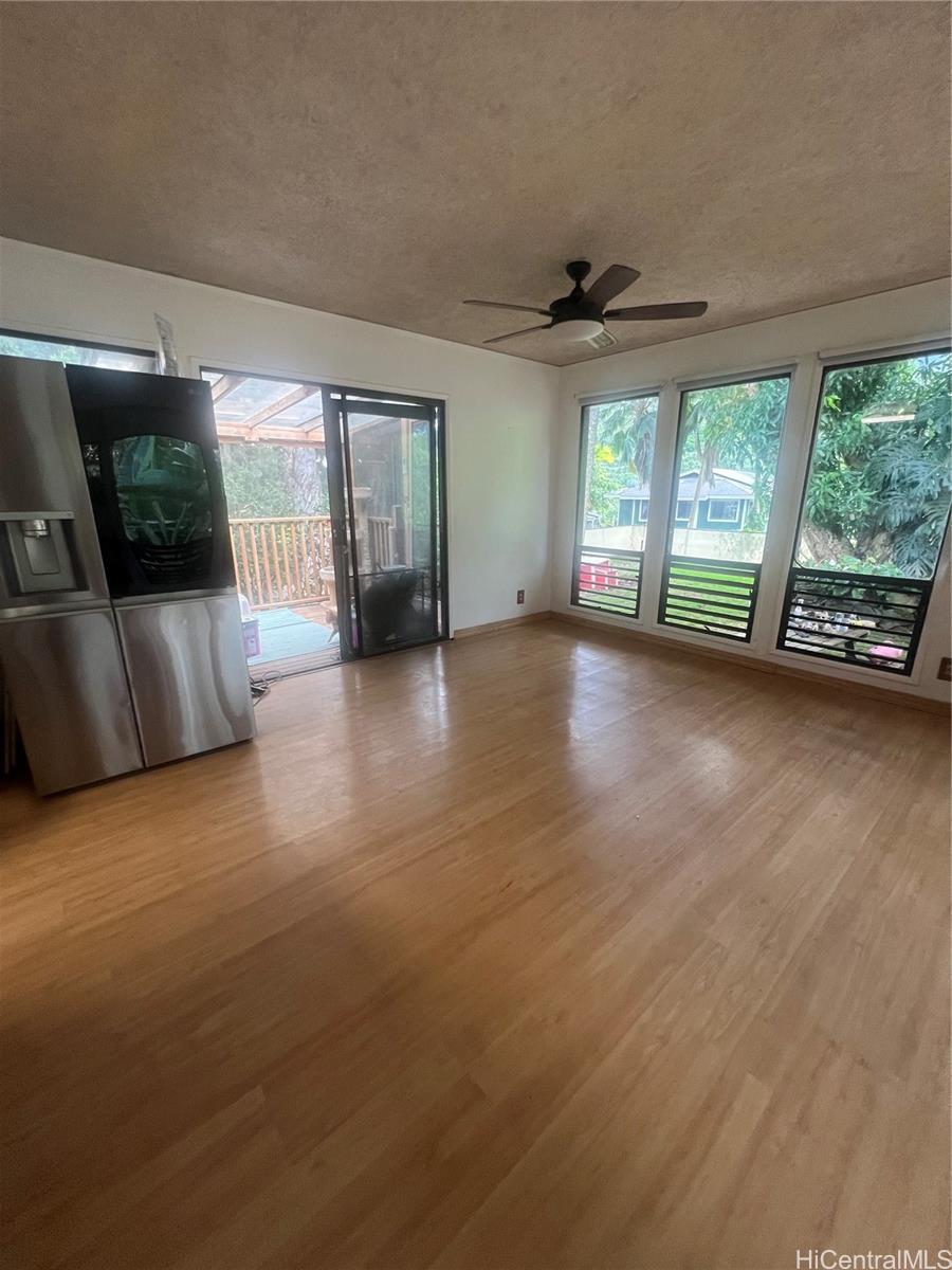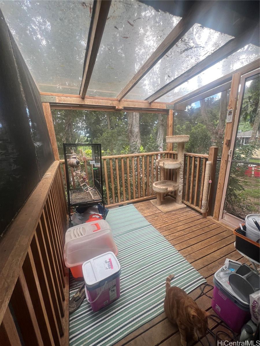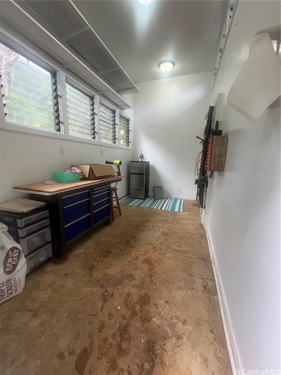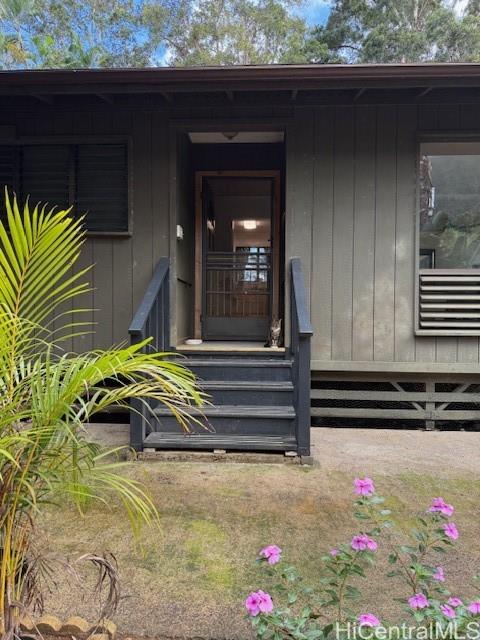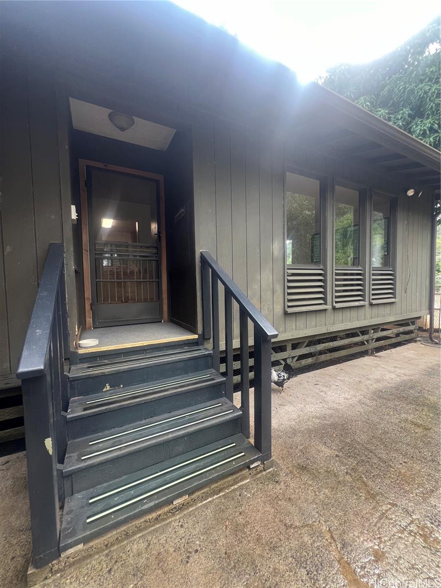 Welcome home to a 3 bedroom, 2 bath, 1200 sq ft home in Ahuimanu, Kaneohe. This home features laminate flooring, ceramic tile in kitchen and vinyl flooring in bathrooms. Spacious open floor plan for the living room, dining room and kitchen. The 3 bedrooms and 2 bathrooms are located down the hallway along with the washer and dryer. There is an enclosed screened patio which is currently used for her cats and can be used as a relaxing area to read the paper while enjoying a cup of tea. A spacious room attached to the garage can be used for an office, art studio, or workshop. Over 10,000 sq ft of land overlooks the majestic Ko'olau Mountains including seasonal waterfalls, lush trees and green grass. Enjoy peaceful country living yet only minutes away from shopping centers and Kaneohe town.