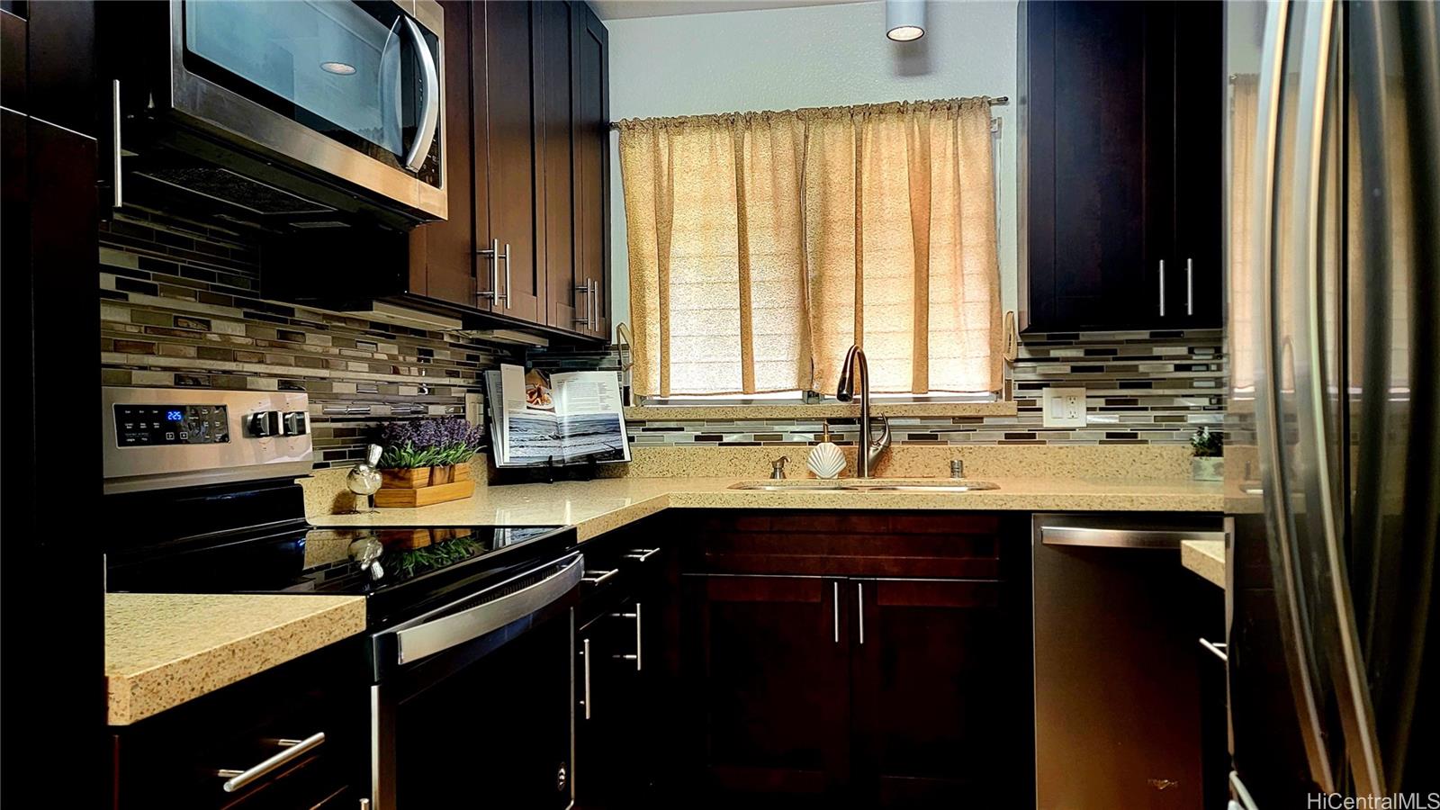 Move right into this beautifully remodeled, turnkey 2-bedroom, 2-bath single level townhome located in the highly desirable Waiau Garden Villa community of Pearl City. This pet friendly unit features an open and inviting floor plan with quartz countertops, tile and luxury vinyl flooring throughout. The beautifully designed and highly functional kitchen offers ample counter and cabinet space with stainless appliances. Enjoy the convenience of a full size washer and dryer, windows, AC, ceiling fans, modern fixtures, and water heater. Enjoy the evening breezes on your private lanai off of your primary living area. Conveniently located near shopping, grocery, dining, schools, parks, military bases, and easy access to freeway on and off ramps.