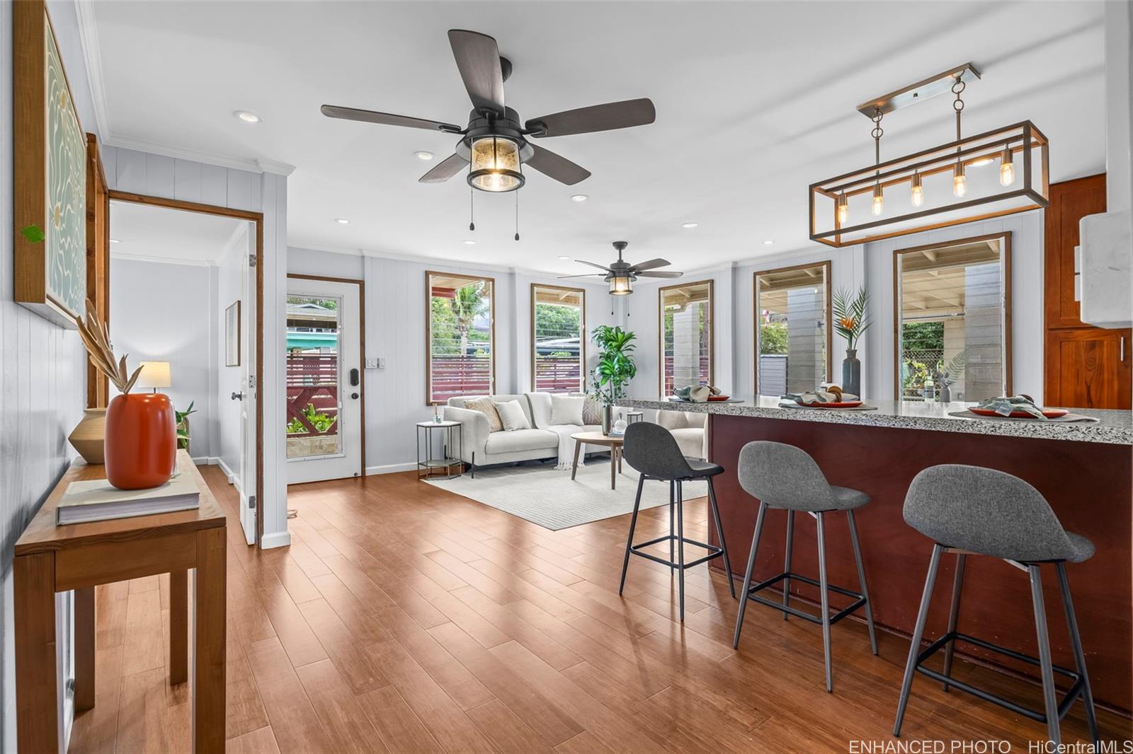 Welcome to this charming 3-bedroom, 1-bath home with attached 420sqft guest suite (studio/1bath) in the heart of Ma'ili, where island living meets everyday comfort. Thoughtfully maintained with many upgrades, this residence features an open and airy layout filled with natural light and split system A/C throughout the home. Step outside to a fully fenced property with automatic rolling gate to enter a spacious covered carport with enough space to park 4 pick-up trucks. The large lawn and yard is perfect for entertaining, gardening, and relaxing. Behind the main home lies a versatile 400 sq. ft. detached flex space with air conditioning, ideal for a home gym, and office. Recent improvements include AC, photovoltaic panels (2020), and a carport & storage built in 2022. Conveniently located 2 blocks from Nani Kai Beach Park, and the Pu'u O Hulu hiking trail, this home offers both adventure and tranquility. Make this peaceful island retreat on Oahu’s Leeward Coast your next home.