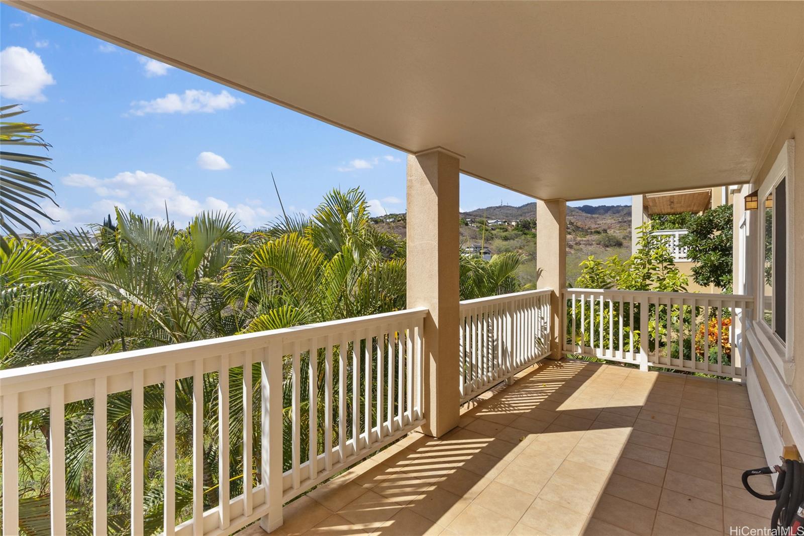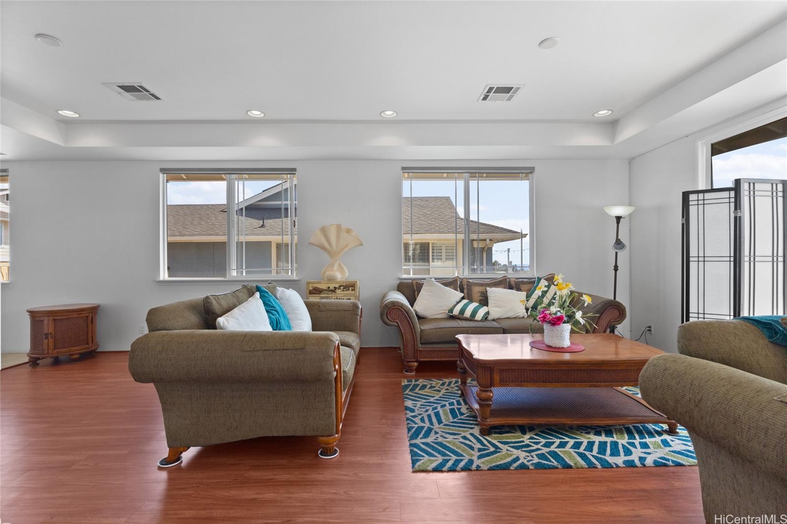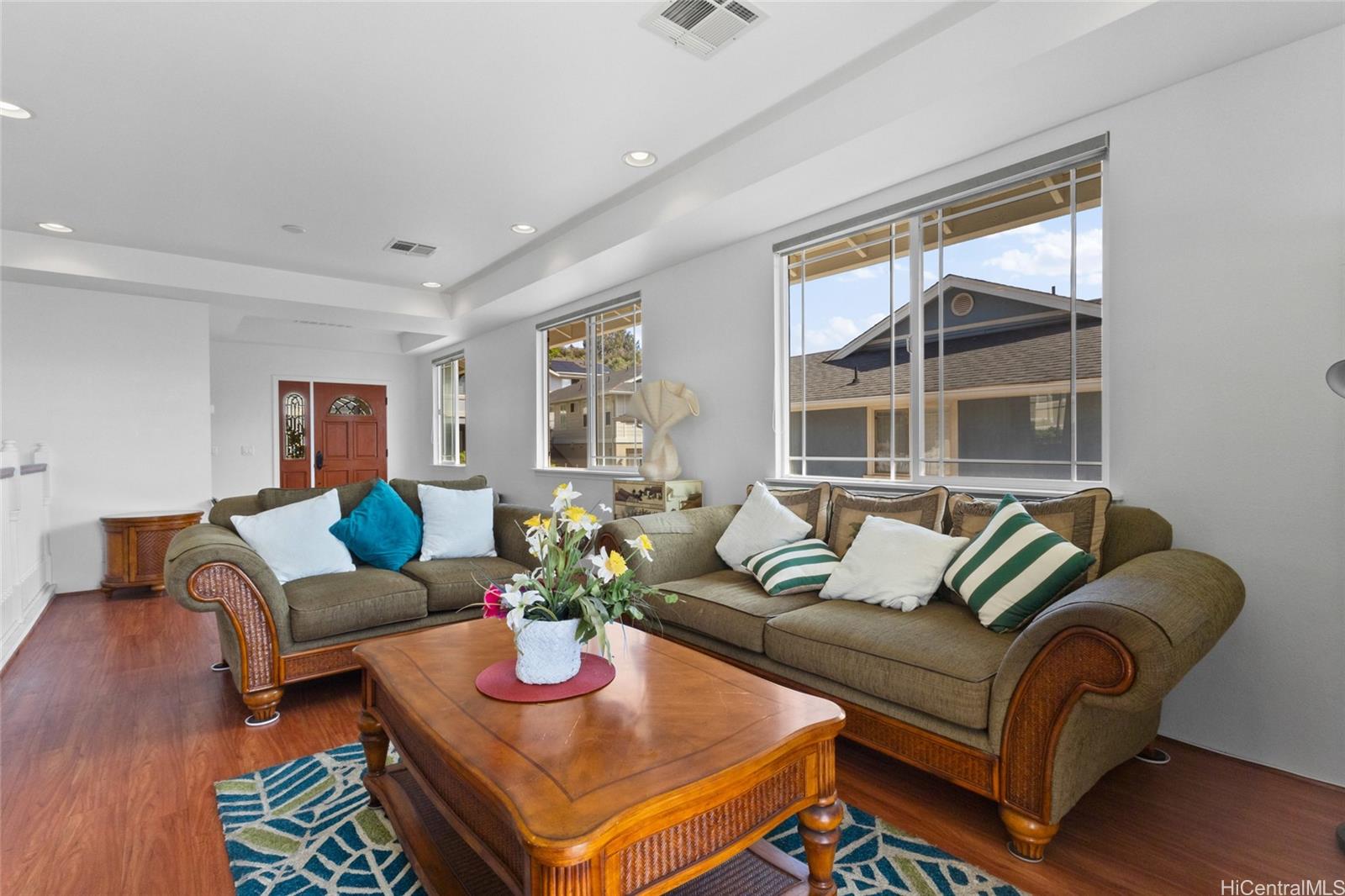 Open Houses 11/22-11/23 2-5PM. First time on the market! This stunning 3-bed, 2.5-bath residence on a sought-after Makakilo rim lot in Hoolu Landing is a rare find, especially with a massive financial bonus: an assumable VA Loan at an incredible 2.25% (PITI approx. $2,695), open to both VA and non-VA buyers! Be instantly greeted by ocean and mountain views visible from two spacious lanais. The upper level features a bright, open-concept layout seamlessly blending the living room, dining area, and huge kitchen—perfect for entertaining. Downstairs, the primary suite offers a walk-in closet, jetted soaker tub, and a private lanai to enjoy the views. 14 owned PV panels keep the electric bill low. Located near the end of a quiet street with guest parking and a large neighborhood park. This is an opportunity you won't want to miss! Current loan balance 509k. Ask about financing for the gap. NO PRIVATE SHOWINGS. OPEN HOUSE ONLY. Maintenance Fee includes landscaping, water, sewer, insurance, road maintenance, utilities for the common areas.