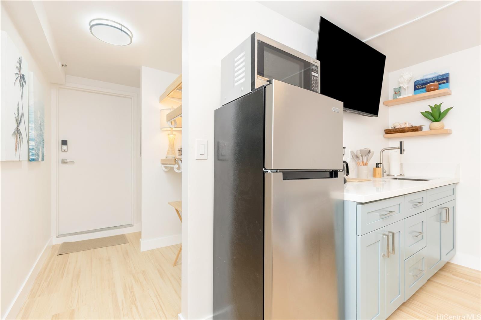 FEE SIMPLE LEGAL VACATION RENTAL with a brand new renovation, fully furnished, and high income short term rental bookings! Experience the center of Waikiki from this stunning Kuhio Village studio with 2 full size beds, new waterproof laminate flooring, quartz countertops, custom cabinetry, full size fridge, wall mounted TV, bathtub with shower, and a large outdoor private lanai. Kuhio Village offers an open air lobby, guest check in options with no extra fees, surfboard & luggage storage, outdoor patio with BBQ grill, basement parking at $2/30 min or $30 overnight, 24hr security, convenience store, and bike rental! Low property tax rate and low monthly maintenance fee includes all utilities so there's no other bills. Located just a block from world-famous Waikiki Beach, this turnkey property offers unbeatable convenience for vacationers or investors alike. Enjoy easy access to beaches, surf breaks, shops, restaurants, and nightlife right outside your door. Perfect as a vacation getaway, second home, or short term rental income-producing investment. Don’t miss this rare opportunity to own a piece of paradise in one of Hawaii's most sought-after destinations in the heart of Waikiki!